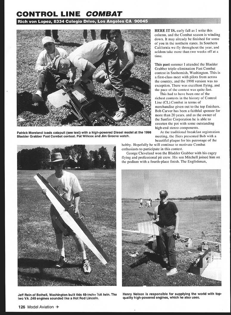 CONTROL LINE COMBAT ~ HERE IT IS early fall write column Combat season winding down may already finished some northern states Southern California fly throughout year seldom take two weeks off time past summer attended Bladder Grabber triple-elimination Fast Combat contest Snohomish Washington first-class meet pilots across country 1998 version no exception excellent flying pace contest quite fast have richest contests history Control Line CL Combat terms merchandise given out top finishers Bob Carver has faithful sponsor 20 years owner Sunfire Corporation able sweeten pot some outstanding high-end stereo components traditional breakfast registration meeting fliers presented Bob beautiful plaque patronage hobby Hopefully will continue motivate Combat enthusiasts participate contest George Cleveland won Bladder Grabber cagey flying professional pit crew son Mitchell joined him podium fourth-place finish Englishman 126 Model Aviation ick Moreland loads catapult see text high-powered Diesel model 1998 Bladder Grabber Fast Combat contest Pat Willcox Jim Greene watch Jeff Rein Bothell Washington built 48-inch 1AA twin two VA 049 engines sounded like Hot Rod Lincoln Henry Nelson responsible supplying world top quality high-powered engines also uses Cowboy Roy Heppenstal best run ever Fast Combat earned second place Grandpa John Salvin shook off some cobwebs managed valuable third-place finish some luck fifth-place result Pacific Northwest seems loaded creative people some would call people too much time hands such person Jeff Rein found time build 48-inch /2A model powered two VA 049s engines fed fuel through common bladder utilizes T fitting fastest thing world certainly eye-catcher makes beautiful sound Another such person Patrick Moreland donates time help judge contest weekend created catapult self-launcher Class Diesel Combat models contraption worthy inclusion Rube Goldberg museum esoteric creations does work goes show four years Gonzaga University education did go waste Mel Lyne bunch Canadians brought out Dieselpowered models lunch-break after-the-contest flying truly slow-motion flying can give newest pilots time correct flying mistakes guys looked having loads fun hurting models down side however aroma diesel fuel ones clothing may get seated local Dennys arrive heavyhanded splash essence diesel Combat pilots too old fly come Bladder Grabber spectate will tell retired because no competition left group includes Dirty Dan Rutherford Gary Stevens Ron Scoones formerly Jive Combat Team Only Howard Rush Phil Granderson seem want wiggle handle anymore may able fit colorful jive shirts clown suits days will still give run money contest just time fly time renew friendships break bread guys share common interest Make plans now 1999 Bladder Grabber usually last weekend June World Championships have come gone F2D world title now belongs guy Ukraine name Alexei Zhelezko second place went Russian Sergei Beliaev third place Igor Milenin Ukraine best finisher US team Richard Stubblefield four wins two losses placing him tie eighth place Ron Marchioni Mark Rudner finished two wins two losses translates tie 17th place bunch other pilots Mike Willcox went 0-2 Junior champion Russian name Alexandr Gusev Mark Rudner fourth Junior category team standings Ukraine first Russia second Belarus third Czech Republic fourth US fifth have told weather awful cold rainy windy good part competition accommodations Prolisok Hotel have upgraded what 1988 World Championships much new way equipment no new killer engines new model designs superior others Mark Rudner bit bad luck Zorro engines blew up toward end match leading piston skirt broke off Results indicate countries former USSR have edge rest world event looks US will need work harder keep pace Bill Maywald has working hard get Fast Combat contest off ground Riverside California did great deal work getting American Youth Soccer Organization fields location contest huge area some 20 well-kept soccer fields Riverside can really hot August fields available However covered picnic area dozen picnic tables contestants used work models rest between matches 12 14 entries sorry memory did store correct number California Arizona great time very relaxed contest Ron Cash finished first place Steve Stewart second Roy Heppenstal third Bill plans host contest other year alternating soon-tu be-revived Money Nats now Whittier Narrows getting watered regularly best shape its history would have least two entries serious accident prevented John Salvin flying Mike Petri came down early Friday proceeded test-fly Whittier Narrows John holding running model somehow slipped rotated back hit him face doing some serious damage nose came out Saturday pain wake-up call us need keep healthy respect equipment times take precautions prevent accidents still see guys needling engine front take couple seconds walk around rear model tune got some new Cyclon PC2 FAI Federation Aeronautique Internationale 15 engines experiment can see engine find information about Zorro Redko engines Goran Olsons Web page Internet first impression Cyclons quite good run fast have seven runs engine write column running mid- high18-seconds-for-eight-laps range head buttons will need set 010-012 range beautifully made engine exceptional quality have never flown FAI Combat models dont know what missing readily available shame dont have just sport-fly serious Combat flier good FAI model will allow sharpen reflexes just plain have fun give out Tomas Mejzliks address regular basis because provides quality products affordable prices again Mejzlik Modellbau Jurkovicova 19 63 800 Brno Czech Republic Europe Tel/Fax 01142-5-529400 Write call catalog Miniature Aircraft Combat Association MACA celebrated its 25th year 1998 quite long run volunteer-operated organization worthwhile join $15 annual dues will give triple enjoyment reading tips build quicker leads find what need Send checks MACA attn Gene Berry 4610 89th St Lubbock TX 79
