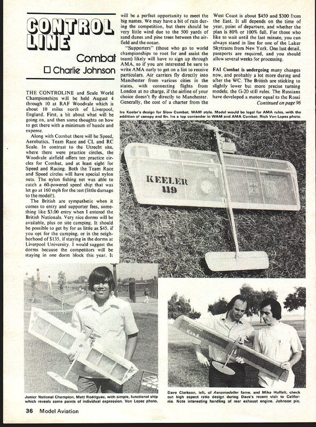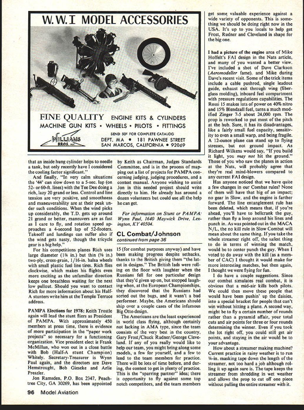 Combat 0 Charlie Johnson THE CONTROLINE Scale World Championships will held August 4 through 10 RAF Woodvale about 10 miles north Liverpool England First bit about what will going some thoughts get minimum hassle expense Along Combat will Speed Aerobatics Team Race CL RC Scale contrast Utrecht site practice circles Woodvale airfield offers ten practice cir cles Combat least eight Speed Racing Both Team Race Speed circles will have special nylon nets nylon fishing net able catch 60-powered speed ship let go 160mph test little damage model British sympathetic comes entry supporter fees some thing like $300 entry entered British Nationals Very nice dorms will available plus site camping should possible get little $45 opt camping neigh borhood $135 staying dorms Liverpool University would suggest dorms because competitors will staying dorm block year will perfect opportunity meet big names may have bit rain dur ing competition should very little wind due 500 yards sand dunes pine trees between air field ocean Supporters go world championships root assist team likely will have sign up through AMA interested sure write AMA early get list receive particulars Air carriers fly directly Manchester various cities states connecting flights London no charge airline choice doesnt fly directly Manchester Generally cost charter West Coast about $450 $300 East depends time year point departure whether plan 80% 100% full like wait until last minute can always stand line Laker Skytrains New York last detail passports required should allow several weeks processing FAT Combat undergoing changes now probably lot during after WC British sticking slightly lower precise turning models G-20 still rules Russians have developed motor equal Rossi Continued page 96 36 Model Aviation Ira Keelers design Slow Combat WAM style Model would legal AMA rules addition canopy fin Ira too contender WAM AMA Combat Rich Von Lopez photo Dave Clarkson left Aeromodeller fame Mike Hoffelt check Junior National Champion Matt Rodriguez simple functional shipout high aspect ratio design during Daves recent visit Califor reveals some points individual expression Von Lopez photonia Note interesting handling rear exhaust engine Johnson pic WWI MODEL ACCESSORIES FINE QUALITY ENGINE KITS & CYLINDERS MACHINE GUN KITS LS TS INGS SEND 5O FOR COMPLETE CATALOG DEPT MA PAWNEE STREET SAN MARCOS CALIFORNIA 9 inside hung cylinder helps needle tank recently have considered cooling factor significant finally very calm situations 44 can slow down 5-sec lap 52- 60-ft lines Tee Dee doing rich lazy 20 grand less Control line tension very positive smoothness maneuverability peak un der such conditions wind picks up considerably TD gets up around 21 grand better maneuvers fast care fly rotation speed ap proaches 4-second lap 52-footers Takeoff landings can suffer also wind gets nasty though tricycle gear big help competitions planes Rich uses large diameter 1 thin two-ply cross-grain 1 / 16-in balsa wheels small plastic fuel line tires Rich flies clockwise makes flights exciting unfamiliar direction keeps breathless waiting next low pullout Should want contact Rich information about HalfA stunters write him Temple Terrace address PAMPA Elections 1978 Keith Trostle again will lead stunt fliers President PAMPA approximately 450 members press time evidence participation paper work projects necessary functioning organization Vice president elect Frank McMillan won out close battle Bob Half-A stunt Champion Whitely Secretary-Treasurer Wynn Paul again directors Dave Hemstrought Bob Gieseke Arlie Preszler Jon Ramsden PO Box 2347 Peach tree City GA 30269 has appointed Keith Chairman Judges Standards Committee process map ping out list projects PAMPA con cerning judging judging procedures contest manual Anyone wishing assist Jon needed project should write directly him already has around dozen volunteers could use help can get information Stunt PAMPA Wynn Paul 1640 Maywick Drive Lex ington KY 40504 CL Combat/Johnson continued page 36 15 combat purposes anyway have making progress despite setbacks thanks British giving lat est designs British lads roll ing floor laughter Russians fell particular design theyd given up stopped laugh ing European Championships discovered Russians sorted out bugs wasnt bad performer Maybe Americans should ship over couple cases infamous Big Otto design Americans least experienced world class flying although certainly lacking AMA type since team consists very best country Gary Frost/Chuck Rudner/George Cleve land really would like help team might bring along some models few yourself few lend team members practice will lots time before dur ing contest get plenty practice sparring partner idea opportunity fly against some top notch competitors team members get some valuable experience against wide variety opponents some thing should doing right now USA Its up locals help get Frost Rudner Cleveland shape big picture engine area Mike Hoffelts FAI design Nats article wanted better view Ive included shot Dave Clarkson Aeromodeller fame Mike during Daves recent visit Some trick items include cable pushrod single leadout guide exhaust exit through wing fiber glass molding inboard fuel compartment pressure regulations capabilities Rossi 15 makes lots power 40% nitro 15% Blendzall fuel turns much mod ified Zinger 7-5 about 24000 rpm prop reworked put pitch hub Sure has its disadvantages like fairly small fuel capacity sensitiv ity small warp being fragile 12-ounce plane can stand up flying stresses ground impact As Richard Wilkens would say build light may hit ground saw planes action Nats will probably agree theyre real mind-blowers compared current FAI design Has anyone noticed have quite few changes Combat rules None will have big impact no gear Slow engine farther forward line entanglement rule has deleted means youre ahead youll have bellcrank guy rather fly 1oop around lines punch As pointed out MACA N/L no kill rule Slow Combat will mean abou
