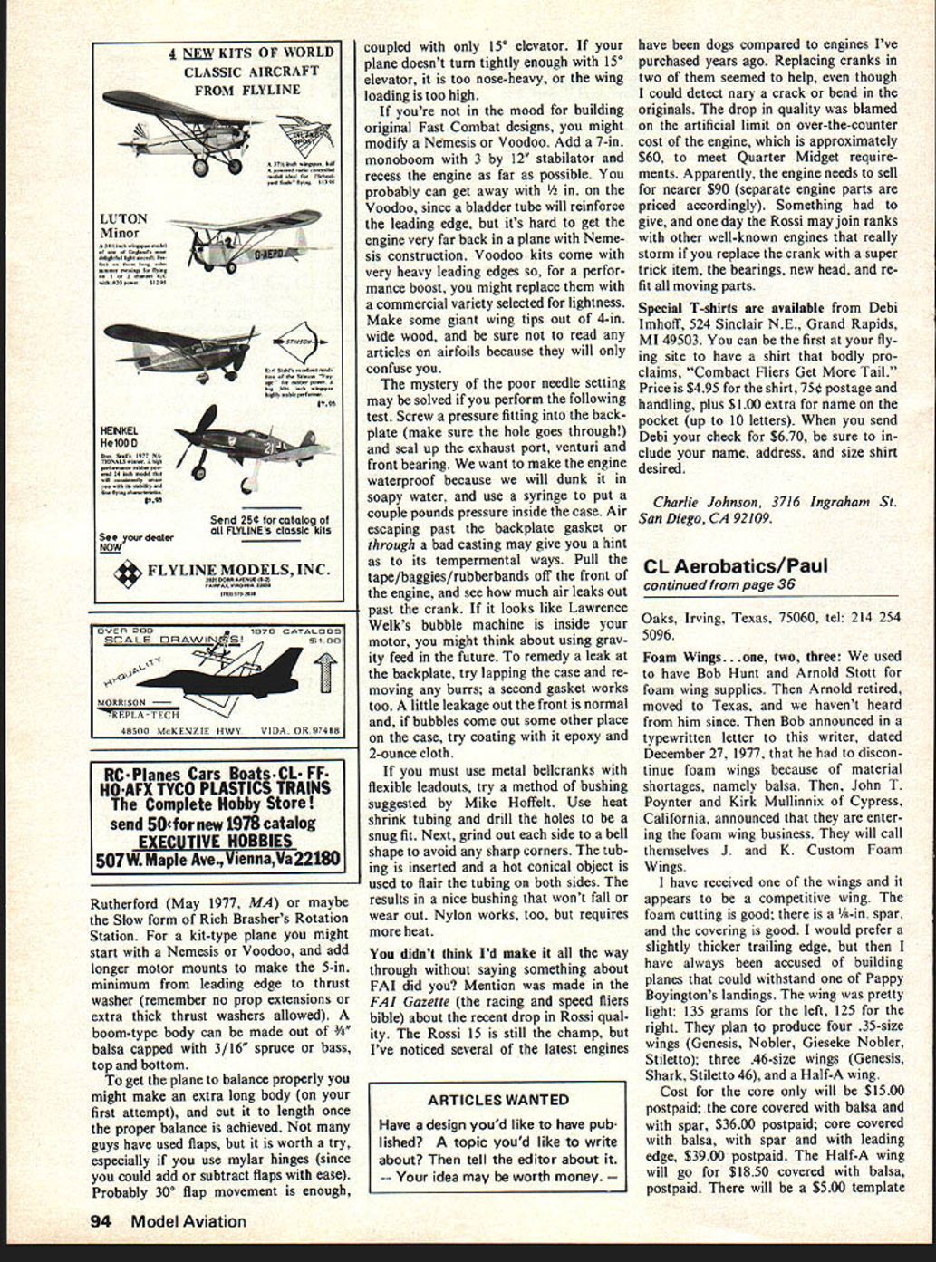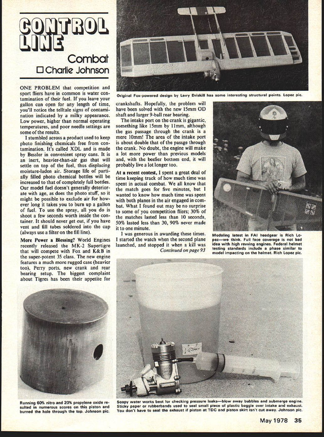 I Combat 0 Charlie Johnson ONE PROBLEM competition sport fliers have common water con tamination fuel leave gallon can open length time youll notice telltale signs contami nation indicated milky appearance Low power higher normal operating temperatures poor needle settings some results stumbled across product used keep photo finishing chemicals free con tamination Its called XDL made Bessler convenient spray cans inert heavier-than-air gas will settle top fuel thus displacing moisture-laden air Storage life parti ally filled photo chemical bottles will increased completely full bottles model fuel doesnt generally deterior ate age does photo stuff might possible exclude air ever long takes burn up gallon fuel use spray shoot few seconds worth inside con tainer should never get out have vent fill tubes soldered cap always use filter fill line Power Blessing World Engines recently released MK-2 Supertigre will compete Fox K&B super-potent 35 class new engine features much rugged case heavier too Perry ports new crank rear bearing setup biggest complaint about Tigres has appetite crankshafts Hopefully problem will have solved new 15mm OD shaft larger 9-ball rear bearing intake port crank gigantic something like 15mm 11mm although gas passage through crank mere 10mm area intake port about double passge through crank No doubt engine will make lot power previous models beefier bottom end will probably live lot longer too recent contest spent great deal time keeping track much time spent actual combat know match goes five minutes wanted know much time spent both planes air engaged com bat What found out may no surprise some competition fliers 30% matches lasted less 10 seconds 50% lasted less 30 90% never made minute generous awarding times started watch second plane launched stopped kill Continued page 93 May1978 35 Original Fox-powered design Larry Driskill has some interesting structural points Lopez pic Modeling latest FAI headgear Rich Lo pezwe think Full face coverage bad idea high revving engines Federal helmet testing standards include phase similar model impacting helmet Rich Lopez pic Running 60% nitro 20% propylene oxide re sulted numerous scores piston burned hole through top Johnson pic Soapy water works best checking pressure leaksWow away ouooies ana suomerge engine Sticky paper rubberbands used seal small piece plastic baggie over intake exhaust dont have seal exhaust piston TOC piston skirt isnt cut away Johnson plc rN DU-BRO SNAP-ON LINKS BOLT-ON LINK 3-piece ball link set No180 must helicopters readily adaptable rudder elevator servo linkage RIC planes boats cars Ball joint action eliminates binding neat clean appearance OnlV 85C TOUGH NYLON LINK SNAPS-ON AND HOLDS TIGHT TAKES CARE OF ANY MISALIGNMENT THREADED LINK MAKES5-Pieceball link set No 181 THROTTLEexcellent off-set steering eHOOK-UPSthrottle servo hookups EASY IIncludes steel ball assembly /2-56 thread washer nut threaded coupler nylon ball link Easily adjustable Only 85C 4 DUBRO PRODUCTS / INC BONNER ROAD DUWAUCON DA ILL 60084 cant have cabin detail say judges arent give points guy wants take Nobler paint like Mus tang thats business same token want take Sigs Cub kit end up model looks like original flies like shouldbut does conform scale sizes etcthats business Weve spent months building models rule book its imperative its used bother building dont need rules just competent judging Besides no body ever said idea event give away trophies anybody thinks should have build rules fly rules youll probably win rules youre ready accept dont enter event last thought lest think bunch screamers down take punch learn think Dick stated very well several important points Anyone competes competitive event based human subjective judging can relate Dicks experiences Perfect judging ideal strive usually dont achieve Its simple fact life dif ferent people see things differently com petitor must learn accept basic fact winners know follow rule book letter demand others same Only will see improvement judging Luckily singled out examples questionable judging have seldom discouraged true competitor Thanks Sport Scale noticing steady increase participation CL Scale flying contests Scale Grapevine.. Dont forget deadline submitting AMA rules change proposals next cycle Sept 1 1978 procedure making proposal noted Feb 78 Model Aviation. Combined CL FF RC Scale contests may catching three scale categories being included St Louis Scale Fly-In held July 2 1978 site will probably Buder Park according Bob Underwood 4109 Concord Oaks Dr St Louis MO 63128 can furnish details. veland Prop Busters busy catchy idea sounds like fun Quoting Dick Ruckel again Take scale drawing magazine like Model viat ion spread build profileto size Mount 010 have ball have carrier hook Mike Gretz Box 162 Montezuma IA 50171 CL Combat/Johnson continued page 35 PIN ROTATES 900 BY 4TH LINE SPRING LOADED FOR RETURN SLOT IN BOMB OR DROP TANK Released Ray Smiths Bomb-Drop Pin operated fourth line simplifies dropping bombs drop tanks made or both planes hit ground Ive lot non-flying friends tell like watch combat re marked took long get match ready have end quickly won der theyd like have spent six hours building plane destroyed badly damaged 35% matches Mick Tiernan excellent article January 1978 issue AeroModeller commenting sad state combat Europe youre wondering Mick Tiernan let say hes won British Nationals probably four five best FAI pilots world Mick admits being old school combat planes went slower lasted long time did matches Theres slow escalation USA Europe radical change two years ago 70-mph diesels 90-100-mph glows current breed horsepower motors has enabled rankest beginner ac quire means 120-mph model held under control 60-mph skill re flexes What easy build Slow Combat ship like scratch-build ship Id suggest Cheater Slow Dan May1978 93 U Rutherford May 1977 MA maybe Slow form Rich Brashers Rotation Station kit-type plane might start Nemesis Voodoo add longer motor