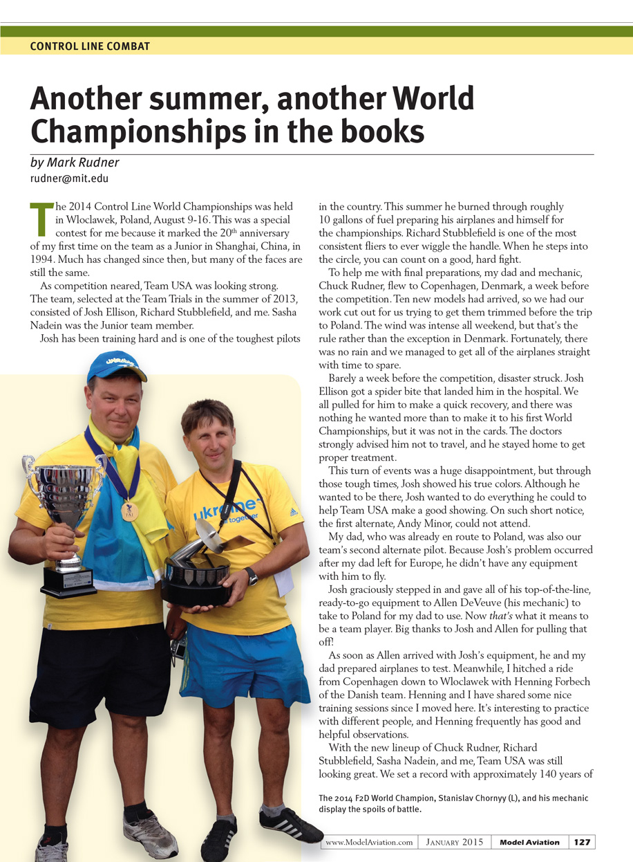 This year the Control Line World Championships were held in Wloclawek, Poland, August 9-16. This was a special contest for me because it marked the 20th anniversary of my first time on the team as a Junior in Shanghai, China, in 1994. Much has changed since then, but many of the faces are still the same.