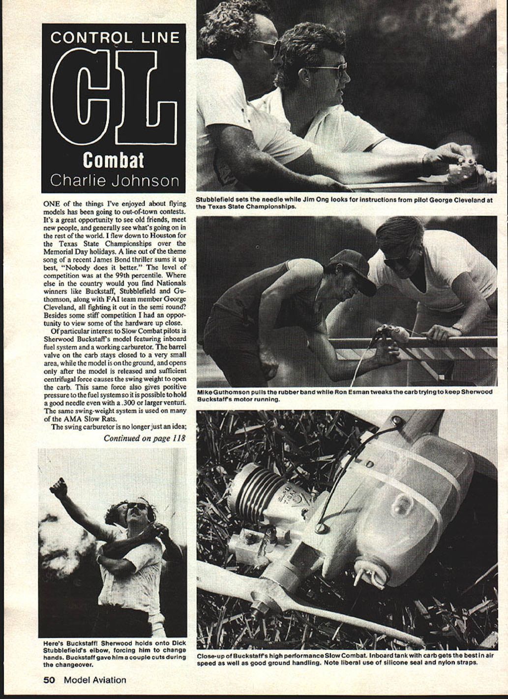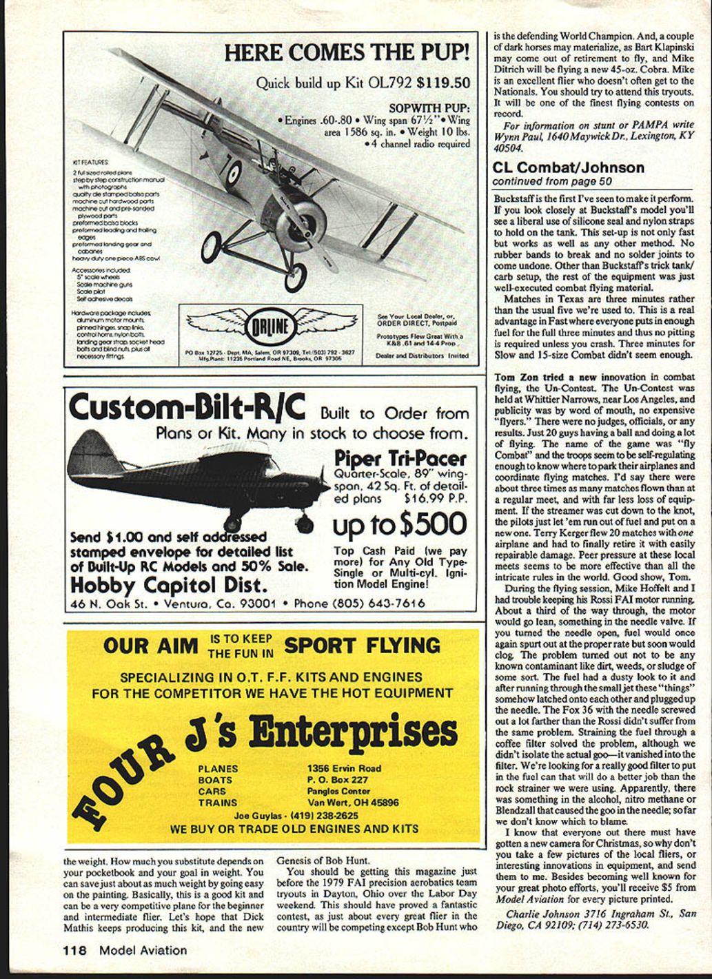 ONE things Ive enjoyed about flying models has going out-of-town contests Its great opportunity see old friends meet new people generally see whats going rest world flew down Houston Texas State Championships over Memorial Day holidays line out theme song recent James Bond thriller sums up best Nobody does better level competition 99th percentile else country would find Nationals winners like Buckstaff Stubblefield Gu thomson along FAI team member George Cleveland fighting out semi round Besides some stiff competition oppor tunity view some hardware up close particular interest Slow Combat pilots Sherwood Buckstafls model featuring inboard fuel system working carburetor banel valve carb stays closed very small area model ground opens after model released sufficient centrifugal force causes swing weight open carb same force also gives positive pressure fuel system possible hold good needle 300 larger venturi same swing-weight system used AMA Slow Rats swing carburetor no longer just idea Continued page 118 50 Model Aviation Stubblefield sets needle Jim Ong looks instructions pilot George Cleveland Texas State Championships s uuthomson puiis sne rubber Dana wniie ijon usman xweas carmrying keep nerwoou Buckstaff motor running Heres Sherwood holds onto DICK Stubblefields elbow forcing him change hands Buckstaff gave him couple cuts duringClose-up Buckstaffs high performance Slow Combat Inboard tank carb gets b changeoverspeed well good ground handling Note liberal use silicone seal nylon straps Kit FEATUPKS Slot sued toted p10-is step step construction manss photographs Clsiahty dIe stamped balsa parts roachne cut hardwood ports rnachrw cut pro-sanded phsuood pads pwtosnned Patio blocks preformed inacing troilig edgeS ceetamied lancing gear ccdsanes heavy duty piece ABS cowl Accessaises included 5 scale wheels Scale machoe gorts Scale plot Selt adhesIve decals l-lodware package includeS dIrniream motor sniOrints pelised Nnges strap Inks cantral hams nylon bats addIng gear strap socket head balts blInd nuts pkjs ot necestasy IttlIngs Mni 0R97309 5 503 92 362 MdO dOC Banls 099360 CustomDiItRIC Plans Kit See Veer Local Dealer ORDER DtRECT Postpaid Prototypes Flew dreas K&R 61 14-4 Prep DenIer end Distriboter Invited Order stock choose Piper TriPocer Quarter-Scale 89 wing span 42 Sq Ft detail ed plans $1699 PP sei upto$500 stampd envlop detalI list Top Cash Paid pay Built-Up RC Modils 50% Sal. Any Old TypeSingle Multi-cyl Igni Hobby Capitol Dist tion Model Engine 46 N Oak St ura Ca 93001 e 805 643-7616 OUR AIMKEEP THE FUN IN SPORT FLYING SPECIALIZING IN OT FF KITS AND ENGINES FOR THE COMPETITOR WE HAVE THE HOT EQUIPMENT 1 prises 4$ PLANES 1356 Ervin Baud BOATS PO Box 227 CARS Pangl Canes TRAINS Van Wwt OH 4U6 4 Jo Guyla -1419 239-2625 WE BUY OR TRADE OLD 0IGINES AND KITS weight much substitute depends pocketbook goal weight can save just about much weight going easy painting Basically good kit can very competitive plane beginner intermediate flier Lets hope Dick Mathis keeps producing kit new Genesis Bob Hunt should getting magazine just before 1979 FAI precision aerobatics team tryouts Dayton Ohio over Labor Day weekend should have proved fantastic contest just about great flier country will competing except Bob Hunt defending World Champion couple dark horses may materialize Bart Klapinski may come out retirement fly Mike Ditrich will flying new 45-ox Cobra Mike excellent flier doesnt often get Nationals should try attend tryouts will finest flying contests record information stunt PAMPA write Wynn Paul l640MaywickDr Lexington KY 40504 CL Combat/Johnson continued page 50 Buckstaff first Ive seen make perform look closely Buckatafls model youll see liberal use silicone seal nylon straps hold tank set-up fast works well other method No rubber bands break no solder joints come undone Other Buckstafls trick tank carb setup rest equipment just well-executed combat flying material Matches Texas three minutes rather usual five used real advantage Fast everyone puts enough fuel full three minutes thus no pitting required unless crash Three minutes Slow 15-size Combat didnt seem enough Tom Zen tried new innovation combat flying Un-Contest Un-Contest held Whittier Narrows near Los Angeles publicity word mouth no expensive flyers no judges officials results Just 20 guys having ball doing lot flying name game fly Combat troops seem self-regulating enough know park airplanes coordinate flying matches rd say about three times matches flown regular meet far less loss equip ment streamer cut down knot pilots just let em run out fuel put new Terry Kerger flew 20 matches airplane finally retire easily repairable damage Peer pressure local meets seems effective intricate rules world Good show Tom During flying session Mike Hoffelt trouble keeping Rossi FM motor running About third way through motor would go lean something needle valve turned needle open fuel would once again spurt out proper rate soon would clog problem turned out known contaminant like dirt weeds sludge some sort fuel dusty look after running through small jet things somehow latched onto other plugged up needle Fox 36 needle screwed out lot farther Rossi didnt suffer same problem Straining fuel through coffee filter solved problem although didnt isolate actual gooit vanished ifiter looking really good filter put fuel can will better job rock strainer using Apparently something alcohol intro methane Blendzall caused goo needle far dont know blame know everyone out must have gotten new camera Christmas dont take few pictures local fliers interesting innovations equipment send Besides becoming well known great photo efforts youll receive $5 Model Aviation picture printed Charlie Johnson 3716 Ingraham St San Diego CA 92109 714 273-6530 118 Model Aviation HERE COMES THE PUP Quick build up Kit 0L792 $1 19n50