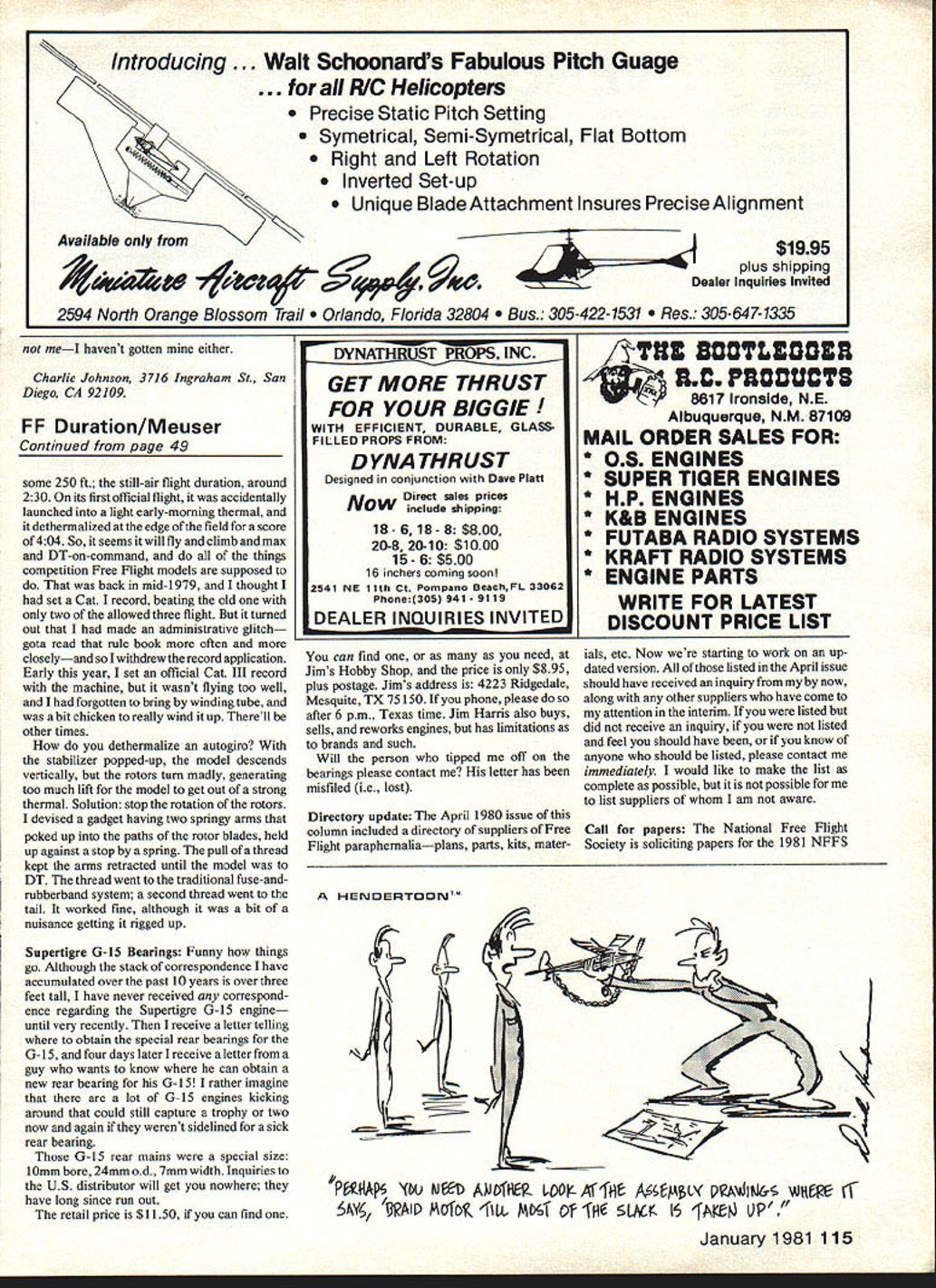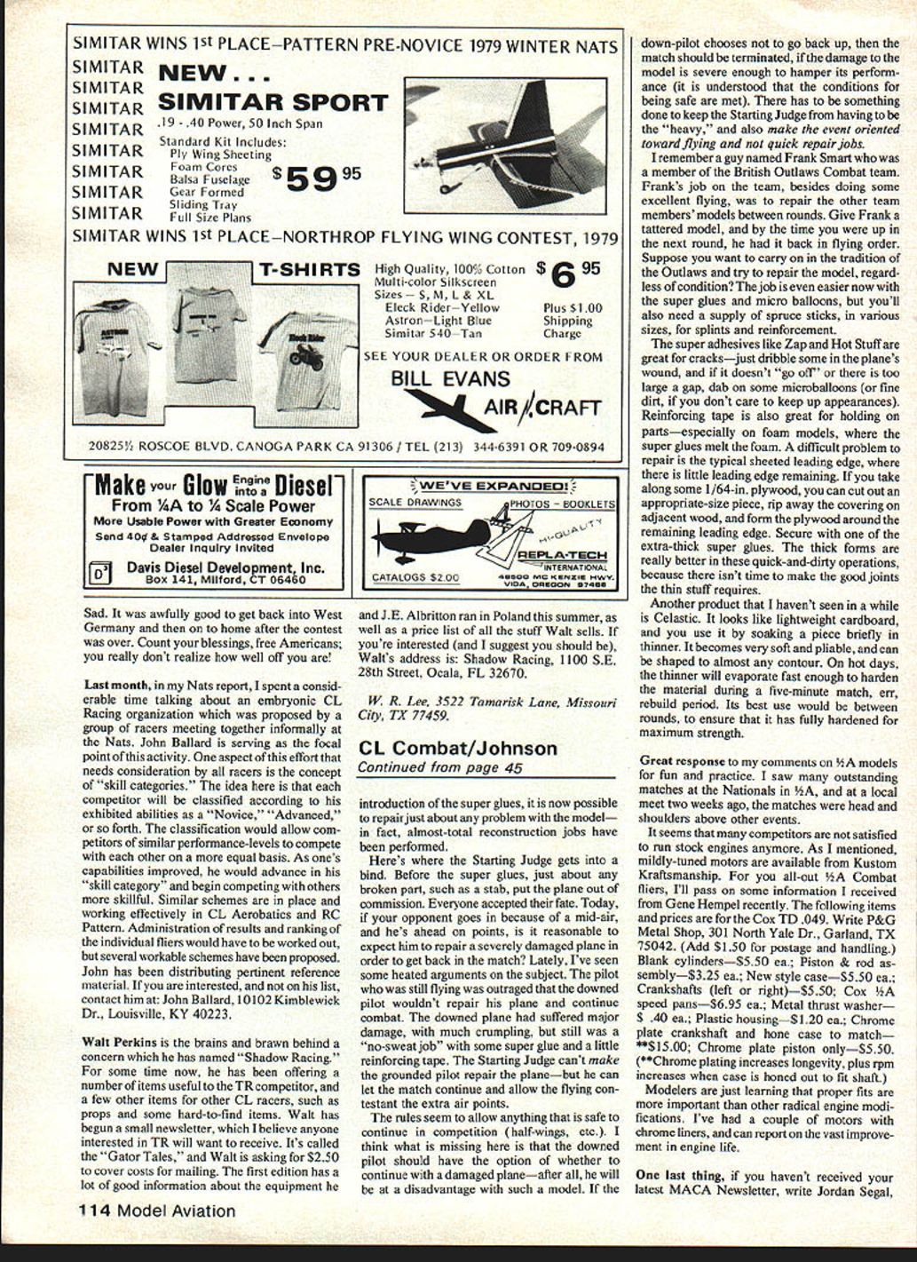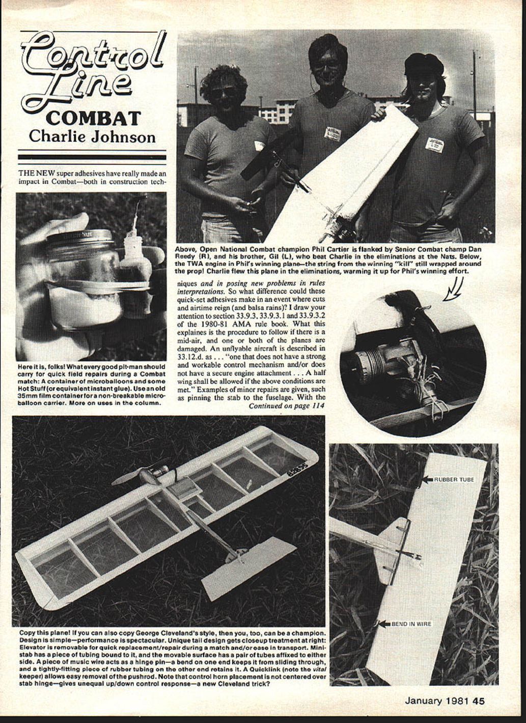 x7 COMBAT Charlie Johnson THE NEW super adhesives have really made impact Combatboth construction tech niques posing new problems rules interpretations So what difference could quick-set adhesives make event cuts airtime reign balsa rains draw attention section 3393 33931 33932 1980-81 AMA rule book What explaines procedure follow mid-air both planes damaged An unflyable aircraft described 3312d ethatdoesnothaveastrong workable control mechanism and/or does have secure engine attachment f wing shall allowed above conditions met Examples minor repairs given such pinning stab fuselage Continued page 114 Above Open National Combat champion Phil Cartier flanked Senior Combat champ Dan Reedy RI brother Gil LI beat Charlie eliminations Nats Below TWA engine Phils winning planethe string winning kill still wrapped around prop Charlie flew plane eliminations warming up Phils winning effort 2 January 1981 45 ncr is folks wnax everygooa pit-man snouja carry quick field repairs during Combat match container microballoons some NotStuff orequivalentinstantgluel Useanold 35mm film containerfora non-breakable microballoon carrier uses column iupy 1fl15 piane ir can aiso copy ueorge Lleveianas style tnen too can champion Design simpleperformance spectacular Unique tail design gets closeup treatment right Elevator removable quick replacement/repair during match and/or ease transport Ministab has piece tubing bound movable surface has pair tubes affixed either side piece music wire acts hinge pina bend end keeps sliding through tightly-fitting piece rubber tubing other end retains Quicklink note vital keeperl allows easy removal pushrod Note control horn placement centered over stab hingegives unequal up/down control responsea new Cleveland trick NEW. SIMITAR WINS 1St PLACEPATTERN PRE-NOVICE 1979 WINTER NATS SI MI TAR SI MI TAR SIMITAR SIMITAR SPORT SIMITAR 19 40 Power 50 Inch Span Standard Kit Includes SIMITARPly Wing Sheeting Foam Core SIMITARBalsa Fuse age 995 SIMITARGear Formed Sliding Tray SIMIlARFull Size Plans SIMITAR WINS 1St PLACENORTHROP FLYING WING CONTEST 1979 T-SHIRTS High Quality 100% Cotton $ ulti-color Silkscreen Sizes L & XL Eleck RiderYellow AstronLight Blue Simitar 540Tan SEE YOUR DEALER OR ORDER FROM BILL EVANS AIR/CRAFT 20825 ROSCOE BLVD CANOGA PARK CA 91306/ TEL 213 344-6391 OR 709-0894 Make Glow Engine Dieser 14A 1/4 Scale Power Usable Power Greater Economy Send 40 & Stamped Addressed Envelope Dealer InquIry InvIted ___ Davis Diesel Development Inc Box 141 Milford CT 06460 Sad awfully good get back West Germany home after contest over Count blessings free Americans really dont realize well off Last month Nats report spent consid erable time talking about embryonic CL Racing organization proposed group racers meeting together informally Nats John Ballard serving focal point activity aspect effortthat needs consideration racers concept skill categories idea competitor will classified according exhibited abilities Novice Advanced forth classification would allow com petitors similar performance-levels compete other equal basis As ones capabilities improved would advance skill category begin competing others skillful Similar schemes place working effectively CL Aerobatics RC Pattern Administration results ranking individual fliers would have worked out several workable schemes have proposed John has distributing pertinent reference material interested list contact him John Ballard 10102 Kimblewick Dr Louisville KY 40223 Walt Perkins brains brawn behind concern has named Shadow Racing some time now has offering number items useful TR competitor few other items other CL racers such props some hard-to-find items Walt has begun small newsletter believe anyone interested TR will want receive Its called Gator Tales Walt asking $250 cover costs mailing first edition has lot good information about equipment JE Albritton ran Poland summer well price list stuff Walt sells re interested suggest should Walts address Shadow Racing 1100 SE 28th Street Ocala FL 32670 W R Lee 3522 Tamarisk Lane Missouri City TX 77459 CL Combat/Johnson Continued page 45 introduction super glues now possible repair just about problem model fact almost-total reconstruction jobs have performed Heres Starting Judge gets bind Before super glues just about broken part such stab put plane out commission Everyone accepted fate Today opponent goes because mid-air hes ahead points reasonable expect him repair severely damaged plane order get back match Lately Ive seen some heated arguments subject pilot still flying outraged downed pilot wouldnt repair plane continue combat downed plane suffered major damage much crumpling still no-sweat job some super glue little reinforcing tape Starting Judge cant make grounded pilot repair planebut can let match continue allow flying con testant extra air points rules seem allow anything safe continue competition half-wings etc think what missing downed pilot should have option whether continue damaged planeafter will disadvantage such model Plus $100 Shipping Charge down-pilot chooses go back up match should terminated damage model severe enough hamper its perform ance understood conditions being safe met has something done keep Starting Judge having heavy also make event oriented toward flying quick repair jobs remember guy named Frank Smart member British Outlaws Combat team Franks job team besides doing some excellent flying repair other team members models between rounds Give Frank tattered model time up next round back flying order Suppose want carry tradition Outlaws try repair model regard less condition job easier now super glues micro balloons youll also need supply spruce sticks various sizes splints reinforcement super adhesives like Zap Hot Stuff great cracksjust dribble some planes wound doesnt go off too large gap dab some microbalboons fine dirt dont care keep up appearances Reinforcing tape also great holding partsespecially foam models super glues melt foam difficult problem