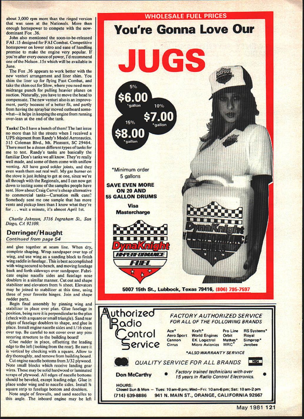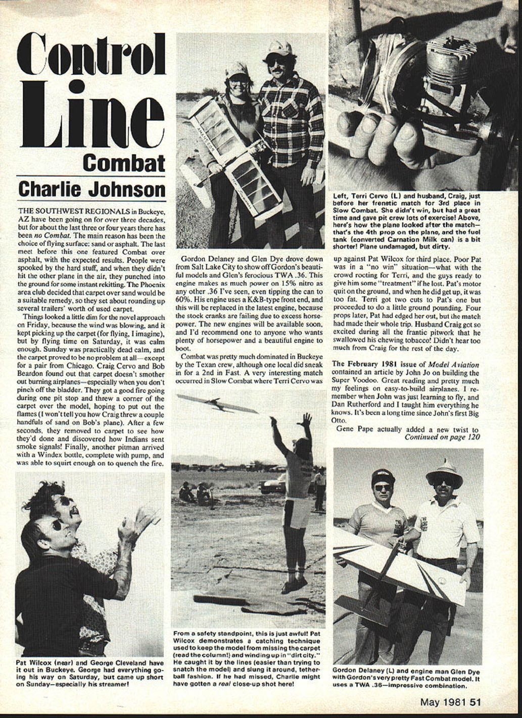CoRErol S iIM Combat Charlie Johnson THE SOUTHWEST REGIONALS Buckeye AZ have going over three decades about last three four years has no Combat main reason has choice flying surface sand asphalt last meet before featured Combat over asphalt expected results People spooked hard stuff didnt hit other plane air punched ground some instant rekitting Phoenix area club decided carpet over sand would suitable remedy set about rounding up several trailers worth used carpet Things looked little dim novel approach Friday because wind blowing kept picking up carpet flying imagine flying time Saturday calm enough Sunday practically dead calm carpet proved no problem allexcept pair Chicago Craig Cervo Bob Beardon found out carpet doesnt smother out burning airplanesespecially dont pinch off bladder got good fire going during pit stop threw corner carpet over model hoping put out flames wont tell Craig threw couple handfuls sand Bobs plane After few seconds removed carpet see theyd done discovered Indians sent smoke signals Finally another pitman arrived Windex bottle complete pump able squirt enough quench fire Gordon Delaney Glen Dye drove down Salt Lake City show off Gordons beauti ful models Glens ferocious TWA 36 engine makes much power 15% nitro other 36 Ive seen tipping can 60% engine uses K&B-type front end will replaced latest engine because stock cranks failing due excess horse power new engines will available soon Id recommend anyone wants plenty horsepower beautiful engine boot Combat pretty much dominated Buckeye Texan crew although local did sneak 2nd Fast very interesting match occurred Slow Combat Tern Cervo up against Pat Wilcox third place Poor Pat no win situationwhat crowd rooting Tern guys ready give him some treatment lost Pats motor quit ground did getup too fat Tern got two cuts Pats proceeded little ground pounding Four props later Pat edged Out match made whole trip Husband Craig got excited during frantic pitwork swallowed chewing tobacco Didnt hear too much Craig rest day February 1981 issue Model Aviation contained article John Jo building Super Voodoo Great reading pretty much feelings easy-to-build airplanes re member John just learning fly Dan Rutherford taught him everything knows Its longtime since Johns first Big Otto Gene Pape actually added new twist Continued page 120 May1981 51 LCt runE tUJVU IIUUC,U jUL before frenetic match 3ru puuie Slow Combat didnt win great time gave pit crew lots exercisel Above heres plane looked after match thats 4th prop plane fuel tank converted Carnation Milk can bit shorter Plane undamaged dirty Pat Wilcox near George Cleveland have out Buckeye George everything go ing way Saturday came up short Sundayespecially streamer safety standpoint just awful Pat Wilcox demonstrates catching technique usedtokeepthemodelfrom missingthecsrpet read column winding up dirt city caught lines easier trying snatch model slung around tetherball fashion missed Charlie might have gotten real close-up shot uoroon ucianey U engine man Glen Dye Gordons very pretty Fast Combat model uses TWA 36impressive combination MIKE MAS kJ MAS ENTERPRISES now offering totally new service helicopter enthusiast One-stop shopping R/C Helicopter needs regardless what Youre flying discount prices also offering free set-up flying instruction yours asking hare built flown analyzed osalor brand Helicopter avail able 5 staff qualified answer j questions ranging installing train 5 ing gear flying ship inserted Cssntoenbsailt Helicopters include choice Helicopter flog Radio Test Flown Limited Basisi AMA NATIONAL CHAMPION 1979 1980 Proudly Heads NEW FROM WORLD ENGINES ZENITH 40 POWERED HELICOPTER 5 HOUR CONSTRUCTION List $23995 SPECIAL Only $16998 Price Includes Extra Sat Main Rotos Tail Rotor BladaL M J MAS ENTERPRISES P0 Box 727 Miami FL 33197 Phone 305 256-0658 MJ MAS ENTERPRiSES SPECIALISTS IN RC HELICOPTERS 4O~HEDGuARTERs, SCHLUTER HE LI- BOY 60 Size CALL FOR OUR LOW PRICES Scldunar Helicopter Parts Stock Including Pipes Funalaga Etc LOWEST PRICES 4 0System 80 OVERSEAS DISTRIBUTORS PR~Ul INSTRUCTIONAL TAPES NOW AVAILABLE * Building Trimming Flying * Contest Flying Novice Expert Autorotations setup/Practice Aerobatics/Inverted Plight AMERICAN R/C MANTIS NOWONLY $11998 have found 50% best compromise Speed laps Dale Kim flys Speed works Cox says motors need least 10% castor oil fuel mixture prevent breaking rods galling cases Since getting advice last years Nats have used castor oil have broken far fewer parts Vibration killer model airplane motors probably true reed valves motor mount must very solid Racers maximum performance try keep nose planes short possible use plenty filserglass reinforcement Scale Racers weigh 3 4 oz minus motor have found weight approximately 4 oz just about right lighter planes hard get pit heavier planes load motor propeller keys winning Racing event consistency practice fastest airplane wont win races pit stops poor motor wont run entire race Work practice circle will pay off well race day During practice problems could cause trouble can often eliminated before contest Also pilot can become familiar airplane can fly good race pitman can perfect pitting efforts learn best operate motor things have talked about letter have worked well us should work least maybe have stirred some interest some ideas own Just dont afraid try something new doesnt work can go back does work much ahead Also share knowledge ideas Close competition fun runaway races Some sources parts racing goodies Kustom Kraftsmanship Joe Klsuse PO Box 2699 Laguna Hills CA 92653 Chops Products Inc Box 316 Yardley PA 19067 Hubschmidts Hobby Center RD 1 Box 318 Ewan Aura Rd Glassboro NJ 08028 group can contacted writing Gene Daniels Secretary Norfolk Aeromodelers 5761 Townley Ave Norfolk VA 23518 Please send SASE quick replies havent tried Racing give try bet youll like Good Luck Gene DanielsMark Barrows Jim WelchJoey Matheson John TateBob Ward Robert SwindellDoug Lee Scott Jenkins thanks fine