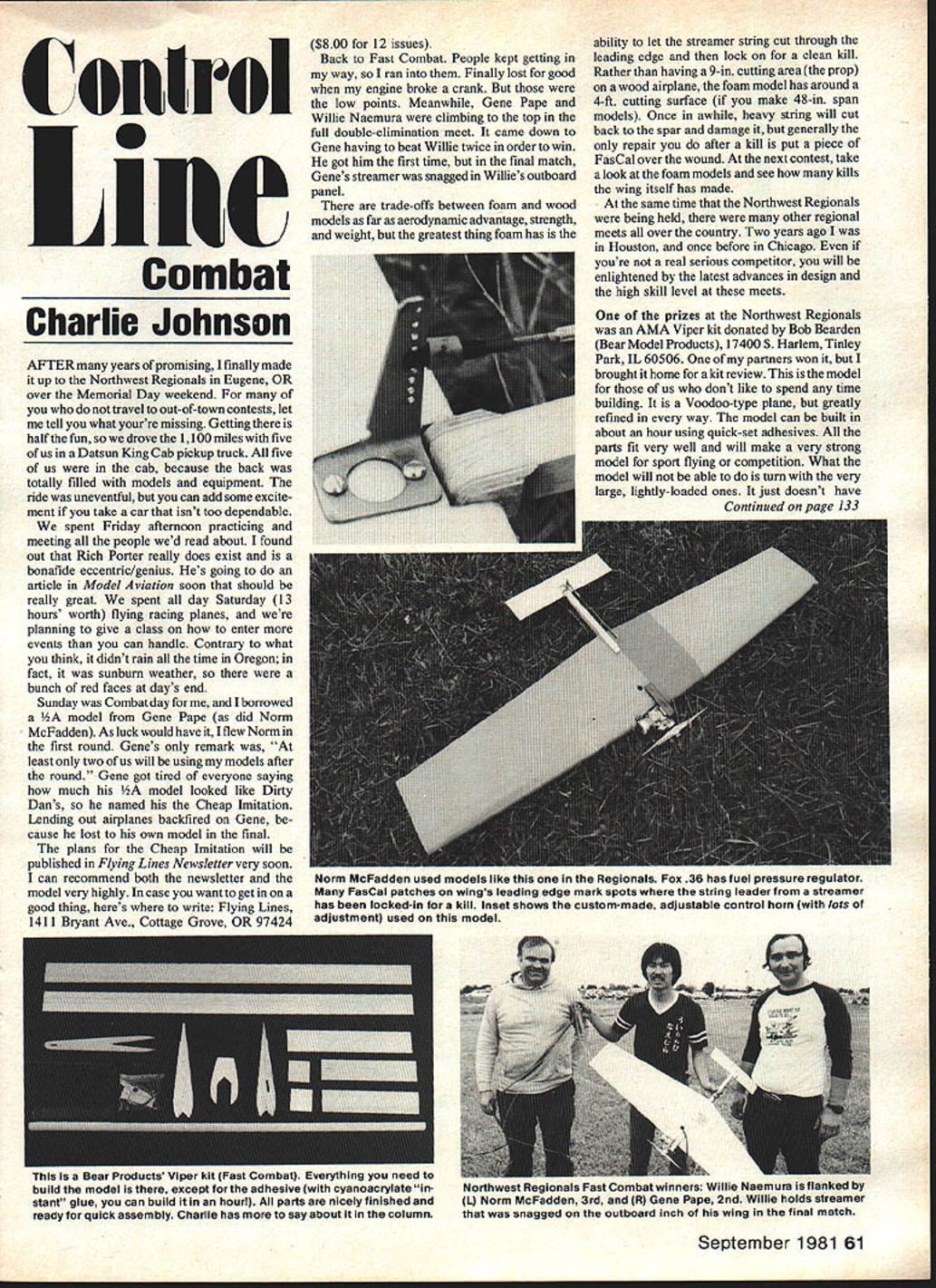 C out rot S Inc Combat Charlie Johnson AFTER years promising finally made up Northwest Regionals Eugene OR over Memorial Day weekend travel out-of-town contests let tell what yourre missing Getting half fun drove 1100 miles five us Datsun King Cab pickup truck five us cab because back totally filled models equipment ride uneventful can add some excite ment take car isnt too dependable spent Friday afternoon practicing meeting people wed read about found out Rich Porter really does exist bonafide eccentric/genius Hes going article Model Aviation soon should really great spent day Saturday 13 hours worth flying racing planes planning give class enter events can handle Contrary what think didnt rain time Oregon fact sunburn weather bunch red faces days end Sunday Combat day borrowed model Gene Pape did Norm McFadden As luck would have flew Norm first round Genes remark least two us will using models after round Gene got tired everyone saying much model looked like Dirty Dans named Cheap Imitation Lending out airplanes backfired Gene cause lost own model final plans Cheap Imitation will published Flying Lines Newsletter very soon can recommend both newsletter model very highly case want get good thing heres write Flying Lines 1411 Bryant Ave Cottage Grove OR 97424 $800 12 issues Back Fast Combat People kept getting way ran Finally lost good engine broke crank low points Meanwhile Gene Pape Willie Naemura climbing top full double-elimination meet came down Gene having beat Willie twice order win got him first time final match Genes streamer snagged Willies outboard panel trade-offs between foam wood models far aerodynamic advantage strength weight greatest thing foam has ability let streamer string cut through leading edge lock clean kill Rather having 9-in cutting area prop wood airplane foam model has around 4-ft cutting surface make 48-in span models Once awhile heavy string will cut back spar damage generally repair after kill put piece FasCal over wound next contest take look foam models see kills wing itself has made same time Northwest Regionals being held other regional meets over country Two years ago Houston once before Chicago youre real serious competitor will enlightened latest advances design high skill level meets September 1981 61 prizes Northwest Regionals AMA Viper kit donated Bob Bearden Bear Model Products 17400 S Harlem Tinley Park IL 60506 partners won brought home kit review model us dont like spend time building Voodoo-type plane greatly refined way model can built about hour using quick-set adhesives parts fit very well will make very strong model sport flying competition What model will able turn very large lightly-loaded ones just doesnt have Continued vaze 133 Norm McFadden used models like Regionals Fox 36 has fuel pressure regulator FasCal patches wings leading edge mark spots string leader streamer has locked-in kill Inset shows custom-made adjustable control horn lots adjustment used model nis near rrooucss viper KIT li-ass Lomoal everything need build model except adhesive cyanoacrylate stant glue can build tin hourl partsare nicelyfinished ready quick assembly Charlie has say about column IdartnwesI Ileguonels rest Combat winners Willie Naemura flanked L Norm McFadden 3rd R Gene Pape 2nd Willie holds streamer snagged outboard inch wing final match experiment throttle get bit extra power shorter run Davis has turned out really fun modeL flying far has taken place grass-covered schoolyard about block long Eventually well get out club flying field Phoenix Model Airplane Club some con test flying field known among local Scale flyers rock garden however can wait havent tried CO-2 flying yet let pass along comment overheard last time out flying sport model another modeler Scale modelboth us flying many flights fellow club member said Anything that much fun ought illegal CL Aerobatics/Paul Continued page 60 used Dave Brown Gene Martine very good Martine-Baron handle no longer produced because Gene Martine justifiably terrified might drawn lawsuit some other negligent flier gets hurt Mufflers sometime item Adamisin Martine items sometimes available Bob Paul muffler available full moon some other good mufflers available limited quantities Fortunately can get engines since adapting RC-type engines Stunt have tried get some decent balsa lately Its good thing RC still uses glow plugs propellers sometimes paint would have go back Champion spark plugs ignition carving own props ugh plastic coverings sad day Bob Hunt close doors Control Line Specialties thereby saw end flap horns landing gear blocks wires very good Tru-Flite handles foam wings other specialty itemsunfortunately Bob feed clothe family Still biggest single accomplishment Precision Aerobatics Model Pilots Associa tion ease communication has available over past eight years news letter will continue printed too although may occasionally some lapses due real job pressures support Model Aviation magazine letting writerramble off about 1000 words month also very helpful individualized event Stunt keep letters coming ideas questions pictures hints information Stunt PAMPA write Wynn Paul 1640 Maywick Drive Lexington KY 40504 CL Combat/Johnson Continued page 61 wing area might want spend some extra time building exotic large models use Vipers backups although bet end up using Vipers time box kit came big enough about six models thats what Id suggest buy Work models evening about week youll have half-dozen ready go Ive seen Slow Combat variation model would assume could order some kits motor mount cut out 15 would reduce wing loading lot whos seen kit really thinks its wellengineered finished Some Los Angeles WHAT RIC BOOK has complete data about 2100 different RIC products over 250 different RIC companies plus beginners tips R/C experts ITS THIS YEARS EDITION OF THE RIC reference book ever really need AVAILABLE THROUGH YOUR LOCAL HOBBY SHOP OR SEND $950 $795 plus $155 postage handling VA residents add 4% sales tax fl/