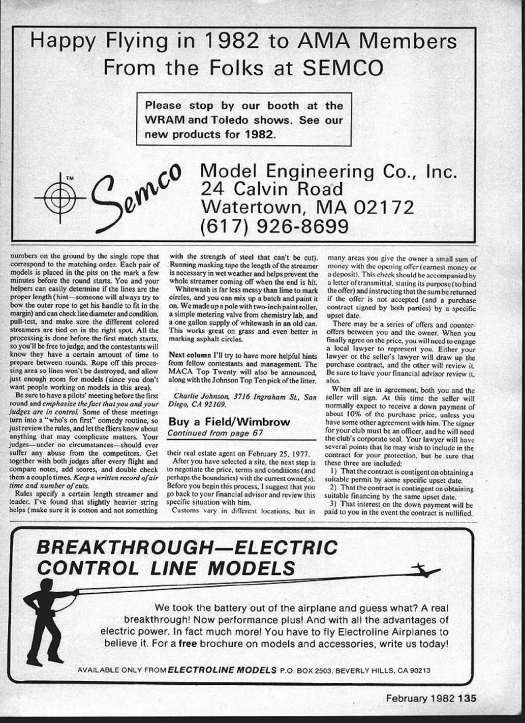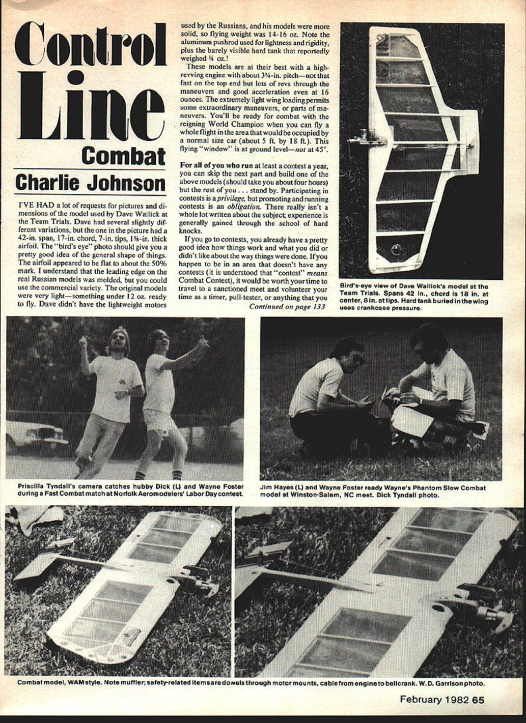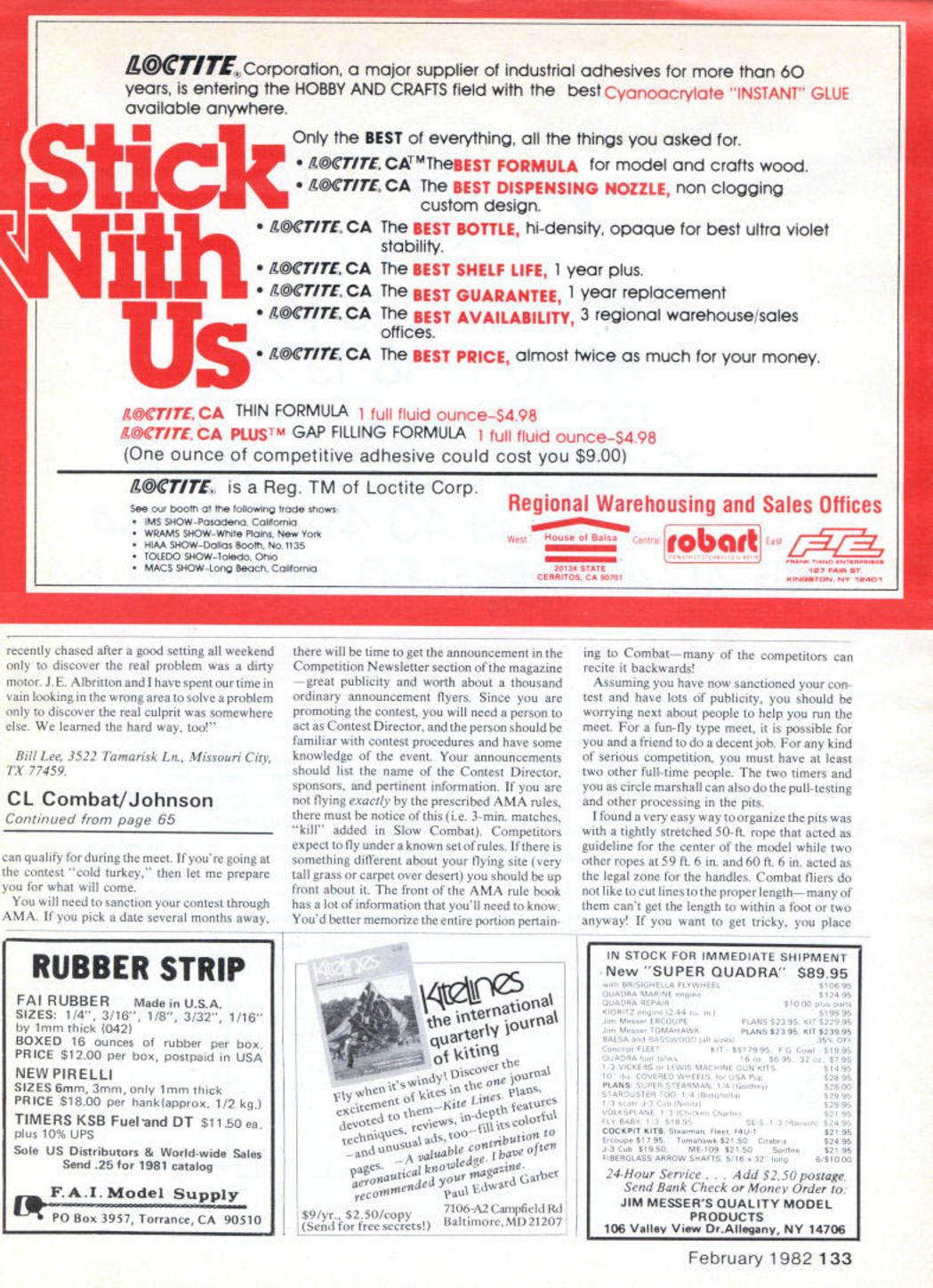 C onE rot AM Combat Charlie Johnson IVE HAD lot requests pictures di mensions model used Dave Wall ick Team Trials Dave several slightly dif ferent variations the picture 42-in span 17-in chord 7-in tips 1 -in thick airfoil birds eye photo should give pretty good idea general shape things airfoil appeared flat about 50% mark understand leading edge real Russian models molded could use commercial variety original models very lightsomething under 12 oz ready fly Dave didnt have lightweight motors used Russians models solid flying weight 14-16 oz Note aluminum pushrod used lightness rigidity plus barely visible hard tank reportedly weighed odels best highrevving engine about 3-in pitchnot fast top end lots revs through maneuvers good acceleration 16 ounces extremely light wing loading permits some extraordinary maneuvers parts ma neuvers Youll ready combat reigning World Champion can fly whole flight areathat would occupied normal size car about 5 ft 18 ft flying window ground levelnot 450 run least contest year can skip next part build above models should take about four hours rest you. stand Participating contests aprivilege promoting running contests obligation really isnt whole lot written about subject experience generally gained through school hard knocks go contests already have pretty good idea things work what did didnt like about way things done happen area doesnt have contests understood contest means Combat Contest would worth time travel sanctioned meet volunteer time timer pull-tester anything Continued page 133 Combat model WAM style Note muffler safety-related itemsare dowels through motor mounts cable engineto belicrank W D Garrison phot Birds-eye view Dave Wallicks model Team Trials Spans 42 chord 18 center Bin attips Hard tank buried inthewing uses crankcase pressure Priscilla Tyndalls camera catches hubby Dick L Wayne Foster during Fast Combat match Norfolk Aeromodelers Labor Daycontest Jim Hayes 1 Wayne Foster ready Waynes Phantom Slow Combat model Winston-Salem NC meet Dick Tyndall photo IL@CTITE Corporation major supplier industrial adhesives 60 years entering HOBBY AND CRAFTS field best Cyanoacrylate INSTANT GLUE available anywhere Only BEST everything things asked IL@CTITL CATMTheBEST FORMULA model crafts wood IL@CTITL CA The BEST DISPENSING NOZZLE non clogging custom design A@CTITL CA L@CTITL CA IL@CTITE CA /L@CTITE CA /L@CTI1Z CA BEST PRICE almost twice much money BEST BOTTLE hi-density opaque best ultra violet stability BEST SHELF LIFE 1 year plus BEST GUARANTEE 1 year replacement BEST AVAILABILITY 3 regional warehouse/sales offices IL@CTITE CA THIN FORMULA 1 full fluid ounce-S498 /L@CTITE CA PLUSTM GAP FILLING FORMULA 1 full fluid ounce-$498 ounce competitive adhesive could cost $900 IL@CTITE Reg TM Loctite Corp Regional Warehousing Sales Offices See booth following trade ShOWS MS 5140W-Pasadena California________________ WRAMS SHOW-White Plains New YorkWest House Balsa Central kaI East HIAA SHOW-Dallas Booth No1135MW WUUE TOLEDO SHOW-Todo OhioNO ENR SS MACS SHOW-Long Beach California 34 STATE FAR 95 CERR TOO CARS 0 NG9T05 recently chased after good setting weekend discover real problem dirty motor J E Albritton have spent time vain looking wrong area solve problem discover real culprit somewhere else learned hard way too Bill Lee 3522 Tamarisk Ln Missouri City TX 77459 CL Combat/Johnson Continued page 65 can qualify during meet youre going contest cold turkey let prepare what will come will need sanction contest through AMA pick date several months away will time get announcement Competition Newsletter section magazine great publicity worth about thousand ordinary announcement flyers Since promoting contest will need person act Contest Director person should familiar contest procedures have some knowledge event announcements should list name Contest Director sponsors pertinent information flying exactly prescribed AMA rules must notice ie 3-mm matches kill added Slow Combat Competitors expect fly under known set rules something different about flying site very tall grass carpet over desert should up front about front AMA rule book has lot information youll need know Youd better memorize entire portion pertaining Combatmany competitors can recite backwards Assuming have now sanctioned con test have lots publicity should worrying next about people help run meet fun-fly type meet possible friend decent job kind serious competition must have least two other full-time people two timers circle marshall can also pull-testing other processing pits found very easy way organize pits tightly stretched 50-ft rope acted guideline center model two other ropes 59 ft 6 60 ft 6 acted legal zone handles Combat fliers like cut lines proper lengthmany cant get length within foot two anyway want get tricky place P0 Box 3957 Torrance CA 90510 y2S 1arterll ourV Jt SsCoutna WySess tcS tX es devoted 0xoduX tev~XXssc ~usuaXtO~0 rib" valuable 0ftelf pageS $0Wlede aeroWautsC j Wsaa~j Gatbet recoWeWaX5X dV copy71t6-A2CampfieldRd SendimoreMD 21207 February 1 982 1 33 RUBBER STRIP FAI RUBBERMade uSA SIZES 1/4 3/16 1/8 3/32 1/16 1mm thick 042 BOXED 16 ounces rubber per box PRICE $1200 per box postpaid SA NEW PIRELLI SIZES 6mm 3mm 1mm thick PRICE $1800 per hankapprox 1/2 kg TIMERS KSB FueIand DT $ll5Oea plus 10% us Sole us Distributors & World-wide Sales Send 25 1981 catalog TOCK FOR IMMEDIATE SHIPMENT -New SUPER QUADRA $8995 ORISIGHELA FLYWHEELs1069R QUADRA MARINE eg ne s1249s QUADRA REPAIR51000 eUs eSSIS KIORITZ engne 1244 c51R59S Je Messe ERCOUPEPLAES 23 95 II $22995 inn Mesne TOMAHAWKPLANS $2395 KIT $23995 5ALSA end BASSWOOD eli SCeSI35S OFF Conneps FLEETKIT 5517995 PO Conel $1995 QUADRA 11 leEks6 oz 5695 32 oz 57 95 1/3 VICKERS os EWIS MACHINE DUN KITS$1495 10 e COVERED WHEEnS los 154 Peps2RRS PLANS SUPER STEARMAN 1 4 10055I50y1R2800 STARDUSTER TOO 1 4 BosoEsIle52995 1 3 see i-S Ce NoIseR29 95 VOLESPLANE 1 3 CEns CUes el521 95 FLY 5455 3 51R SE SE-S 1 3Rancn92495 COCKPIT KITS Sleesesee Fl