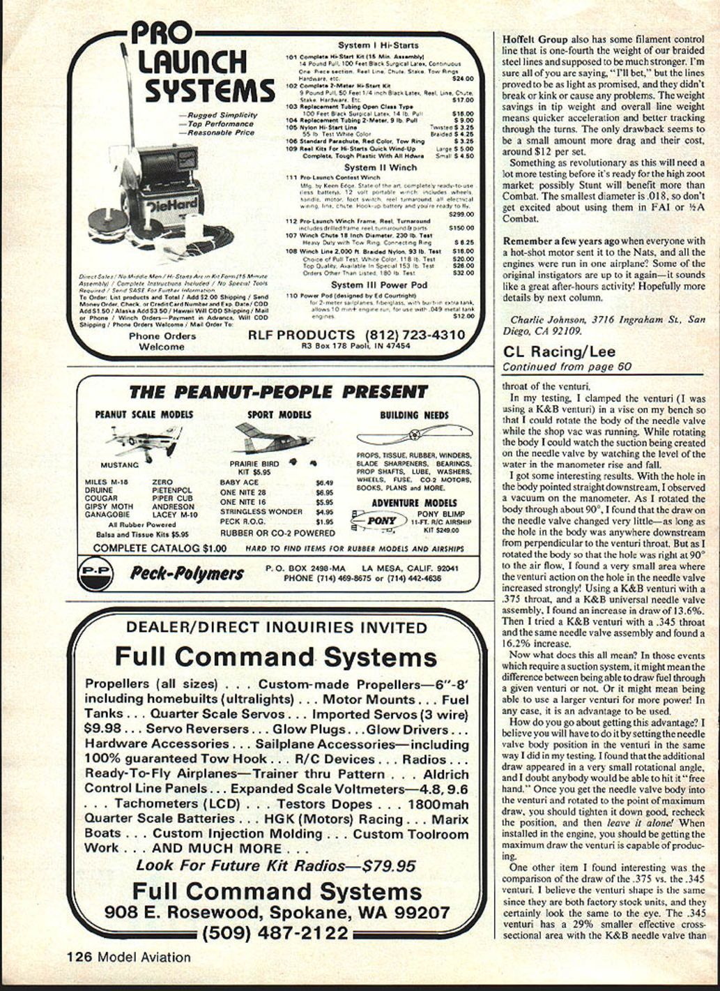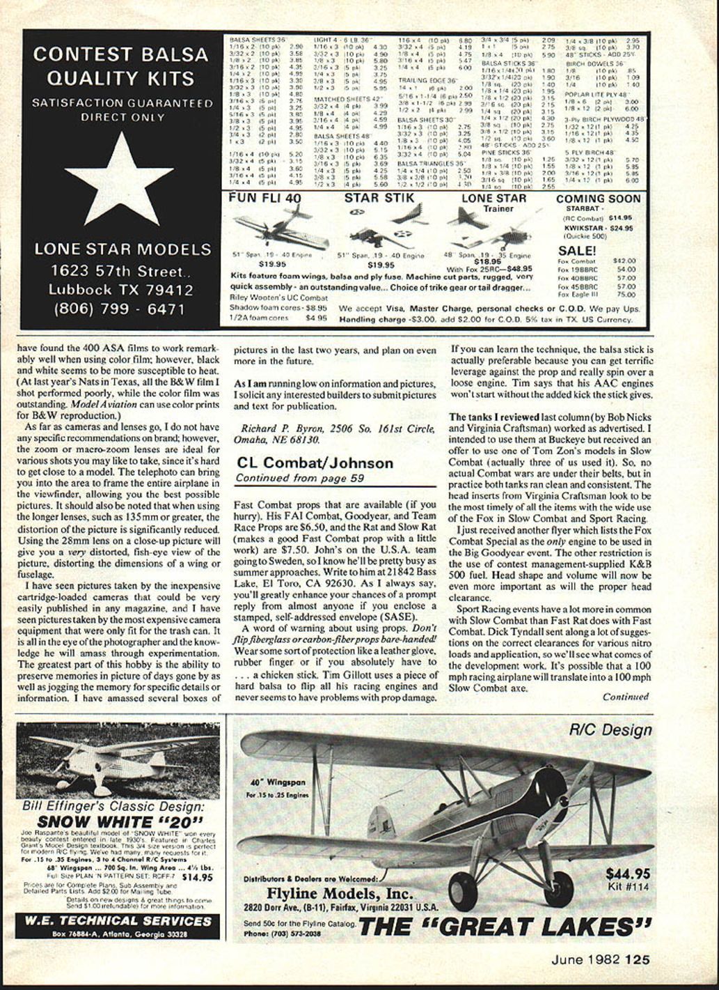 Control Line COMBAT Charlie Johnson PUT MARKER spot started article turn quickly Competition Newsletter upcoming contests listed Editors note Competition News letter separate booklet again month its bound Model Aviation like has beenforthepastseveralyears RMcM Theres something weekend next four months dont have thing fly say can help officiate next four months should get building special interest larger AAA meets go around Memorial Day received special flyers Eugene OR meet attended last year Theyll feature four categories Combat Memorial Day District IV Championships Petersburg VA will feature everything FAI May 15 16 two large meets going part country Start building now can read epoxy sets up noticed some contest flyers Ive received will special restrictions Slow Combat Slow Rat biggest limiting factor has engine rule requires Fox 35 Stunt engine Northwest Sport Race has super-successful using engine has Very Slow Combat using same engine seems local level people dissatisfied full-blown Slow Combat models want truly slow model hence Stunt-engine requirement other band continued escalation FAI Combat diesel long forgotten power plant quest power leaving potent Fox 15 Schnuerle dust Rossi ultra-light Nelson engines going out force CL World Championships summer popular Fox could make much power hyper engines still cant compete weight basis because ultralights weigh 4 oz days bogging engine 7-6 prop long gone 3-3 pitch becomes norm revs approach 30 thou sand World Championship title worth winning stops being pulled Out Europeans others As Team Race has lot development work props old wood nylon sticks several levels performance below new fiberglass carbon-fiber props Id hoped able give price other details prop Hoffelt Group will market still enough manufactured put market John McCollum does make some very nice FAI Continued page 125 Buckeye AZ Regionals Combat winners L R Myles Lawrence Mission Viejo CA 2nd Jerry Capuano Tucson AZ 1st Don Gutacher Denver CO 3rd Meet January82 Buckeye Steve DeBord releases Myles Lawrence double-elimination meet SIte nan carpeted circles lots sagebrush around edges No armadillos though Denvers Don Gutscher RI gets set pounce Tucsons Steve Mills L during Buckeye Fast Combat elims Tucson orevailed LIGHT 46 LB 36 2901 16x3lOok]430 3583323110511490 3851/883110811580 4353 16 315 p8325 4981 4 3lB rkl3 75 330383lSpkl495 3901 2 35 okI595 4 80 2 75MATCHEDSHEETS42 325332844p8I399 380188414511429 3952158414811459 495148414881499 280BALSASHEETS 48 3501 1683I1OpkI440 S2032 310 p8515 1883lOPk635 31531683Spk369 3601/48315581425 415388310881558 9512n34811560 116841008680 3 32 415 561419 18 84IS p8]425 3 16 4 IS p1547 1484 0081600 TBAILING EE3GE 36 14 16 081200 5161146011250 3/881121606299 1/28214811299 BALSASHEETS 30 1 16831101111275 3 32 3110 861325 1 88310811405 1 1684110811OIl 3 32 84110 111504 BALSA TEIANGLES 36 1 4 1 4 I/O pk250 38838l/OpkI720 1 2 8 1 2 110 p63 30 3/4 83 45 081209 1 8 1IS 18812 25 1 884110581590 BALSASTICKS 36 1 168141iI 511180 3 32814120 pk1 90 1 8 89120 18111 40 1 8 8 1 4120 p811 95 16812120081315 3/H sq20 ok2 15 1 Hsq2008315 1 4 8 1 2120 5k4 30 3 8 50110 p8275 38 81 210 p8315 1 2 sq110 p81360 48 STICKS 80025 PINESTICKS 36 1 BsqI/O p8125 1 8 8 1 4 10 p61 55 188381008200 316sq 10p8165 1 4 Sq10 p8255 114838l10081295 318 Sq10 7k370 48STICKS80025 BIRCH DOWELS 36 1810 p885 3/1610 58 1 09 1/410 p8140 18018149 LITE ELY 48 1/8 862 p8300 188122pu600 3-SIp BIRCH PLYWOOD 48 1 32 121 p8425 1 168121 p8435 8 12 1 58450 SLY BIRCH48 3/328121p8570 1/8812 11881585 3168121skI585 1/481 Il881600 FUN FLI 40 51 Spo /9 40 Enqrre51 8588 19 40 Engree45 SPan 18 ogne54200 $1995$1995 1895 FOB 25RC$48955400 Kits feature foam wings balsa ply fuse Machine cut parts rugged very 57 00 5700 quick assembly outstanding value. Choice trike gear tail dragger. 75 00 Riley Wootens UC Combat Shadowfoamcores-$895 acCept Visa Master Charge personal checks COD pay Ups 1/2Afoam COPeS $495 Handling charge -$300 add $200 COD 5% tax TX US Currency COMING SOON STARSAT eC Combat S1455 KWIK5TAR $2495 Oxrrckre 500 SALE Pox Combat 508 I9BBRC Fox 4OBBRC Eon 4BBBRC Eon Eagle Iii have found 400 ASA films work remark ably well using color film however black white seems susceptible heat last years Nats Texas B&W film shot performed poorly color film outstanding ModelAviation can use color prints B&W reproduction As far cameras lenses go have specific recommendations brand however zoom macro-zoom lenses ideal various shots may like take since its hard get close model telephoto can bring area frame entire airplane viewfinder allowing best possible pictures should also noted using longer lenses such 135mm greater distortion picture significantly reduced Using 28mm lens close-up picture will give very distorted fish-eye view picture distorting dimensions wing fuselage have seen pictures taken inexpensive cartridge-loaded cameras could very easily published magazine have seen pictures taken expensive camera equipment fit trash can eye photographer know ledge will amass through experimentation greatest part hobby ability preserve memories picture days gone well jogging memory specific details information have amassed several boxes pictures last two years plan future As ani running low information pictures solicit interested builders submit pictures text publication Richard P Byron 2506 So 161st Circle Omaha NE 68130 CL Combat/Johnson Continued page 59 Fast Combat props available hurry FAI Combat Goodyear Team Race Props $650 Rat Slow Rat makes good Fast Combat prop little work $750 Johns USA team going Sweden sol know hell pretty busy summer approaches Write him 21842 Bass Lake El Toro CA 92630 As always say youll greatly enhance chances prompt reply almost anyone enclose stamped self-addressed envelope SASE word warning about using props Dont flip fiberglass orcarbon-fiberprops bare-handed Wear some sort ofptotection like leather glove rubber finger absolutely have chicken stick Tim Gillott uses piece hard balsa f