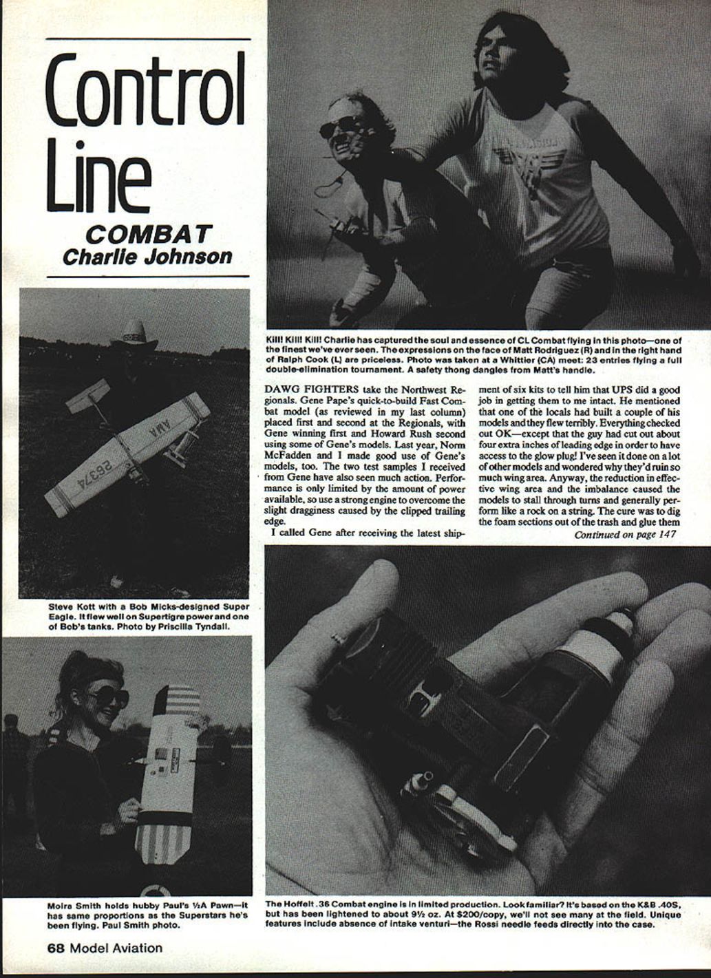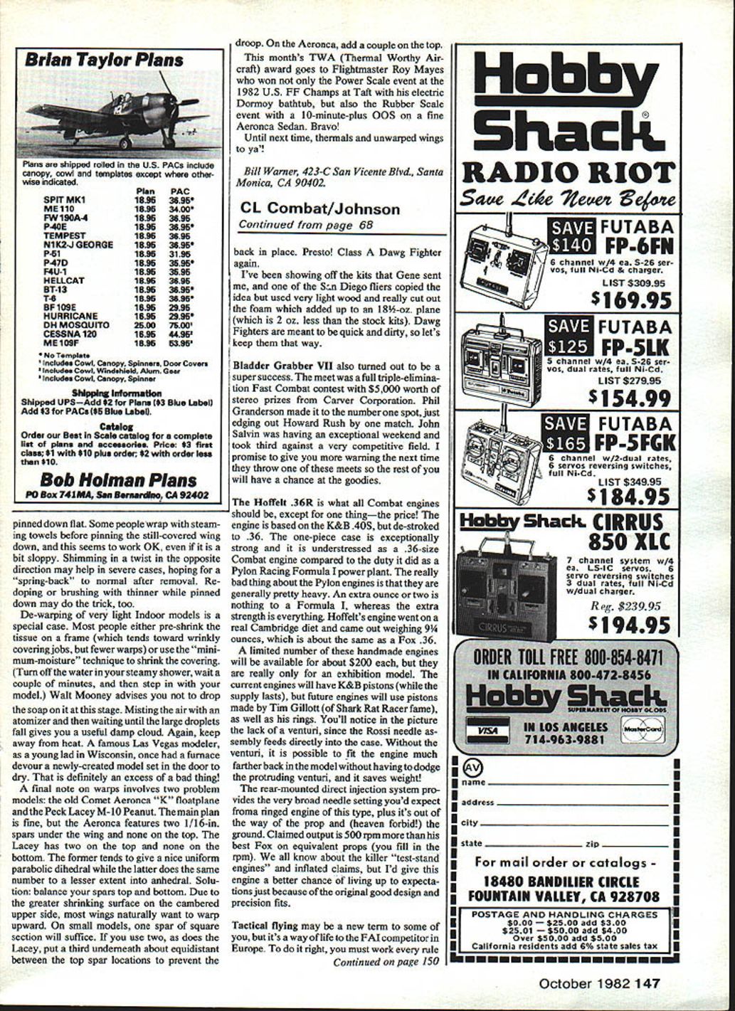 Control Line COMBAT Charlie Johnson Moira Smith holds hubby Pauls Pawnit has same proportions Superstars hes flying Paul Smith photo DAWG FIGHTERS take Northwest Re gionals Gene Papes quick-to-build Fast Com bat model reviewed last column placed first second Regionals Gene winning first Howard Rush second using some Genes models Last year Norm McFadden made good use Genes models too two test samples received Gene have also seen much action Perfor mance limited amount power available uses strong engine overcome slight dragginess caused clipped trailing edge called Gene after receiving latest shipment six kits tell him UPS did good job getting intact mentioned locals built couple models flew terribly Everything checked out OKexcept guy cut out about four extra inches leading edge order have access glow plug Ive seen done lot other models wondered theydruin much wing area Anyway reduction effec tive wing area imbalance caused models stall through turns generally per form like rock string cure dig foam sections out trash glue Continued page 147 68 Model Aviation Kill Kill Kill Charlie has captured soul essence CL Combat flying photoone finest weveever seen expressions face Mats Rodriguez R right hand Ralph Cook 1 priceless Photo taken Whittier CA meet 23 entries flying full double-elImInation tournament safety thong dangles Matss handle Steve Kots Bob Hicks-designed Super Eagle flew well Supertigre power Bobs tanks Photo Priscilla Tyndall Hoffelt 38 Combat engine limited production Lookfamiliar Its based KAB 40S has lightened about 9 oz $200/copy well see field Unique features include absence intake venturithe Rossi needle feeds directly case Brian Taylor Plans SPIT MK1 ME 110 FW 190A-4 P-40E TEMPEST N1K2-J GEORGE P-al P-47D MU-i HELLCAT BT-13 T6 BF1O9E HURRICANE OH MOSQUITO CESSNA 120 ME 10SF No Template Includes Cowl canopy Spinners Door Covers Includes Cowl Windshield Alum Gear lncludes Cowl Canopy Spinner Shng Information Shipped UPSAdd $2 Plans *3 Blue Label Add *3 PACe *5 Blue Label Catalog Order Beat Scala catalog complete list plans accessorlee Price 83 first class $1 wIth *10 plus order $2 wIth order less *10 Bob Holman Plans PG Box 741MA Sen BeruanEuo CA 92402 pinned down flat Some people wrap steam ing towels before pinning still-covered wing down seems work OK bit sloppy Shimming twist opposite direction may help severe cases hoping spring-back normal after removal Redoping brushing thinner pinned down may trick too De-warping very light Indoor models special case Most people either pre-shrink tissue frame tends toward wrinkly covering jobs fewer warps use mini mum-moisture technique shrink covering Turn off water steamy shower wait couple minutes step model Walt Mooney advises drop soap stage Misting air atomizer waiting until large droplets fall gives useful damp cloud Again keep away heat famous Las Vegas modeler young lad Wisconsin once furnace devour newly-created model set door dry definitely excess bad thing final note warps involves two problem models old Comet Aeronca K tloatplane andthe Peck Lacey M-10 Peanut main plan fine Aeronca features two 1/16-in spars under wing top Lacey has two top bottom former tends give nice uniform parabolic dihedral latter does same number lesser extent anhedral Solu tion balance spars top bottom Due greater shrinking surface cambered upper side wings naturally want warp upward small models spar square section will suffice use two does Lacey put third underneath about equidistant between top spar locations prevent droop Aeronca add couple top months TWA Thermal Worthy Air craft award goes Flightmaster Roy Mayes won Power Scale event 1982 US FF Champs Taft electric Dormoy bathtub also Rubber Scale event 10-minute-plus QOS fine Aeronca Sedan Bravo Until next time thermals unwarped wings ya Bill Warner 423-C San Vicente Blvd Santa Monica CA 90402 CL Combat/Johnson Continued page 68 back place Presto Class Dawg Fighter again Ive showing off kits Gene sent Sn Diego fliers copied idea used very light wood really cut out foam added up 18-oz plane 2 oz less stock kits Dawg Fighters meant quick dirty lets keep way Bladder Grabber VII also turned out super success meet full triple-elimina tion Fast Combat contest $5000 worth stereo prizes Carver Corporation Phil Granderson made number spot just edging out Howard Rush match John Salvin having exceptional weekend took third against very competitive field promise give waming next time throw meets rest will have chance goodies Hoffelt 36R what Combat engines snuuid except thingthe price engine based K&B 40S de-stroked 36 one-piece case exceptionally strong understressed 36-size Combat engine compared duty did Pylon Racing Formula power plant really bad thing about Pylon engines generally pretty heavy An extra ounce two nothing Formula whereas extra strength everything Hoffelts engine went real Cambridge diet came out weighing 94 ounces about same Fox 36 limited number handmade engines will available about $200 really exhibition model current engines will have K&B pistons supply lasts future engines will use pistons made Tim Gillott Shark Rat Racer fame well rings Youll notice picture lack venturi since Rossi needle sembly feeds directiy case Without venturi possible fit engine much farther back inthe model having dodge protruding venturi saves weight rear-mounted direct injection system pro vides very broad needle setting youd expect froma ringed engine type plus its out way prop heaven forbid ground Claimed output 500rpm best Fox equivalent props fill rpm know about killer test-stand engines inflated claims Id give engine better chance living up expecta tions just because original good design precision fits Tactical flying may new term some its way life FM competitor Europe right must work rule Continued page 150 Hobbi Shack RADIO RIOT Sage Ad c4 e lZece& eeie UTABA ZEFPE6FN 6 channel w/4 es S-26 ser vos full N Cd & charger ST $30995 6995 IPOSTAGE AND HANDLING CHARGES $000 $2500 add $300 1 2501 $5000 a