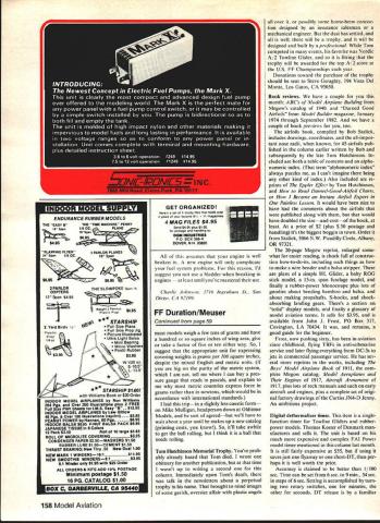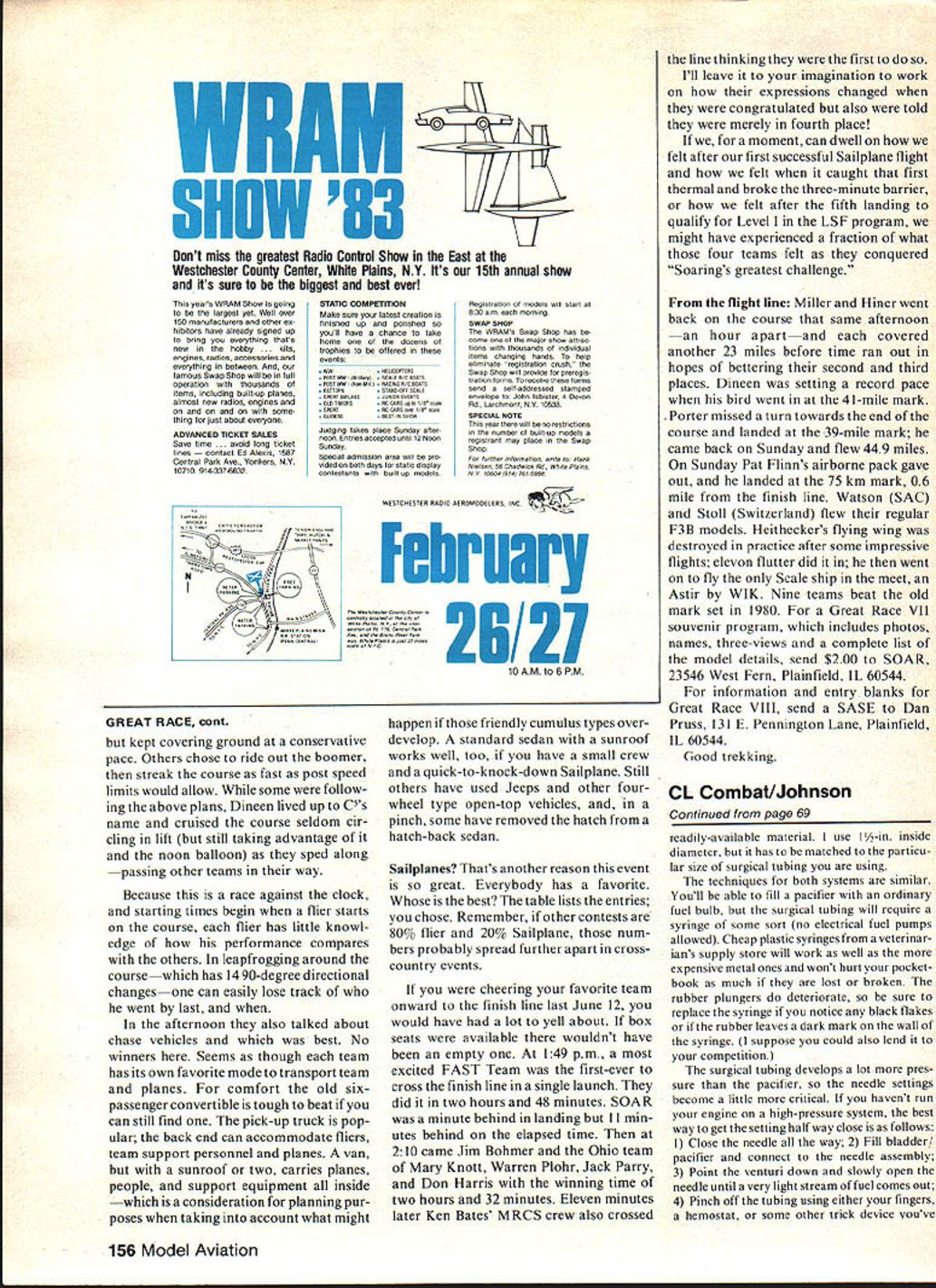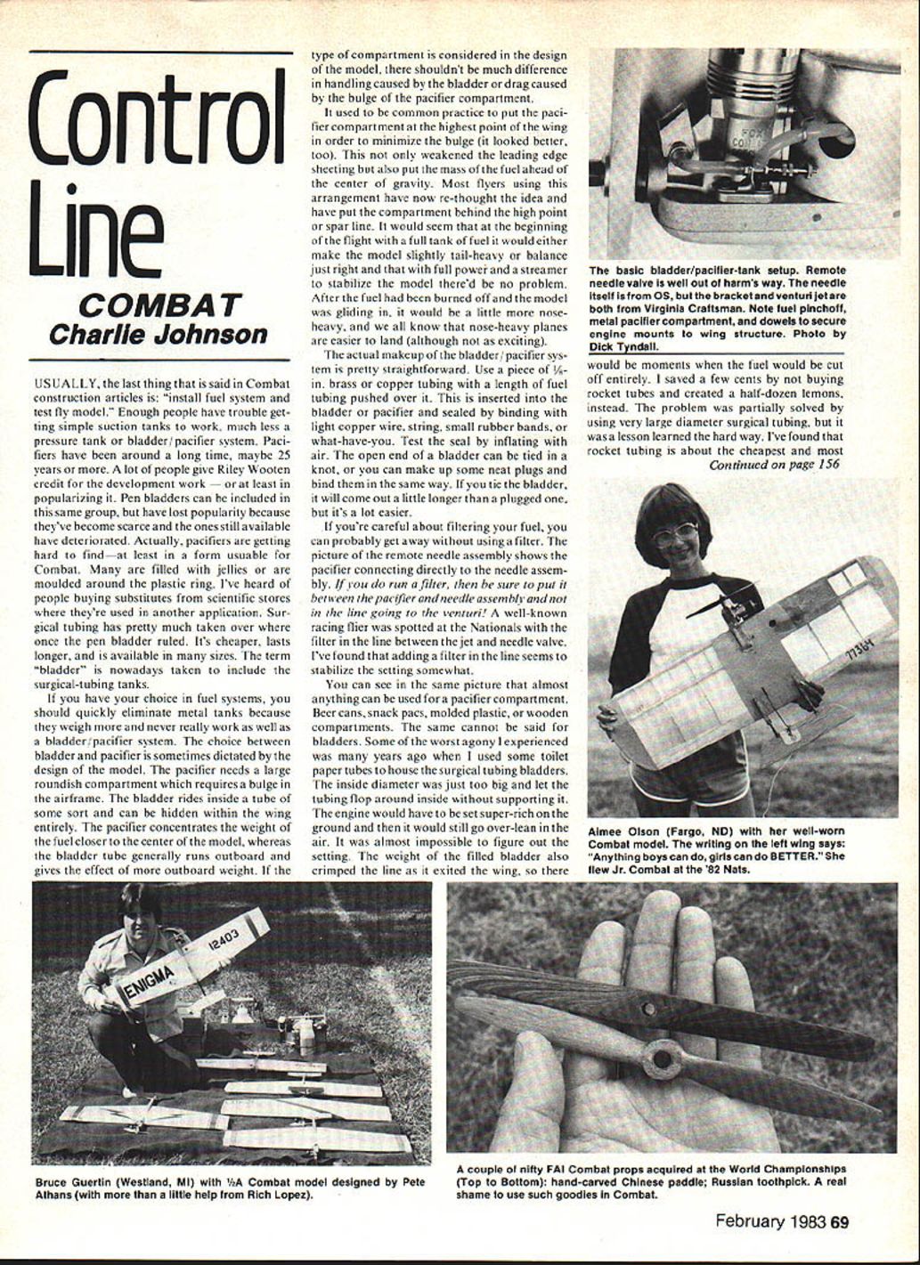 Control Line COMBAT Charlie Johnson USUALLY last thing said Combat construction articles install fuel system test fly model Enough people have trouble get ting simple suction tanks work much less pressure tank bladder/pacifier system Paci fiers have around long time maybe 25 years lot people give Riley Wooten credit development work least popularizing Pen bladders can included same group have lost popularity because theyve become scarce ones still available have deteriorated Actually pacifiers getting hard findat least form usuable Combat filled jellies moulded around plastic ring Ive heard people buying substitutes scientific stores theyre used another application Sur gical tubing has pretty much taken over once pen bladder ruled Its cheaper lasts longer available sizes term bladder nowadays taken include surgical-tubing tanks have choice fuel systems should quickly eliminate metal tanks because weigh never really work well bladder/pacifier system choice between bladder pacifier sometimes dictated design model pacifier needs large roundish compartment requires bulge airframe bladder rides inside tube some sort can hidden within wing entirely pacifier concentrates weight fuel closer center model whereas bladder tube generally runs outboard eives effect outboard weiahr type compartment considered design model shouldnt much difference handling caused bladder drag caused bulge pacifier compartment used common practice put paci fier compartment highest point wing order minimize bulge looked better too weakened leading edge sheeting also put mass fuel ahead center gravity Most flyers using arrangement have now re-thought idea have put compartment behind high point spar line would seem beginning flight full tank fuel would either make model slightly tail-heavy balance just right full power streamer stabilize model thered no problem After fuel burned off model gliding would little noseheavy know nose-heavy planes easier land although exciting actual makeup bladder pacifier sys tem pretty straightforward Use piece /s brass copper tubing length fuel tubing pushed over inserted bladder pacifier sealed binding light copper wire string small rubber bands what-have-you Test seal inflating air open end bladder can tied knot can make up some neat plugs bind same way tie bladder will come out little longer plugged its lot easier youre careful about filtering fuel can probably get away using filter picture remote needle assembly shows pacifier connecting directly needle assem bly tou run filter sure put between pacifier needle asseinblr line going venturi well-known racing flier spotted Nationals filter line between jet needle valve Ive found adding filter line seems stabilize setting somewhat can see same picture almost anything can used pacifier compartment Beer cans snack pacs molded plastic wooden compartments same cannot said bladders Some worst agony experienced years ago used some toilet paper tubes house surgical tubing bladders inside diameter just too big let tubing flop around inside supporting engine would have set super-rich ground would still go over-lean air almost impossible figure out setting weight filled bladder also crimneri tine i exited wi~a would moments fuel would cut off entirely saved few cents buying rocket tubes created half-dozen lemons instead problem partially solved using very large diameter surgical tubing lesson learned hard way Ive found rocket tubing about cheapest Continued page 156 February 1983 69 basic bladder/pacifier-tank setup Remote needle valve well out harms way needle itself OS bracket venturi jet both Virginia Craftsman Note fuel pinchoff metal pacifier compartment dowels secure engine mounts wing structure Photo Dick Tyndali Aimee Olson Fargo ND wIth well-worn Combat model writing left wing says Anything boys can girls can BETTER flew Jr Combat 82 Nats Bruce Guertin Westland Ml 1/2A Combat model designed Pete Athans little help Rich Lopez couple nifty FAI Combat props acquired World Championships Top Bottom hand-carved Chinese paddle Russian toothpick real shame use such goodies Combat years WRAM Show going largest yet Well over 150 manutactarers asd other ex hibitors have already signed up brirrg everything thats sew hobby --- kits esgines radios accessories eoerythisg between famous Swap Shop will tall operotios thousands items including huittup planes almost sew radios engines vs some thing lost about everyone ADVANCED TICKET SALES Sane time d long ticket inns act Ed Alexis 1557 Central Park Ave Yonkers NY 15715 514-3375632 STATIC COMPETITION Make sure latest creation finished up potished youll have chance take home dozens 01 trvphies offered events rtvn xw i Moor tv exAm wIn 000 000w 50 50 tuaft un nIMernRn urns 010 ie Jogging takes plaon Sunday atm noun Oetrienaoonptxd until ft Ssxn Suvdan Sprolat admission area will prx video xv both days storm display uxvtestants built-up models GREAT RACE cont kept covering ground conservative pace Others chose ride out boomer streak course fast post speed limits would allow some follow ing above plans Dineen lived up Cis name cruised course seldom cir cling lift still taking advantage noon balloon sped along passing other teams way Because race against clock starting times begin flier starts course flier has little knowl edge performance compares others leapfrogging around coursewhich has 1490-degree directional changesone can easily lose track went last afternoon also talked about chase vehicles best No winners Seems though team has its own favorite mode transport team planes comfort old sixpassenger convertible tough beat can still find pick-up truck pop ular back end can accommodate fliers team support personnel planes van sunroof two carries planes people support equipment inside consideration planning pur poses taking account what might eegosfratixn yr mxdels will starr e atm nash morning SWAP SHOP WRAMs Swan shop van vome xxv moivr nIna attrau riven tlvusands individual ireew changing haydn nob eliminate rrg