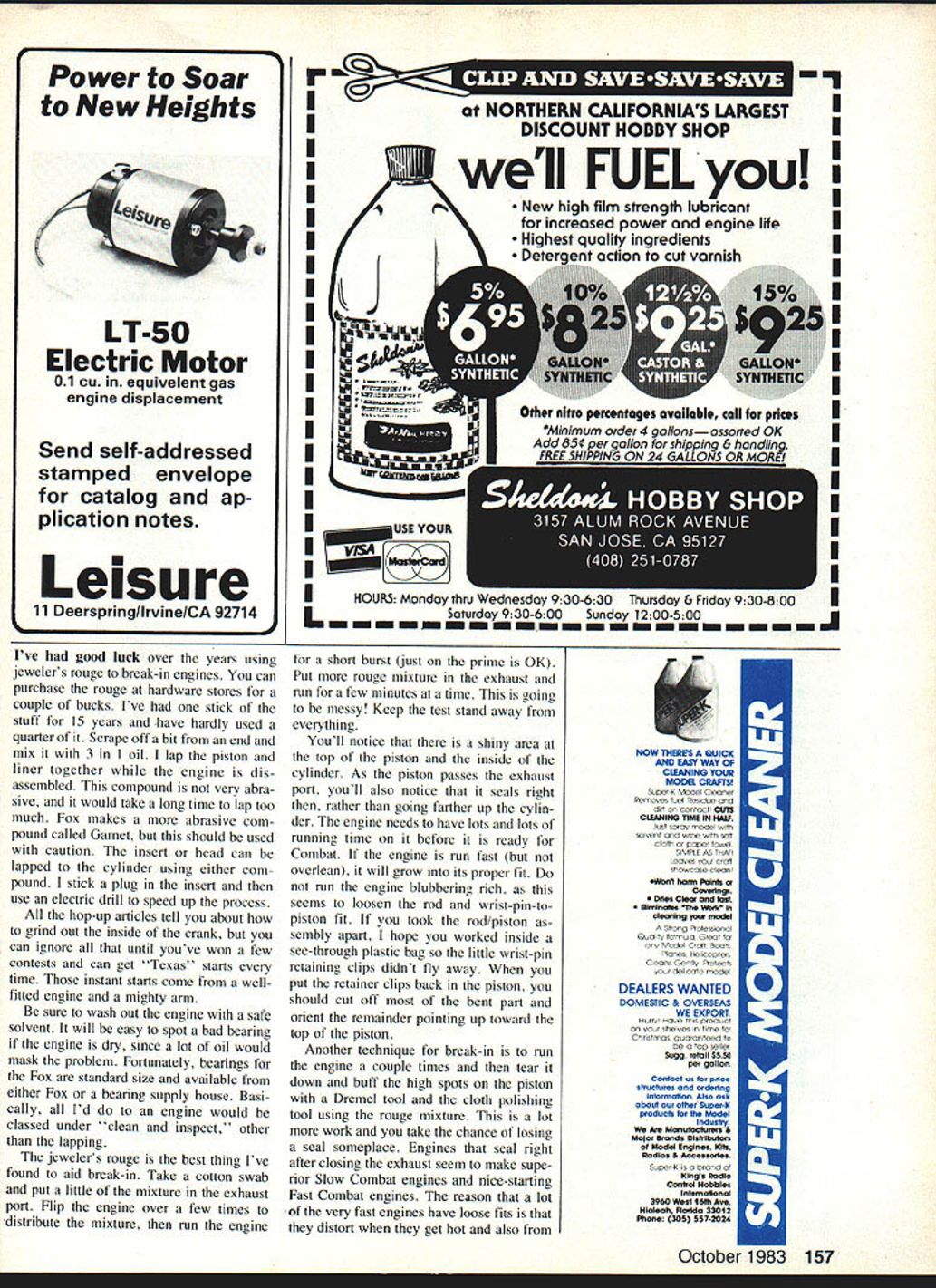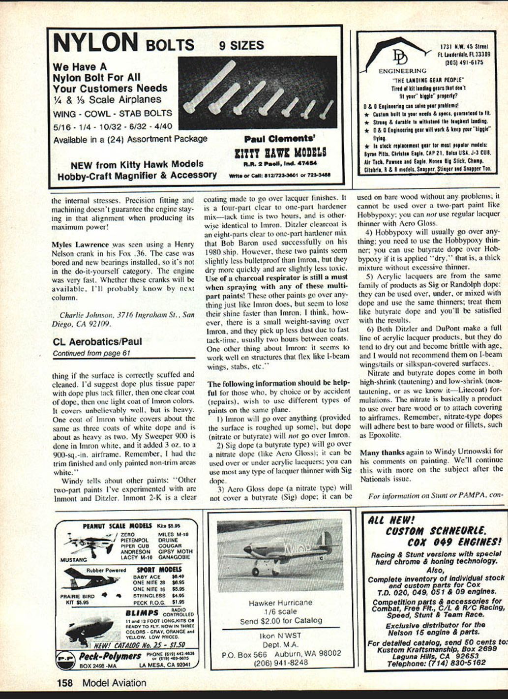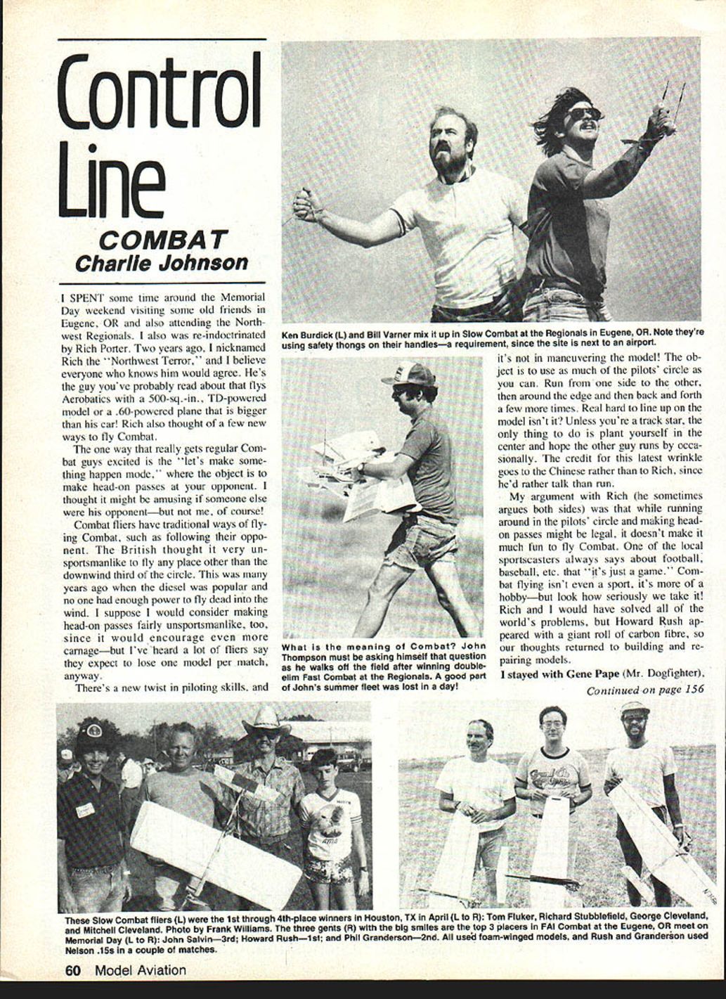 Control Line COMBAT Charlie Johnson SPENT some time around Memorial Day weekend visiting some old friends Eugene OR also attending North west Regionals also re-indoctrinated Rich Porter Two years ago nicknamed Rich Northwest Terror believe everyone knows him would agree Hes guy youve probably read about flys Aerobatics 500-sq-in TD-powered model 60-powered plane bigger car Rich also thought few new ways fly Combat way really gets regular Com bat guys excited lets make some thing happen mode object make head-on passes opponent thought might amusing someone else opponentbut course Combat fliers have traditional ways fly ing Combat such following oppo nent British thought very un sportsmanlike fly place other downwind third circle years ago diesel popular no enough power fly dead wind suppose would consider making head-on passes fairly unsportsmanlike too since would encourage carnagebut Ive heard lot fliers say expect lose model per match anyway Theres new twist piloting skills its maneuvering model ob ject use much pilots circle can Run side other around edge back forth few times Real hard line up model isnt Unless youre track star thing plant yourself center hope other guy runs occa sionally credit latest wrinkle goes Chinese rather Rich since hed rather talk run argument Rich sometimes argues both sides running around pilots circle making headon passes might legal doesnt make much fun fly Combat local sportscasters always says about football baseball etc its just game Com bat flying isnt sport its hobbybut look seriously take Rich would have solved worlds problems Howard Rush ap peared giant roll carbon fibre thoughts returned building re pairing models stayed Gene Pape Mr Dogfighter Continued page 156 nese iow t.omual iiwr5 L 1st through 4th-place winners Houston TX April L tO i om Fluker Richard Stubblefield George Cleveland Mitchell Cleveland Photo Frank Williams three gents R big smiles top 3 placers FAI Combat Eugene OR meet Memorial Day L R John Salvin3rd Howard Rushist Phil Granderson2nd used foam-winged models Rush Granderson used Nelson 15s couple matches 60 Model Aviation Ken Burdick L Bill Varner mix up Slow Combat Regionals Eugene OR Note theyre using safety thongs handlesa requirement since site next airport 4/ What meaning ComDaTr jann Thompson must asking himself question walks off field after winning double elim Fast Combat Regionals good part Johns summer fleet lost day Last details Attach bellcrank -in #2 Sheet metal screw Sew elevator using Dacron flying line figure-eight stith Dab small amount gap-filling CyA knots needle holes using toothpick apply glue Dont use thin CyA will wick throughout hinges lock Position control horn pushrod holes above hinge line pushrod will parallel fuselage Mark bore holes elevator control horn 1-larden holes wijh thin CyA glue deburr holes CyA glue used way prevents crushing elevator [he control horn attached Attach control horn will need about 9-in piece 047 piano wire ihe pushrod Bend Z-shape end attach bellcrank cut 8 froiri bend Solder spring thread end provide neutral adjust ment An adult experienced modeler should help soldering Install along mini snaplink attaching control horn prefer may use Z-bends both ends along adjust ment kink Dont install pushrod guide until after few test flights 047 wire stiff enough flight loads will want support once plane trimmed out protect pushrod getting bent handling Make up lead-outs using good parts some ruined 015 0 18 strand ed steel flying lines Cotitbat contest should yield some Form loops wrap #28 soft copper wire shown plans See also AMA rule book page No 17 Alternately may use hard-finished 20-lb-test kite string tie lead-outs Watch closely fraying replace often Steel lead-outs preferred Glue penny position outboard wing gap-filling CyA Attach engine using Va-in No 2 sheet metal screws Cut small cigar tube about 4 long bladder holder attach above outboard wing against fu selage thin servo-mounting tape Seal penny wing weight hinge needle holes exit holes en gine bellcrank screws poly urethane Hang up dry Flying Check CG first between nd leading edge fine slightly nose-heavy OK first few flights tail-heavy balance point must corrected before fly ing pushrod should adjusted equal elevator travel both ways Use top hole control horn first few flights Use 5 x 3 nylon prop fly plane 008 x 35-ft steel stranded lines Feel airplane out slowlyfirst level flight big loops big eights inverted flight move CO small steps testing change before going may become bit soft lines some rearward CG positions shim inside screws engine mount small No 2 wash ers give out-thrust original has flown 30-ft Da cron lines well 30 35 38 42-ft 008 stranded steel lines abso lutely calm fun fly 42-ft lines otherwise 35 38-ft seems about right Right now original model rigged use top hole control horn CO trim trainer zips right through big loop very smooth steady Tighter turns pos sible CG shifted back /x will nice later Using pressure bladder big mystery can difficult start out impossible combination combination thai worked just fine fol lowing Very well-worn twin-port Cox 290 new engines until have run lot much trouble 2 Bladder made I/ioin ID A2-in-wall surgical tubing can obtained Kistorn Kraft manship Sig 3 5/ x 3 Top Flite nylon prop too much prop no needle setting will work 4 Cox Super Power Fuel other fuels will no doubt work fine does sure 5 Add spring needle valve unless change nylon seal daily needle drift may problem will need small 10cc syringe fill bladder clamp pinch off fuel line experienced running engines bladder pressure get experi enced help Have fun version Annes Plane CL CombaVJohflsOfl Continued page 60 told findings new Fox Mark IV Gene machinist de cided take couple engines work see what right ng major problem flanges sleeves square Drop sleeve crankcase would seat way around No amount lapping would thing about either suppose problem varies engine engine reason lot engines bind once screws tightened 