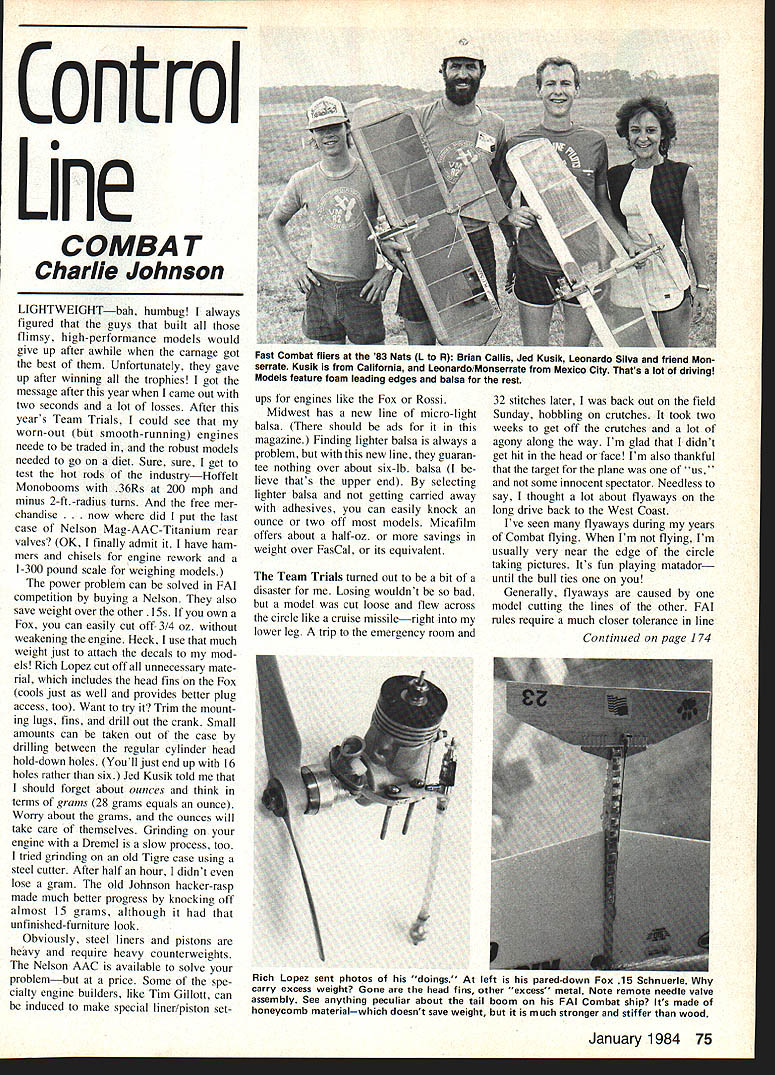 Control Line COMBAT Charlie Johnson LIGHTWEIGHTbah humbug always figured guys built flimsy high-performance models would give up after awhile carnage got best Unfortunately gave up after winning trophies got message after year came out two seconds lot losses After years Team Trials could see worn-out smooth-running engines neede traded robust models needed go diet Sure sure get test hot rods industryHoffelt Monobooms 36Rs 200 mph minus 2-ft-radius turns free mer chandise w did put last case Nelson Mag-AAC-Titanium rear valves OK finally admit have ham mers chisels engine rework 1-300 pound scale weighing models power problem can solved FAI competition buying Nelson also save weight over other own Fox can easily cut off 3/4 oz weakening engine Fleck use much weight just attach decals mod els Rich Lopez cut off unnecessary mate rial includes head fins Fox cools just well provides better plug access too Want try Trim mount ing lugs fins drill out crank Small amounts can taken out case drilling between regular cylinder head hold-down holes Youll just end up 16 holes rather six Jed Kusik told should forget about ounces think terms grams 28 grams equals ounce Worry about grams ounces will take care themselves Grinding engine Dremel slow process too tried grinding old Tigre case using steel cutter After half hour didnt lose gram old Johnson hacker-rasp made much better progress knocking off almost 15 grams although unfinished-furniture look Obviously steel liners pistons heavy require heavy counterweights Nelson AAC available solve problembut price Some spe cialty engine builders like Tim Gillott can induced make special liner/piston setups engines like Fox Rossi Midwest has new line micro-light balsa should ads magazine Finding lighter balsa always problem new line guaran tee nothing over about six-lb balsa lieve thats upper end selecting lighter balsa getting carried away adhesives can easily knock ounce two off models Micafilm offers about half-oz savings weight over FasCal its equivalent Team Trials turned out bit disaster Losing wouldnt bad model cut loose flew across circle like cruise missileright lower leg trip emergency room 32 stitches later back out field Sunday hobbling crutches took two weeks get off crutches lot agony along way Im glad didnt get hit head face Im also thankful target plane us some innocent spectator Needless say thought lot about flyaways long drive back West Coast Ive seen flyaways during years Combat flying Im flying Im usually very near edge circle taking pictures Its fun playing matador until bull ties Generally flyaways caused model cutting lines other FAI rules require much closer tolerance line January 1984 75 Fast Combat fliers 83 Nats L R Brian Cailis Jed Kusik Leonardo Silva friend Man serrate Kusik California Leonardo/Monserrate Mexico City Thats lot drivingl Models feature foam leading edges balsa rest Continued page 174 Rich Lopez sent photos doings left pared-down Fox 15 Schnuerle carry excess weight Gone head fins other excess metal Note remote needle valve assembly See anything peculiar about tail boom FAI Combat ship Its made honeycomb materialwhich doesnt save weight much stronger stiffer wood IKON NWST 1AScaIe Quadra Engine Repair CL Combat/Johnson Continued page 75 length AMA just over three FAI versus 12 total tolerance plus minus six in AMA idea keep models certain distance facilitate cuts kills also means air planes lined up otherrather airplane set lines Chi nese style FAt flying running over circle trying keep opponent lining up streamers sixmeter pilots circle close 20-ft diameter gave large arena flying style spreading AMA events will prob ably cause flyaways solution reduce pilots circles no problem AMAbut major undertaking FAI big lawsuit injured spec tator may thing gets anyone going Circle Marshal needs authority active role out center would suggest requiring him give per mission pilot leaving circle well giving signal pit crews can enter circle pick up downed model would save arguments over whether pilot told opponent leaving also avoid possible penalties pit crew entering circle angle model went down Circle Marshal would stand up center take charge whether situation re quired help untangling lines keeping th pit crew out circle case flyin model out control FAI combat 15-size engines requiret helmets AMA combat 36s does helmets mere token helmets anyway probably wouldnt help bit i impacted flying model loose engine going use helmets lets use some might some good bellcrank-bolt-to-engine safety-cable proved itself several times handle-to-pilot safety thong would have saved least four pilots DQ Team Trials still going have occasional flyaway no matter safety-conscious become would nice prevent some potential accidents time someone releases handle engine comes sail ing off model last idea hashed over Jed Ku sik myself during trip home idea require full-length new streamer secondary model used FAt Combat As long primary model used could keep whatever streamer spare used would have new streamer idea behind subtle oneand thats encourage people make use primary model wouldnt pilots best interest get mid-air because spare went up itd have full streamer again Maybe therell change suggested several countries limit contestant course still love would spend savings RC trainer 174 Model Aviation 60 Size Kits Fiberglass & Foam US Mustang Britain Hurricane JapanTony Italian MC202 Supercub Scale Kits Ya Balsa & Spruce Monocoupe 90A Supercub Floats Send $100 Complete Catalog PO Box 566 Auburn WA 98002 206941-8248 N ,LASH, Goes ohChrxm 5KFORMANCE OiItrd 0 t10k666 eAr CHAMPION RUBBER /s /a6 & / Widths 040 Thick $1295 LB* See hobby dealer order direct PPO CHAMPION MODEL PRODUCTS 880 CARMEN COURT LA VERNE CA 91750 714 599-3346 xcixde iS xeiivey Ca UP S Gait rex denis axe 6% sa ex lax riodel per match lieu hange would encourage pilots take asy primary model maybe build little stronger Charlie Johnson 3716 graham Sr San iego CA 92109 Dver-EZ/Johnson continu