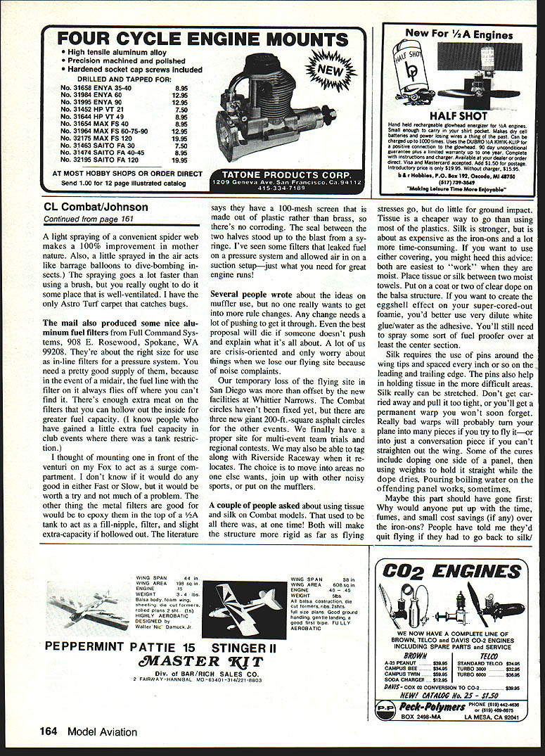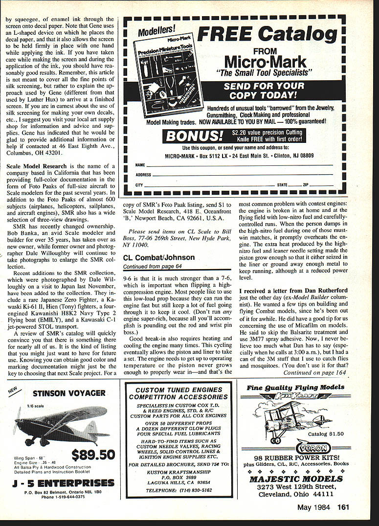 Control Line COMBAT Charlie Johnson HEY wheres engine review Ill have admit Ive waiting mail box new Bob Oge-tuned engine cut him little short lead time mailing engine him until last minute actual running tests will have put off until next time did talk him over phone explained some things did Fox Mark V also some other services offers way performance tuning Mark V trouble Bob double-ball-bearing engine because mate rial has removed crank make room chrome catch diameter front has large order properly seal against case/solid bearing area rear must smaller order fit ball-bearing prop erly total cost rework Mark V $5350 plus postage insurance send well-broken-in semi-destroyed engine Fox Mark IV earlier en gines $4350 new Super tigre 5-36 anyone wants old 0-21/35 Supertigre custom-tuned its mere $2750 Send orders Bob Oge 34W883 S James St Charles IL 60174 call 312 888-2289 Obviously get lot just chrome crank order Pat Wilicox used 16-powered models PAl featured replaceable foam wings ala Cartler one-piece bodies little heavier some other modelsbut made up difference lots poweri Note pacifier-tank fairings engines important thing get above factory job good fit moving parts Bob has special tool fitting rear bearing case just right tolerances Sure can fit own bearing scraping material out X-Acto can get right time can heat treat pistons fit chrome wrist pins change timing specifications should term engine being blue-printeds rather hop-up because except chroming its just engine put right have another Mark V bought same time Bob worked plan give reasonable break-in compare performance-wiseand also see hold up over season run ning Bob did caution take extra care balancing props engine cause once front seal goesthats recommended prop Top Flite 861/2 after break-in 9-6 cut 7-6 during break-in idea behind using cut-down Continued page 161 Paul Smith used Tigershark design Slow Combat L design based Wilkens Superstar wingwith about 8 years mods added Pauls models Its own name Tigershark General Lee etc appropriate logo Note minimum fuselage canopy per AMA rules Note fin has movable ruddera very unusual design feature Combat model elevator moved neutral position linkage makes rudder move right outside rudder help keep up line tension 64 Model Aviation Joe McKinzie Standing Mitchell Cleveland during Slow Combat match Houston fine action photo Frank Williams squeegee enamel ink through screen onto decal paper Note Gene uses L-shaped device places decal paper also allows screen held firmly place hand applying ink have taken care making screen during application ink should have rea sonably good results Remember article meant cover fine points silk screening rather explain ap proach used Gene different used Luther Hux arrive finished screen earnest about use silk screening making own decals etc suggest visit local art supply shop information advice sup plies Gene has indicated would glad provide additional information help contacted 46 East Eighth Ave Columbus OH 43201 Scale Model Research name company based California has providing full-color documentation form Foto Paaks full-size aircraft Scale modelers past several years addition Foto Paaks almost 600 subjects airplanes helicopters sailplanes aircraft engines SMR also has wide selection three-view drawings SMR has recently changed ownership Bob Banka avid Scale modeler builder over 35 years has taken over new owner former owner photog rapher Dale Willoughby will continue take photographs enlarge SMR col lection Recent additions SMR collection photographed Dale Wil loughly visit Japan last November have added collection clude rare Japanese Zero Fighter Ka waski Ki-61 II Hien Tony fighters fourengined Kawanishi H8K2 Navy Type 2 Flying boat EMILY Kawasaki C- 1 jet-powered STOL transport review SMRs catalog will quickly convince something nearly us kind listing might just want have future use Knowing can obtain good color marking documentation might just key choosing next Scale project STINSON VOYAGER Wing Span 68 Engine Size 35 alna Ply & Hardwood Conatruction Detailed Plaun Inatruction Booklet J -5 ENTERPRISES PO Box 82 Belmont Ontario NOL iBO phone 1519644-0375 rnrn v1odeI~ log Hundreds unusual tools borrowed Jewelry Gunsmithing Clock Making professional Imoael Making trades NOW AVAILABLE TO YOU DY MAIL /a guaranteed coupon send name address MICROMARK 5112 LX ast Main St Clinton NJ oaee L CITY E ZIP rnrn~ copy SMRs Foto Paak listing send $1 Scale Model Research 418 E Oceanfront B Newport Beach CA 92661 USA Please send items CL Scale Bill Boss 77-06 269th Street New Hyde Park NY 11040 CL Combat/Johnson Continued page 64 9-6 much stronger 7-6 important flipping highcompression engine Most people like use low-load prop because can run engine fast still keep lot fuel going through keep cool Dont run engine super-rich because youll accom plish pounding out rod wrist pin boss Good break-in also requires heating cooling engine times cycling eventually allows piston liner take set engine needs get up operating temperature piston never grows enough properly wear inand thats common problem contest engines engine broken home flying field low-nitro fuel carefullycontrolled runs person dumps high-nitro fuel during mustwin matches promptly overheats en gine extra heat produced high nitro fuel leaner needle setting made piston grow enough either seized liner ground away enough metal keep running although reduced power level received letter Daa Rutherford just other day ex-Model Builder colum nist wanted few tips building flying Combat models since hes out awhile did have good tip us concerning use Micafllm models said skip Balsarite treatment use 3M77 spray adhesive Now never lieve too much what Dan has say espe cially calls 300 am can 3M stuff use catch flies mosquitoes dont use Continued page 164 Fine Quality Flying Models 98 RUBBER POWER KITS plus Gliders C/L R/C Accessories Books Catalog 8150 4, 4444 MAJESTIC MODELS 3273 West 129th Street Cleveland Ohio 44111 May