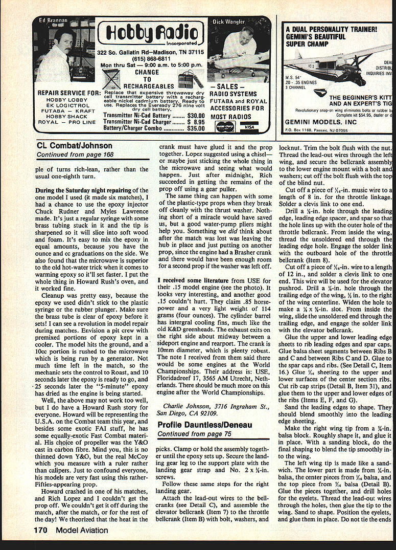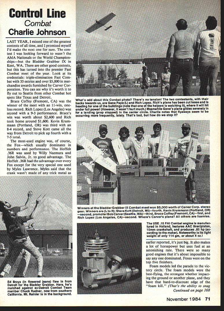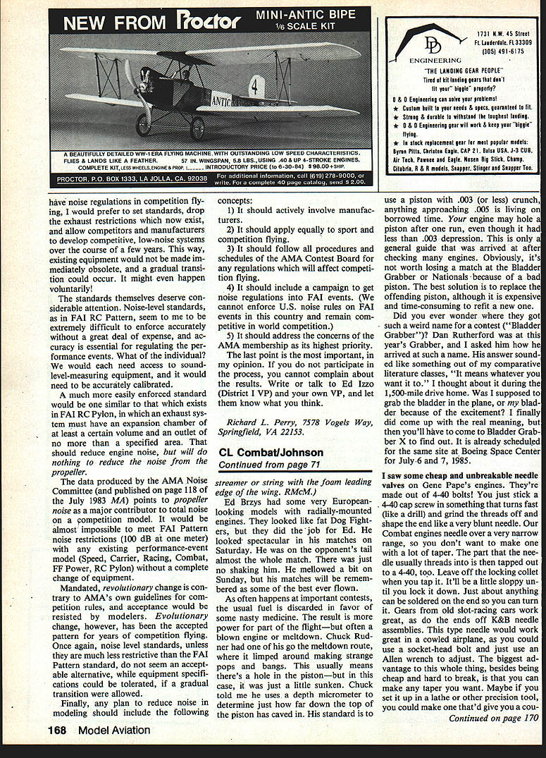 Contml Line Combat Charlie Johnson LAST YEAR missed greatest contests time promised myself Id make next sure con test looking forward wasnt AMA Nationals World Champion shipsbut Bladder Grabber IX Kent WA other good contests has turned premier Fast Combat meet year Look its credentials triple-elimination Fast Com bat 35 entries over $5000 mer chandise awards furnished Carver Cor poration can see its worth fly out Seattle other Combat hot spots like Texas Detroit Bruce Coffey Fremont CA winner meet 11-win loss record Rich Lopez Los Angeles second 9-3 performance Bruces win worth about $2600 Rich took home around $1600 Kevin Krum mann Portland OR third 8-4 record Steve Kott came way Detroit pick up fourth 7-3 total most-used engine course Foxwhich usually dominates numbers performance Hoffelt 36R used Willy Naemura John Salvin Jr good advantage Hoffelt 36R advantage over Fox except very special used Myles Lawrence Myles said crank wasnt made trick metal USE 15 FAI Combat engine manufac tured Holland features AAC Ilnerlplston 10mm crankshaft produces 85 hp ac cord Ing maker Noteworthy Its light weight 114 gin about 4 ozI earlier reported its just big also makes lot horsepower uses fuel astonishing rate good engines its about impossible say dominated Foxes top five finishers Foam models led parade vic tory circle foam models best-flying strongest whether impact ing ground another plane have hard-to-discount edge foam kill Thats ability snag Continued page 168 November 1984 71 Whats odd about Combat photo Theres no tenslonl two contestants backs towards us Gene Papa L Rich Lopez Richs plane has cut loose heading buildings note helpers watching will hit under full powerl However wasnt hurt much Meanwhile Genes plane glides serenely landing prop stopped center circle Charlie notes flyaways seem occurring frequently lately Thats bad stop Winners Bladder Grabber IX Combat meet won $5000 worth 0 Carver COP stereo gear Winners L R Steve Kott Detroit Mifourth Kevin Krummann Portland OR second promoter Bob CarverSeattle WAthird Bruce CoffeyFremont CAfirst Rich Lopez Los Angeics CAsecond Wheres Carvers plane others foamies Ed Brzys flowered jeans flew Detroit Bladder Grabber hes matched against ex-Detroit Combat Team member Chuck Rudner now southern California Mt Rainier background have noise regulations competition fly ing would prefer set standards drop exhaust restrictions now exist allow competitors manufacturers develop competitive low-noise systems over course few years way existing equipment would made im mediately obsolete gradual transi tion could occur might happen voluntarily standards themselves deserve con siderable attention Noise-level standards FAI RC Pattern seem to extremely difficult enforce accurately great deal expense ac curacy essential regulating per formance events What individual would need access soundlevel-measuring equipment would need accurately calibrated much easily enforced standard would similar exists FAI RC Pylon exhaust sys tem must have expansion chamber least certain volume outlet no specified area should reduce engine noise will nothing reduce noise propeller data produced AMA Noise Committee published page 118 July 1983 MA points propeller noise major contributor total noise ompetition model would almost impossible meet FAI Pattern noise restrictions 100 dB meter existing performance-event model Speed Carrier Racing Combat IT Power RC Pylon complete change equipment Mandated revolutionary change con trary AMAs own guidelines com petition rules acceptance would resisted modelers Evolutionary change however has accepted pattern years competition flying Once again noise level standards unless much less restrictive FAI Pattern standard seem accept able alternative equipment specifi cations could tolerated gradual transition allowed Finally plan reduce noise modeling should include following concepts 1 It should actively involve manufac turers 2 It should apply equally sport competition flying 3 It should follow procedures schedules AMA Contest Board regulations will affect competi tion flying 4 It should include campaign get noise regulations FAT events cannot enforce US noise rules FAI events country remain com petitive world competition 5 It should address concerns AMA membership its highest priority last point important opinion participate process cannot complain about results Write talk Ed Izzo District VP own VP let know what think Richard L Perry 7578 Vogels Way Springfield VA 22153 CL CombatlJohnson Continued page 71 streamer string foam leading edge wing RMcM Ed Brzys some very Europeanlooking models radially-mounted engines looked like fat Dog Fight ers did job Ed looked spectacular matches Saturday opponents tail almost whole match just no shaking him mellowed bit Sunday matches will remem bered some best ever flown As often happens important contests usual fuel discarded favor some nasty medicine result power part flightbut often blown engine meltdown Chuck Rud ner go meltdown route limped around making strange pops bangs usually means theres hole pistonbut case just little sunken Chuck told uses depth micrometer determine just far down top piston has caved standard 168 Model Aviation /%1131 NW 45 Street Ft Lauderdale Ft 33309 13051 491-6115 ENGINEERING THE LANDING SEAR PEOPLE Tired 1 kit landing gears dent fIt yeur biggie property O & 0 Engiueenag can seine year problems * Custom built te yoer needs & specs guaranteed te tit * Strong & durable withstand teogheot landing * 0 & 0 Eugineering gear will work & keep veer biggie ttyiug * In utuck replacement gear ter west popular models Byrne PIth Chaisten Eagle CAP 21 Balsa USA J-3 CUR Air Tuch Puwnee Eagle Nesee Rig Slick Chump Citabrla R & R models Snapper Stinger nsd Snapper Too use piston 003 less crunch anything approaching 005 living borrowed time engine may hole piston after run though hac less 003 depression general guide arrived after checking engines Obviously its worth losing match Bladder Grabber