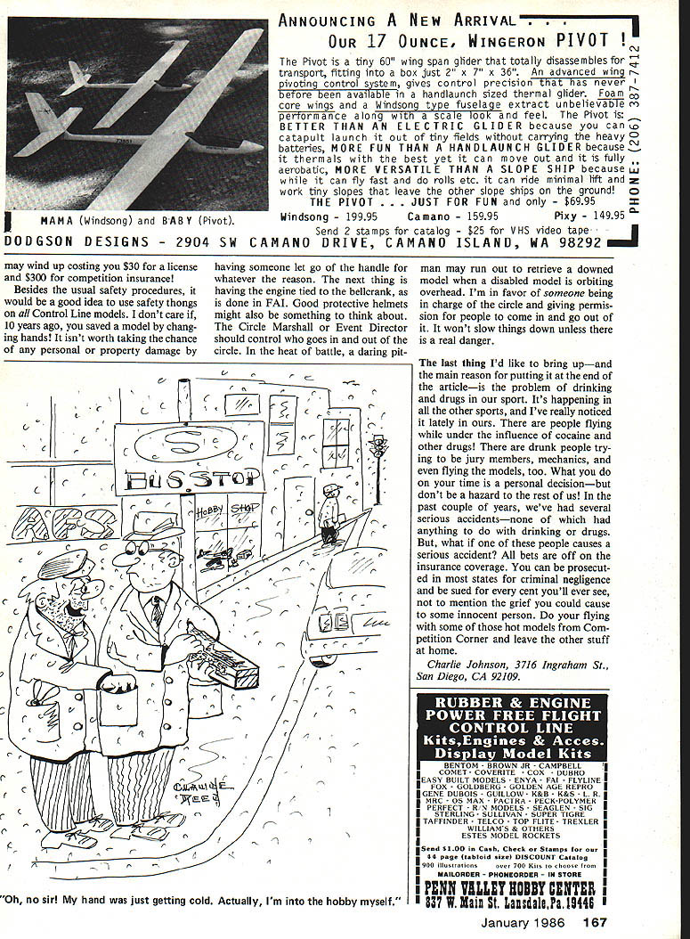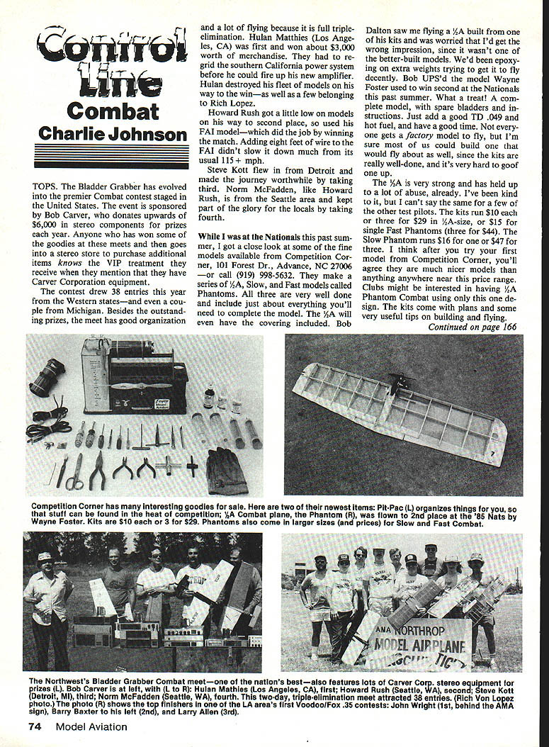 iiii Combat Charlie Johnson TOPS Bladder Grabber has evolved premier Combat contest staged United States event sponsored Bob Carver donates upwards $6000 stereo components prizes year Anyone has won some goodies meets goes stereo store purchase additional items knows VIP treatment receive mention have Carver Corporation equipment contest drew 38 entries year Western statesand cou ple Michigan Besides outstand ing prizes meet has good organization lot flying because full triple elimination Hulan Matthies Los Ange les CA first won about $3000 worth merchandise re grid southern California power system before could fire up new amplifier Hulan destroyed fleet models way winas well few belonging Rich Lopez Howard Rush got little low models way second place used FAI modelwhich did job winning match Adding eight feet wire FAI didnt slow down much its usual 115 mph Steve Kott flew Detroit made journey worthwhile taking third Norm McFadden like Howard Rush Seattle area kept part glory locals taking fourth Nationals past sum mer got close look some fine models available Competition Cor ner 101 Forest Dr Advance NC 27006 call 919 998-5632 make series AA Slow Fast models called Phantoms three very well done include just about everything youll need complete model AA will have covering included Bob Dalton saw flying AA built kits worried Id get wrong impression since wasnt better-built models Wed epoxy ing extra weights trying get fly decently Bob UPSd model Wayne Foster used win second Nationals past summer What treat com plete model spare bladders structions Just add good TD 049 hot fuel have good time gets factory model fly Im sure us could build would fly about well since kits really well-done its very hard goof up AA very strong has held up lot abuse already Ive kind cant say same few other test pilots kits run $10 three $29 AA-size $15 single Fast Phantoms three $44 Slow Phantom runs $16 $47 three think after try first model Competition Corner youll agree much nicer models anything anywhere near price range Clubs might interested having AA Phantom Combat using de sign kits come plans some very useful tips building flying Continued vase 166 Northwests Bladder Grabber Combat meetone nations bestalso features lots Carver Corp stereo equipment r rizes L Bob Carver left wIth 1 R Huian Mathies Los Angeles CA first Howard Rush Seattle WA second Steve Kott Detroit Ml third Norm McFadden Seattle WA fourth twoday tri leellmination meet attracted 38 entries Rich Von Lopez photo photo R shows p finishers LA areas first VoodooIFox 35 contests John Wright 1st behind AMA sign Barry Baxter left 2nd Larry Alien 3rd 74 Model Aviation di Competition Corner has interesting goodies sale two newest Items PitPac L organizes things stuff can found heat competition /2A Combat plane Phantom R flown 2nd place 85 Nate Wayne Foster Kits $10 3 $29 Phantoms also come larger sizes prices Slow Fast Combat DGA DESIGNS Full Body Pilot Kit Lightest Pilot availablo eLifelike vinyl la tex rubbor parts Easy assemble finish Build either barnstormer sportsman pilot sKit contains pilot head hands boots helmet cap goggles full templates easy instructions Fully positionable & moveable Some simple sewing required j IF WeightPrice 1/6Scale2oz5$ 795 1/4 Scale4oz$ 995 ll3Scale6oz*$1695 Weightmay vary depending material used construction DGA DESIGNS Bust Pilot Kit Weight 1/6 Scale 75 oz 1/4Scale 1Soz 1/3 Scale 225 oz Price 595 795 $1495 Lightest bust pilot available Lifelike vinyl latex rubber parts Easy assemble finish Build either barnstormer sportsman pilot Kit contains pilot head helmet cap goggles jacket instructions See dealer order direct Add $100 shipping direct orders Send $100 current catalog Dealers inquiries invited NYS Residents add 7 percent sales tax Send Check MO Allow 3 weeks check clearSorry-No COD H ELECTRIC POWER OR GLOENGINES PROP HUB ASSEMBLY # iOU 1 size engines electric motor equivalent Weight 85 grams $1500 PROP BLADES FOR HUB # 109 lable 7s 25 7x 3 7s 35 Bs 4 $400 per blade $800 per pair PlOP HUB ASSEMBLY # 110 049 051 engines electric motor equivalent Weight 5 grams $1500 PROP BLADES FOR HUB # 110 Available 6s 3 $400 per blade $800 per pair PROP HUB ASSEMBLY #111 engines electric motor equivalent 20 grams 62000 PROP BLADES FOR HUB # 111 lable 9 x 4 10s 4 Iis 4 $500 per blade $1000 per pair Send SSAE tor catalog sheet complete line ' U d h di eptember P-39 nose gear cover-door opera tionFinishing techniques J Patrolia October U/Tronic System Clancy Arnold November Pinked-edge rib tapes December Nationals coverage Next month listing 1985 will included Send items CL Scale Bill Boss 77-06 269th St New Hyde Park NY 11040 CL Combat/Johnson Continued page 74 few days after getting model received some pictures pit-pac Bob Dalton uses both Combat Racing Hed seen pit-box setups Nats some bare minimum others full house everything kitch en sink boxes clut tered non-essential junk match lost fumbling through layers stuff trying find needed tool part Losing match ground hardest ways get knocked out eliminations its common Fast Slowand worse FAI two models 4A lit tle devils cranky Bobs pit-pac based Goldberg Mini-Tote few modifications Hes added fuel can end Sig Fuelers other end put Gb-Bee small tray built handle important stuff top belongs drawer divided compartments keep little things getting mixed up everything else subtle design features like having syringes elevated keep goop out nozzles primary backup Gb-Bees positioned mechanic can see meter Complete plans precut plywood pieces necessary modify Goldberg Mini-Tote available Competition Corner Most hand tools Sears plans list along Sears stock numbers Turn cardboard box pit-boxes get phone Competition Corner theyll able make least look like pro should back pages magazine now Ill tell latest thoughts safety Combat lot dangerous wed like admit majority accidentsincluding never turned AMAs insurance carrier hadnt own medical insurance would have cost several thousand dollars Most