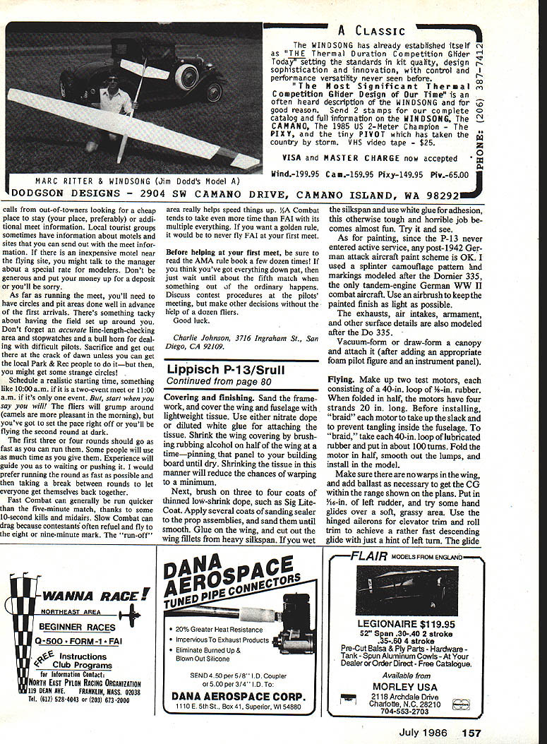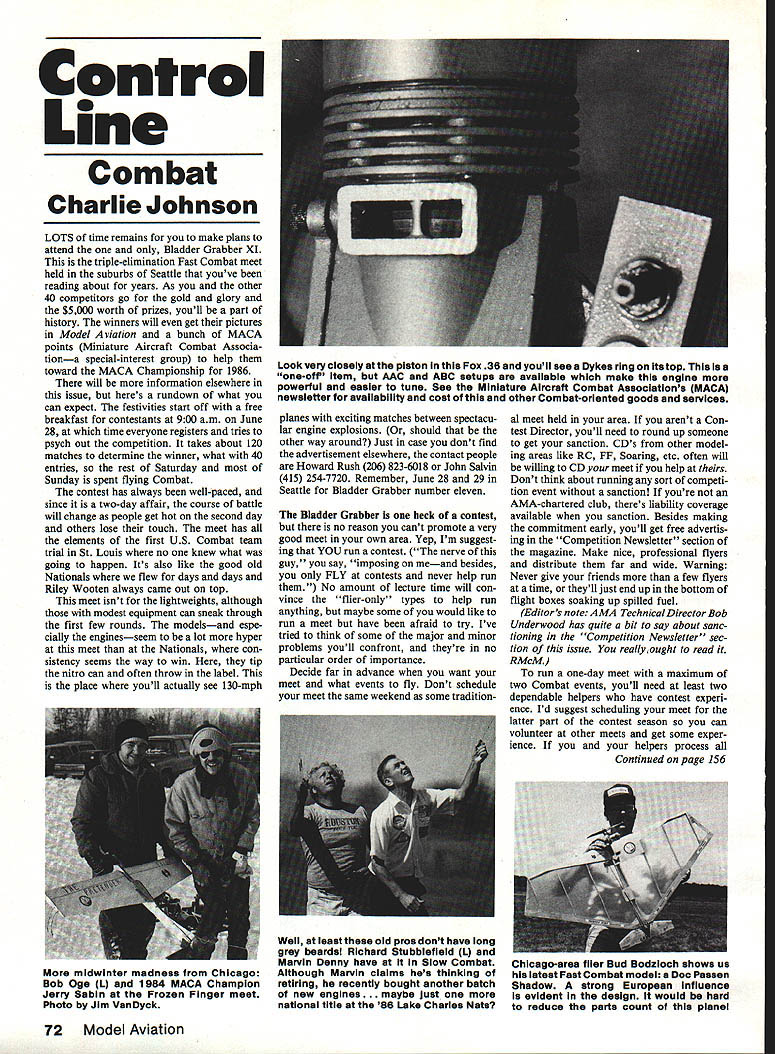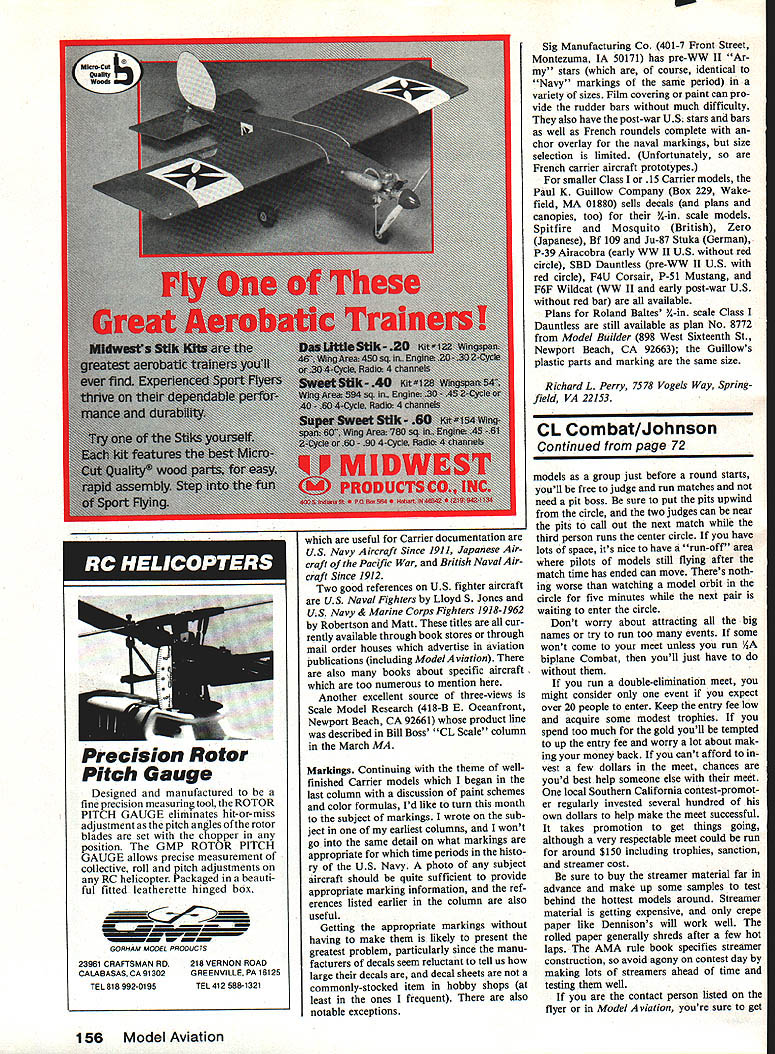 Control Line Combat Charlie Johnson LOTS time remains make plans attend Bladder Grabber XI triple-elimination Fast Combat meet held suburbs Seattle youve reading about years As other 40 competitors go gold glory $5000 worth prizes youll part history winners will get pictures Model Aviation bunch MACA points Miniature Aircraft Combat Associa tiona special-interest group help toward MACA Championship 1986 will information elsewhere issue heres rundown what can expect festivities start off free breakfast contestants 900 am June 28 time everyone registers tries psych out competition takes about 120 matches determine winner what 40 entries rest Saturday Sunday spent flying Combat contest has always well-paced since two-day affair course battle will change people get hot second day others lose touch meet has elements first US Combat team trial St Louis no knew what going happen Its also like good old Nationals flew days days Riley Wooten always came out top meet isnt lightweights although modest equipment can sneak through first few rounds modelsand espe cially enginesseem lot hyper meet Nationals con sistency seems way win tip nitro can often throw label place youll actually see 130-mph planes exciting matches between spectacu lar engine explosions should other way around Just case dont find advertisement elsewhere contact people Howard Rush 206 823-6018 John Salvin 415 254-7720 Remember June 28 29 Seattle Bladder Grabber number eleven Dladder Grabber heck contest no reason cant promote very good meet own area Yep Im suggest ing YOU run contest nerve guy say imposing meand besides FLY contests never help run No amount lecture time will con vince flier-only types help run anything maybe some would like run meet have afraid try Ive tried think some major minor problems youll confront theyre no particular order importance Decide far advance want meet what events fly Dont schedule meet same weekend some traditional meet held area arent Con test Director youll need round up someone get sanction CDs other model ing areas like RC FF Soaring etc often will willing CD meet help Dont think about running sort competi tion event sanction youre AMA-chartered club theres liability coverage available sanction Besides making commitment early youll get free advertis ing Competition Newsletter section magazine Make nice professional flyers distribute far wide Warning Never give friends few flyers time theyll just end up bottom flight boxes soaking up spilled fuel Editors note AMA Technical Director Bob Underwood has quite bit say about sanc tioning Competition Newsletter sec tion issue really ought read RMcM run one-day meet maximum two Combat events youll need least two dependable helpers have contest experi ence Id suggest scheduling meet latter part contest season can volunteer other meets get some exper ience helpers process Continued page 156 72 Model Aviation Look very closely piston Fox 36 youli see Dykes ring its top isa one-off item AAC ABC setups available make engine powerful easier tune See Miniature Aircraft Combat Associations MACA newsletter availability cost other Combat-oriented goods services midwinter madness Chicago Bob Oge CL 1984 MACA Champion Jerry Sabin Frozen Finger meet Photo Jim VanDyck Well least old pros dont have long grey beardsl Richard Stubbiefleld 1 Marvin Denny have Slow Combat Although Marvin cialma hes thinking retiring recently bought another batch new engines. maybe just national title 86 Lake Charles Nats Chicago-area flier Bud Bodzloch shows us latest Fast Combat model Doc Passen Shadow strong European influence evident design would hard reduce parts count planel Precision Rotor Pitch Gauge Designed manufactured fine precision measurin tool ROTOR PITCH GAUGE eliminates hit-or-miss adjustment pitch angles rotor blades set chopper position GMP ROTOR PITCH GAUGE allows precise measurement collective roll pitch adjustments RC helicopter Packaged beauti ful fitted leatherette hinged box C GORHAM MODEL PROOUTS 23961 CRAFTSMAN RD CALABASAS CA 91302 TEL 818 992-0195 218 VERNON ROAD GREENVILLE PA 16125 TEL412 588-1321 useful Carrier documentation US Navy Aircraft Since 1911 Japanese Air craft Pacific War British NavalAir craft Since 1912 Two good references US fighter aircraft US Naval Fighters Lloyd S Jones US Navy & Marine Corps Fighters 1918-1962 Robertson Matt titles cur rently available through book stores through mail order houses advertise aviation publications including ModelAviation also books about specific aircraft too numerous mention Another excellent source three-views Scale Model Research 418-B E Oceanfront Newport Beach CA 92661 product tine described Bill Boss CL Scale column March MA Markings Continuing theme wellfinished Carrier models began last column discussion paint schemes color formulas Id like turn month subject markings wrote sub ject earliest columns wont go same detail what markings appropriate time periods histo ry US Navy photo subject aircraft should quite sufficient provide appropriate marking information ref erences listed earlier column also useful Getting appropriate markings having make likely present greatest problem particularly since manu facturers decals seem reluctant tell us large decals decal sheets commonly-stocked item hobby shops least ones frequent also notable exceptions Sig Manufacturing Co 401-7 Front Street Montezuma IA 50171 has pre-WW II Ar stars course identical Navy markings same period variety sizes Film covering paint can pro vide rudder bars much difficulty also have post-war US stars bars well French roundels complete chor overlay naval markings size selection limited Unfortunately French carrier aircraft prototypes smaller Class 15 Carrier models Paul K Guillow Company Box 229 Wake field MA 01880 sells decals plans canopies too Y4-in scale models Spitfire Mosquito British Zero Japanese Bf 109 Ju-87 Stuka German P-39 Airacobra early WW II US red circle SBD Dauntless pre-WW II US red circle F4U Corsair P-51 Mustang F6F W