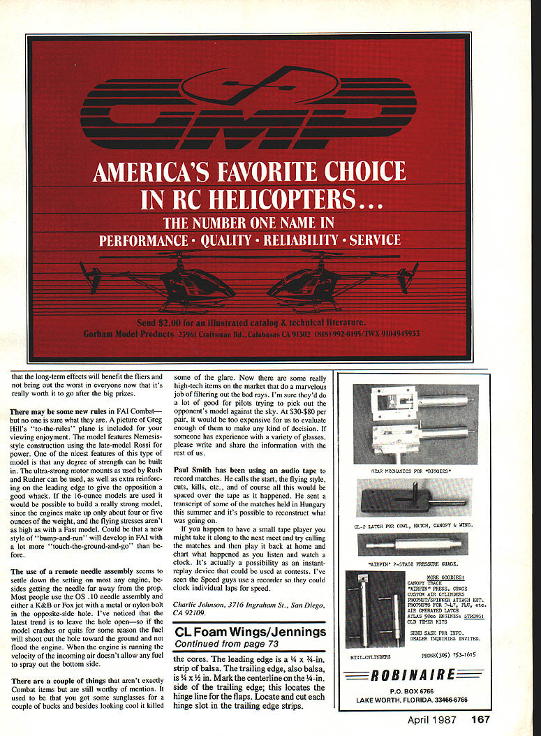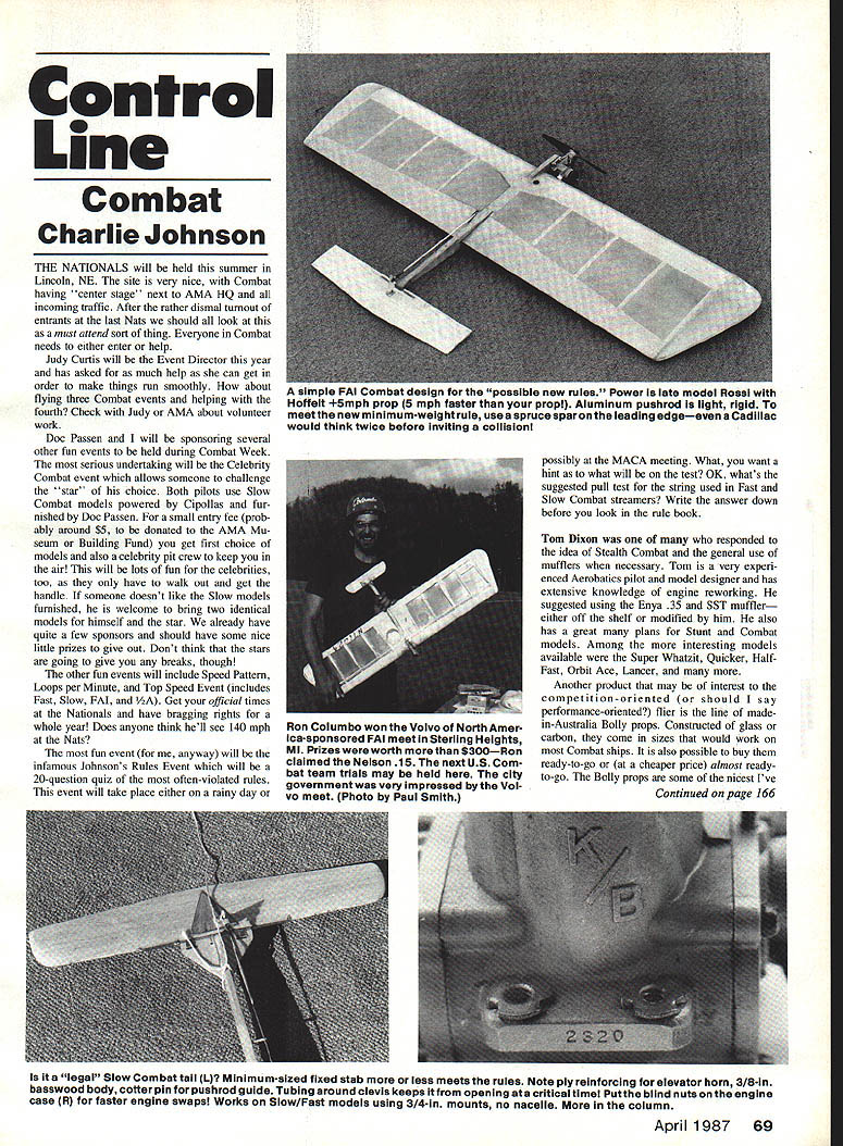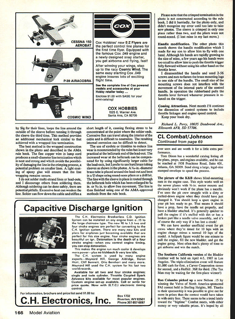 Control Line Combat Charlie Johnson THE NATIONALS will held summer Lincoln NE site very nice Combat having center stage next AMA HQ incoming traffic After rather dismal turnout entrants last Nats should look must attend sort thing Everyone Combat needs either enter help Judy Curtis will Event Director year has asked much help can get order make things run smoothly about flying three Combat events helping fourth Check Judy AMA about volunteer work Doe Passen will sponsoring several other fun events held during Combat Week serious undertaking will Celebrity Combat event allows someone challenge star choice Both pilots use Slow Combat models powered Cipollas fur nished Doe Passen small entry fee prob ably around $5 donated AMA Mu seum Building Fund get first choice models also celebrity pit crew keep air will lots fun celebrities too have walk out get handle someone doesnt like Slow models furnished welcome bring two identical models himself star already have quite few sponsors should have some nice little prizes give out Dont think stars going give breaks though other fun events will include Speed Pattern Loops per Minute Top Speed Event includes Fast Slow FAI Get official times Nationals have bragging rights whole year Does anyone think hell see 140 mph Nats fun event anyway will infamous Johnsons Rules Event will 20-question quiz often-violated rules event will take place either rainy day possibly MACA meeting What want hint what will test OK whats suggested pull test string used Fast Slow Combat streamers Write answer down before look rule book Tom Dixon responded idea Stealth Combat general use mufflers necessary Tom very experi enced Aerobatics pilot model designer has extensive knowledge engine reworking suggested using Enya 35 SST muffler either off shelf modified him also has great plans Stunt Combat models Among interesting models available Super Whatzit Quicker HalfFast Orbit Ace Lancer Another product may interest competition-oriented should say performance-oriented flier line madein-Australia Bolly props Constructed glass carbon come sizes would work Combat ships also possible buy ready-to-go cheaper price almost readyto-go Bully props some nicest Ive Continued page 166 legal Slow Combat tail L Minimum-sized fixed stab less meets rules Note ply reinforcing elevator horn 3/8-in basswood body cotter pin pushrod guide Tubing around cievis keeps opening critical time Put blind nuts engine case R faster engine swaps Works Slow/Fast models using 3/4-in mounts no nacelle column April 1987 69 simple FAI Combat design possible new rules Power late model Rossi Hoffeit 5mph prop 5 mph faster prop Aluminum pushrod light rigid meet new minimum-weight rule use spruce spar leading edgeeven Cadillac would think twice before inviting collision Ron Columbo won Volvo North Amer ica-sponsored FAI meet Sterling Heights Ml Prizes worth $300Ron claimed Nelson 15 next US Com bat team trials may held city govern ment very impressed Vol vo meet Photo Paul Smith Sig lines loops line around outside sleeve before running through sleeve third time method provides additional mechanical lock similar achieved wrapped line termination best method wrapped construction shown photo described AMA rule book fine copper wire lamp cord produces small-diameter line termination neat strong avoids possibil ity damaging line inthe crimping process potential problem smaller lines light coat ing epoxy glue will ensure line wrapping remains secure solder multi-strand lines lead-outs discourage others soldering Although soldering can done safely potential pitfalls Excessive heat can weaken line Solder can flow down cable stiffen CESSNA 150 AEROBAT w ~ Cox Hobbies new E-Z Flyers perfect control line planes first time flyer Equipped famous Cox 049 engine newly designed snap starter get airborne flying fast After winning wings step up racy Cosmic Wind same easy starting Cox 049 engine insures lots exciting flight time See complete line Cox powered models accessorIes Hobby retailer today Enclose $100 SASE mIni-catalog COX HOBBIES 1525 E Warner Ave Santa Ana CA 92705 COSMIC WIND short length causing flexing stress concentrated point solder ends Corrosive flux can travel along interior cable difficult neutralize resulting internal corrosion can difficult detect use eyelets thimbles reduce line wear recommended rules very practical bellerank end lead-out increased wear bellerank can compen sated using significantly larger cable lead-outs butl prefer use hard brass tubing sleeves shown photos 14g-in-diameter brass tube placed around lead-out bent U shape using round-nose pliers drill bit line sleeve place routed through belicrank hole has enlarged 5/ 142 allow free movement line finished using AMA-approved methods rule book Capacitive Discharge Ignition CH Electronics Breakerless CD Ignition System can installed engine 15 large chainsaw type new 90 15 two four stroke engines perfect converting CH Ignition system new kits plans airplanes just becoming available perfect size engine Pour stroke engines ore beautiful ign Detonation death four stroke enginewhen control engine timing can stop detonation makes engine run much cooler 8 develops mare power plus no kickback & very low idle CH system used engine expertsMaynard Hill George Aidridge Doran Hiatt Cliff Bennett Otto Bernhort Maynard Hill used CH system last two world records Available two four stroke engines single twin cyiinder Throttle Coupled Spark Advance kits available popular engines Custom enginesetup available Call write price quote Now IETCl electronic timing control information brochure price list send $100 CH Electronics Inc Box 1732 Riverton WY 82501 Phone 307-857-6897 Please note crimped termination photo constructed according rule book did hurriedly photo didnt recognize error until too late take new photos sleeve crimped place rather two pliers round-nosed lost last move Handle modIfication other photo month shows handle modification made son allow him fly hand Althou