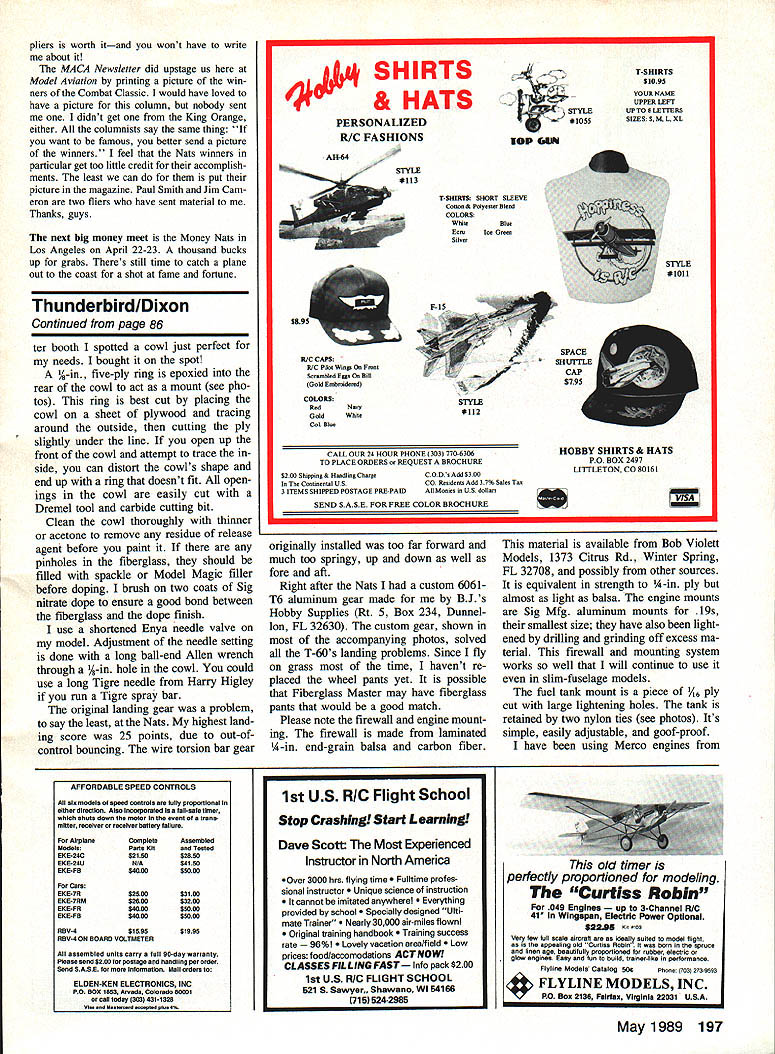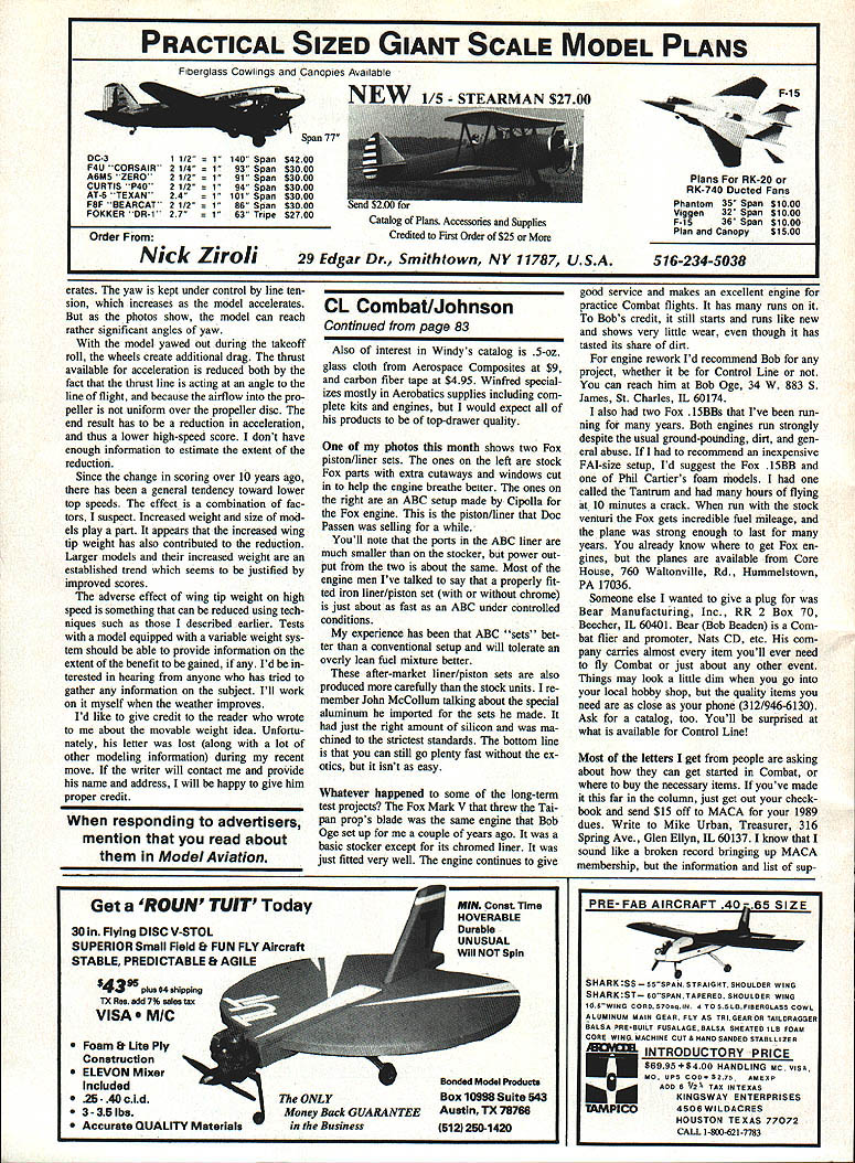 PROP PROBLEMS Last time mentioned trying fiberglass Taipan 8 x 6 inexpensive alternative wood props nor mally used Fast Combat failure blade flying off ran up Hof felt 36R might understandable cause terrifically high rpm mill puts out However weve another failurethis time Fox Mark V doesnt rev nearly high Both props air bubbles hub areanearly 30% area doesnt help prop stay together Both props same production lot could batch problems first experience using 8 x 6 know using Taipan 7 x 4 props latter came different production lots judging fact props different colors Wed already ordered 60 props before second failure occurred going saw up five six see anything wrong hub area prop really works well hangs gether would shame able use However potential bodily harm too great plus fact blade thrown flight usually means plane will rattled bits resulting vibration Texas Combat Classic won John Stubblefield Steve Hills second team mate Chuck Rudner third John local Houston fliers Steve Chuck Los Angeles area Top prize $2000 sponsor Bob Carver made streamer tied onto John rest contestants spent final hours day trying get cuts $100 bills Stubblefield Rudner used models familiar style Hills made Texas debut carbon-boom models final tally Stubblefield 10-1 score Hills 9-3 Rudner 8-3 An interesting side note Legend Bob Burch entered meet tied fifth place 6-3 score MACA Miniature Aircraft Combat Asso ciationEd Top Twenty standings De cember 21 1988 Michael Willcox leading field 140 total points followed Paul Smith 135 Richard Stubblefield 127 other person three figures John Stubblefield 113 Though results arent official yet doesnt look like Paul Smith will have chance since contest season Michigan pretty much shut down winter overall championship determined add ing up points Fast Slow FAI Combat some event point totals interesting Canadian Mike Thiessen leads pack Slow Combat 65 points fol lowed Paul Smith 57 Several fliers have scores forties highest score Fast Combat 48 looks like Mike Paul fly lot Slow Combat meets win lot share too Windy Urtnowski runs Pro-Stunt Pro ducts sent some engine pads have 20 off set Theyd work both profile built-up models could used corrective thrust ad justments extra offset its windy just nice hard surface mount en gine Theyre made Dupont nylon glass-filled slot engine can en larged drilled suit needs could also just cut pads apart use solely thrust offset adjustment pads $198 available Pro-Stunt 9 Union Ave Little Ferry NJ 07643 Continued page 196 Worlds largest free-for-all Combat match followed CL World Champs Kiev USSR L Soviet pit man shown launching John Stubblefields model right Don Cranfill launches Slow Combat model pilot Michael Wilicox 88 Nats Bill Estill steps back out way after starting engine can see battery cables flying back behind Bill plane already out Dons hand Charlies photo emphasize pitting art form Pilot pit men Houston TX May 1989 83 Conoi Line Combat Charlie Johnson 3716 Ingraham St San Diego CA 92109 Soviet FAI Combat model minus its engine mounts Shape layout typical Wing spar massive center tapers greatly tip Trailing edge hardwood goes tip wing Just tape weight outboard wing tip testing Cipolla 15 serves model Pro-Stunt Products engine pad 2 offset Item molded Dupont glass-filled nylon can modified fit engines Theres info column Get out pocket knives files Modi fied Fox piston/liner set L windows vs Foxolla set made Cipolla R Note radical difference port sizes between two PRACTICAL SIZED GIANT SCALE MODEL PLANS F glass Cow ngs Canop es Ava able NTIAJF-i5 4 Span 77 DC-a11/2 1140 Span$4200 F4U CORSAIR2 1/4 P93 Span$3000 A6M5 ZERO2 1/2 191 Span$3000 s RK-20 CURTIS P402 1/2 154 Span$3000 40 Ducted Fans AT-6 TEXAN24 1101 Span$3000 F8F BEARCAT2 1/2 i86 Span$3000Phantom 35 Span $1000 FOKKER DR-i2 7 163 Tripe$2700Viggon 32 Span $1000 ______________________________________Catalog P1Accessories SuppliesF-iS 36 Span $1000 Credited toFirst Order $25 MorePlan Canopy $1500 Order Nick Ziroli29 Edgar Dr Smithtown NY 11787 USA516-234-5038 crates yaw kept under control line ten-good service makes excellent engine sion increases model acceleratesCL Combat/Johnsonpractice Combat flights has runs photos show model can reachTo Bobs credit still starts runs like new rather significant angles yawContinued page 83and shows very little wear though has model yawed out during takeoff Also interest Windys catalog 5oztasted its share dirt roll wheels create additional drag thrust engine rework Id recommend Bob available acceleration reduced both theglass cloth Aerospace Composites project whether Control Line fact thrust line acting angle theand carbon fiber tape $495 Winfred special-You can reach him Bob Oge 34 W 883 S line flight because airflow pro-tzes mostly Aerobatics supplies including com-James St Charles IL 60174 peller uniform over propeller disc Theplete kits engines would expect also two Fox lSBBs Ive runend result has reduction accelerationhis products top-drawer qualityning years Both engines run strongly thus lower high-speed score dont havedespite usual ground-potinding dirt gen enough information estimate extent theOne photos month shows two Foxeral abuse recommend inexpensive reductionpiston/liner sets ones left stockFAI-size setup Id suggest Fox Since change scoring over 10 years agoFox parts extra cutaways windows Cutone Phil Cartiers foam models has general tendency toward lowerin help engine breathe better ones oncalled Tantrum hours flying top speeds effect combination fac-the right ABC setup made Cipolla forat 10 minutes crack run stock tors suspect Increased weight size mod-the Fox engine piston/liner Docventuri Fox gets incredible fuel mileage els play part appears increased wingPassen selling whilethe plane strong enough last tip weight has also contributed reduction Youll note ports ABC liner areyears already know get Fox en Larger models increased weight anmuch smaller stocker power Out-gines planes available Core established trend seems justifie