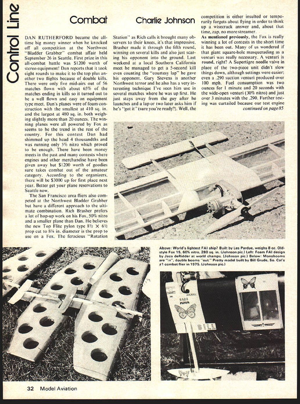 Combat DAN RUTHERFORD became alltime big money winner knocked off competition Northwest Bladder Grabber combat affair held September 26 Seattle First prize all-combat battle $1200 worth stereo equipment Dan reports took eight rounds make top plus other two flights because double kills five mid-airs out 56 matches flown about 65% matches ending kills turned out well flown easy equipment type meet Dans planes foam con struction smallest 410 sq largest 480 sq both weigh ing slightly 20 ounces win ning planes powered Fox seems trend rest country contest Dan shimmed up head 4 thousandths running 5% nitro proved enough have money meets past contests engines other merchandise have given away $1200 worth goodies sure takes combat out amateur category According organizers will $3000 up first place next year Better get plane reservations Seattle now San Francisco area fliers also com peted Northwest Bladder Grabber have different approach ulti mate combination Rich Brasher prefers lot hop-up work Fox 50% nitro smaller plane Dan believes new Top Flite pylon type 8 prop cut 81/4 diameter prop use Fox ferocious Rotation Charlie Johnson Station Rich calls brought ob servers knees its impressive Brasher made through fifth round winning several kills also just scar ing opponent ground Last weekend local Southern California meet managed get 5-second kill counting courtesy lap gave opponent Gary Stevens another Northwest terror also has very teresting technique Ive seen him use several matches up first just stays away guy after launches lap two later asks him hes got sure youre ready Well competition either insulted tempo rarily forgets about flying order think up wisecrack answer about time zap no streamer As mentioned previously Fox really winning lot contests short time has out us wondered giant square-hole masquerading venturi really necessary venturi round right Supertigre needle valve place two-piece unit didnt slow things down although settings easier 290 suction venturi produced over 100 mph Fuel consumption two ounces 1 minute 20 seconds wide-open venturi 30% nitro just over 3 minutes 290 Further test ing curtailed because test engine continued page 85 32 Model Aviation Above Worlds lightest FAI ship Built Les Pardue weighs 8 oz Old style Fox 15 60% nitro 280 sq Johnson picl Left Foam FAI design Jaco deRidder world champs Johnson picl Below Monobooms double booms Out Pretty model built Bill Grude So Cals #1 combatflierin 1975 Johnson pic d modelers have have using last 25 years will continue use years come Made building repairing wood models Super Model Cement strong clear quick drying fuel proof tube features long thin tip precise application re-sealable either pin cap Cat No 201 oz tube 0c LARGE ECONOMY DEVCON 30 MINUTE EPOXY IN BIG 4 OZ NONBREAKABLE SQUEEZE BOTTLES ideal modelers cement bonds metals wood fiberglas plastics Clear fuel proof HARDENER FOR 5 MINUTE EPOXY 9 oz combined wt No 209 5 Minute No 33 30 Minute RO PRODUCTS INCORPORATED onner Road Wauconda Illinois 60084 USA CL Combat/Johnson continued page 32 broke crank nothing new combat engines something everyone hoped would corrected latest design effort anyone consider ing buying motors use Slow Combat would advised seal up gap between suction ven turi case since very erratic needle settings will result Either 5-minute epoxy Luthers Goose Grease may used since just heat soldering gun will loosen epoxy enough remove venturi youre ready Fast Combat Fox engine will last long time suction wide open lot ni tro life expectancy crank about 25-30 hard runs regardless grinding radius things polishing special heat treating Dan Rutherford suggests keep ing track number runs crank just replacing after 30 hard runs before big meet done years Supertigre called preventive maintenance good way save damaging cases losing matches because blown cranks solution problem designed motor Rich Brasher has some test cranks made up machinst San Fran cisco area using four different alloys reported two broke right off other two have survived three times number runs hed ever gotten out Fox crank has some hardest working engines going business 120 mph Seattle fairly large plane can approach 100 loops per minute best part may cranks will made available general combat crowd 56-10 depending heat treating quantity ordered Rutherford has new cranks motor ders Brasher try break Lets hope Duke Fox can overcome crank problem really want informed about combat might join biggest best organization its kind Miniature Aircraft Combat Assoc MACA has nearly 500 members over USA rest world Members re ceive monthly newsletter pictures latest combat news results Membership available writing Tom Southern 2207 Paul Longview TX 75601 sure enclose full name address AMA MAAC number $500 live USA $1000 overseas just received four newsletters shirt fellow combat flier Sweden name Ingemar Larsson edits really class newsletter Swedish control-line group called SMAKA control-line events covered looks like favorite combat copies contained pages fine pictures articles Swedish well can almost read Id met Ingemar World Champs wed agreed exchange SMAKA MACA T-shirts Americans February 1977 85 SUPER MODEL GOOD OLD FASHIONED MODEL AIRPLANE CEMENT FOR WOOD MODELS Q&O~o S 9 CAT NO 201 60c J Rich Brasher Rotation Station ap proaches 100 loops minute 120 mph Fox 8-1/2 x 6-1/2 cut 8-1/4 Foam wing plastic film tightened holding briefly oven practice works OK Johnson pic MORE powerYELLOW m edPROPELL.. Bade G~ e\ee5Taco e 2 bY~OBlade thSIZeSeach 53544 6364354 86854 96106i 3 Blade Tractoc 5354 636-4504 3 Blade Pusiw 63504 CL Combat continued generally short goodies trade international meetings Most other contestants bring bags full badges other souvenirs own coun try trade MACA stickers gone first day traded off Bell Helmet beannie anyone going international meet Id suggest stocking up goodies trade off printing should know will California Nationals year chances rain either two proposed sites would practical