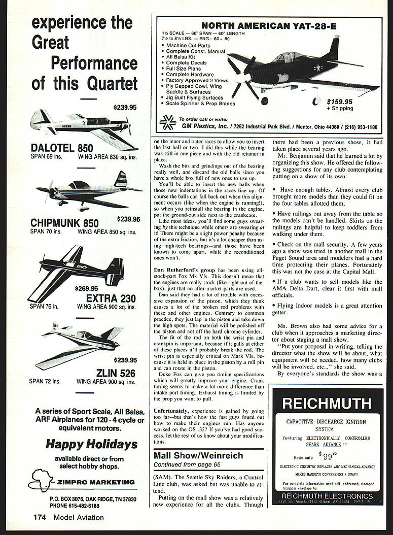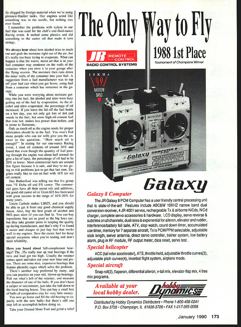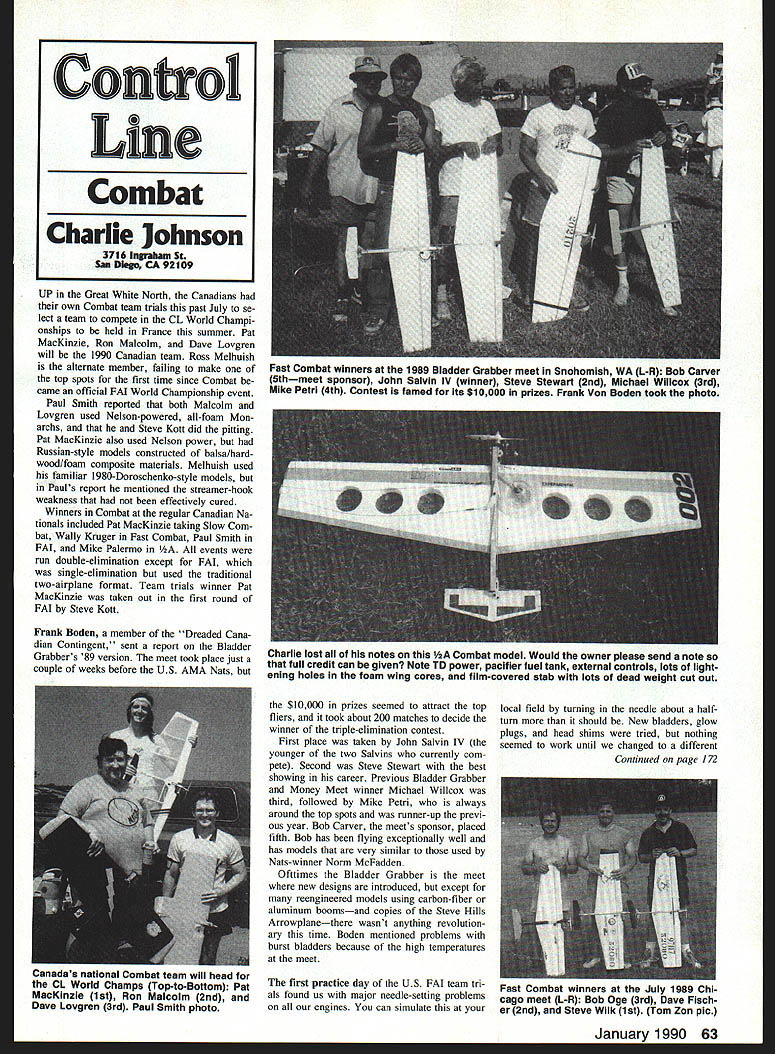UP Great White North Canadians own Combat team trials past July se lect team compete CL World Champi onships held France summer Pat MacKinzie Ron Malcolm Dave Lovgren will 1990 Canadian team Ross Melhuish alternate member failing make top spots first time since Combat came official FAI World Championship event Paul Smith reported both Malcolm Lovgren used Nelson-powered all-foam Mon archs Steve Kott did pitting Pat MacKinzie also used Nelson power Russian-style models constructed balsa/hard wood/foam composite materials Melhuish used familiar 1980-Doroschenko-style models Pauls report mentioned streamer-hook weakness effectively cured Winners Combat regular Canadian Na tionals included Pat MacKinzie taking Slow Com bat Wally Kruger Fast Combat Paul Smith FAI Mike Palermo /2A events run double-elimination except FAI single-elimination used traditional two-airplane format Team trials winner Pat MacKinzie taken out first round FAI Steve Kott Frank Boden member Dreaded Cana dian Contingent sent report Bladder Grabbers 89 version meet took place just couple weeks before US AMA Nats $10000 prizes seemed attract top fliers took about 200 matches decide winner triple-elimination contest First place taken John Salvin IV younger two Salvins currently com pete Second Steve Stewart best showing career Previous Bladder Grabber Money Meet winner Michael Willcox third followed Mike Petri always around top spots runner-up previ ous year Bob Carver thc mccts sponsor placed fifth Bob has flying exceptionally well has models very similar used Nats-winner Norm McFadden Ofttimes Bladder Grabber meet new designs introduced except reengineered models using carbon-fiber aluminum boomsand copies Steve Hills Arrowplanethere wasnt anything revolution ary time Boden mentioned problems burst bladders because high temperatures meet first practice day US FAt team tri als found us major needle-setting problems engines can simulate local field turning needle about halfturn should New bladders glow plugs head shims tried nothing seemed work until changed different Continued page 172 January 1990 63 Control Line Combat Charlie Johnson 3716 Ingraham St San Diego CA 2IO9 Fast Combat winners 1989 Bladder Grabber meet Snohomish WA L-R Bob Carver 5thmeet sponsor John Salvin IV winner Steve Stewart 2nd Michael WilIcox 3rd Mike Petrl 4th Contest famed its $10000 prizes Frank Von Boden took photo Charlie lost notes lA Combat model Would owner please send note full credit can given Note TD power pacifier fuel tank external controls lots light ening holes foam wing cores film-covered stab lots dead weight cut out Canadas national Combat team will head CL World Champs Top-to-Bottom Pat MacKlnzie 1st Ron Malcolm 2nd Dave Lovgren 3rd Paul Smith photo Fast uomoat winners tne July 195w uni cago meet L-R Bob Oge 3rd Dave Fisch er 2nd Steve Wilk 1st Tom Zon plc THERMAL CHARGER what looking electric sailplane good looks easy build fun fly great performance Thermal Charger Wing Span Wing Area Motor Included 60 Inches 545 Sq Inches Leisure 05 Electric %fl PRECISION PRODUCTS INC 714 592-5144 510 E Arrow Highway San Dimas CA 91773 Junior Senior champs need compete headto-head against Open champion would no longer exist possibility quite controversial fliers feel such format would effectively ex clude Juniors Seniors future par ticipation Walker Cup flyoff may prove case evi dence past argues against Names like Werwage Cipra Adamisin proof posi tive excellence rises top regardless age Besides flip side coin un der skill class format entirely possible five top Expert class fliers could Jun iors Seniors would us old duffers standing sidelines CL Racing/Ballard Continued page 62 Pitmans finger protection have asked several occasions recommend best type glove pitman use Over years have found all-leather glove absolutely best gloves use fiber body leather trim just too stiff good flexible fin ger movement Remember pitmans right hand generally used adjust needle valve open fuel shutoffs require good smooth finger movement flip propwhich man dates protection kickback Racing engine addition people like glove can cinched up wrist photos shows well-used leather glove discarded after Racing campaigns As can see flip-finger has fi nally become cut mangled no longer fers protection pitmans digit cinching glove up near wrist glove held sta tionary hand reduces slippage grabbing aircraft landing glove actu ally acts damping unit pitman catches airplane either prop nut wing leather glove much slipresistant grabbing Racer covered oil during fast pit stop pitmen prefer gloves have no lining flexible yet have dense leather through out fingers palm Half-A Mouse Racing spent portion spring summer working Cox 049 en gines After receiving several tips fellow Mouse Racing enthusiasts found great deal problem involved varnish building up piston bore liner 1988 1 50 seconds shy qualifying final race whereas 1989 finished fi nals Open Mouse four seconds off winners time used exactly same airplanes engines except year started using 0000 steel wool wooden dowel rod re move varnish cylinder 25-30 runs past would experience acceptable per formance several minutes find engine performance would deteriorate run ning slowly poor starting charac teristics would almost impossible find proper needle valve setting found cleaning varnish cylinder restored origi nal performance movement needle valve nearly critical able work propeller combinations improve airspeed certainly cannot emphasize enough varnish-bedeviled cylinder must cleaned regular basis consistent performance ob tamed little engines As always solicit photos comments CL Combat/Johnson Continued page 63 fuel fuel wed using brand-new gallon produced well-known commercial maker After switch everything back normal manufacturer heard about misfortunes got contact sent case sorted fuels having various nitro contents us test never able duplicate prob lems previously encountered fuel ran perfectly have developed some new theories