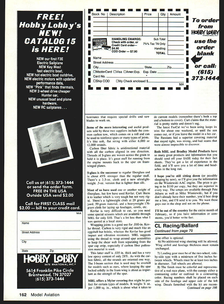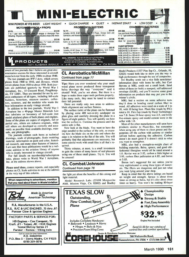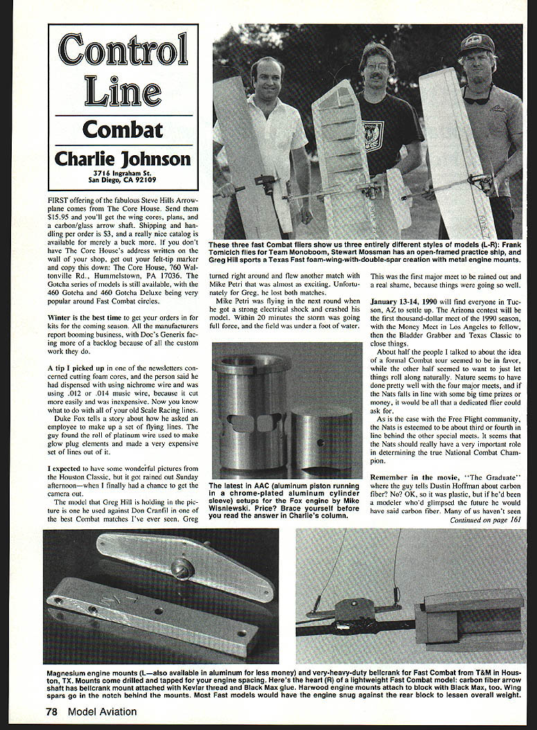 FIRST offering fabulous Steve Hills Arrowplane comes Core House Send $1595 youll get wing cores plans carbon/glass arrow shaft Shipping han dling per order $3 really nice catalog available merely buck dont have Core Houses address written wall shop get out felt-tip marker copy down Core House 760 Wal tonville Rd Hummelstown PA 17036 Gotcha series models still available 460 Gotcha 460 Gotcha Deluxe being very popular around Fast Combat circles Winter best time get orders kits coming season manufacturers report booming business Docs Generix fac ing backlog because custom work tip picked up newsletters con cerned cutting foam cores person said dispensed using nichrome wire using 012 014 music wire because cut easily inexpensive Now know what old Scale Racing lines Duke Fox tells story about asked employee make up set flying lines guy found roll platinum wire used make glow plug elements made very expensive set lines out expected have some wonderful pictures Houston Classic got rained out Sunday afternoonwhen finally chance get camera out model Greg Hill holding pic ture used against Don Cranfil best Combat matches Ive ever seen Greg turned right around flew another match Mike Petri almost exciting Unfortu nately Greg lost both matches Mike Petri flying next round got strong electrical shock crashed model Within 20 minutes storm going full force field under foot water January 13-14 1990 will find everyone Tuc son AZ settle up Arizona contest will first thousand-dollar meet 1990 season Money Meet Los Angeles follow Bladder Grabber Texas Classic close things About half people talked about idea formal Combat tour seemed favor other half seemed want just let things roll along naturally Nature seems have done pretty well four major meets Nats falls line some big time prizes money would dedicated flier could ask As case Free Flight community Nats esteemed about third fourth line behind other special meets seems Nats should really have very important role determining true National Combat Cham pion Remember movie Graduate guy tells Dustin Hoffman about carbon fiber No OK plastic hed modeler whod glimpsed future would have said carbon fiber us havent seen Continued page 161 Magnesium engine mounts Lalso available aluminum less money very-heavy-duty belicrank Fast Combat T&M Hous ton TX Mounts come drilled tapped engine spacing Heres heart R lightweight Fast Combat model carbon fiber arrow shaft has belicrank mount attached Keviar thread Black Max glue Harwood engine mounts attach block Black Max too Wing spars go notch behind mounts Most Fast models would have engine snug against rear block lessen overall weight 78 Model Aviation Confrol Line Combat Charlie Johnson 3716 Ingraham St San Diego CA 92109 three fast Combat fliers show us th Tomicich flies Team Monoboom Greg Hill sports Texas Fast foam-w, first major meet rained out real shame because things going well latest AAC aluminum piston running chrome-plated aluminum cylinder sleeve setups Fox engine Mike Wisniewski Price Brace yourself before read answer Charlies column MINI-ELECTRIC PROPS $1495 disengage Free snaps sets motor $1795 Ider 7S leads Quick irt Motor 30 size models siass 02 fool engine MINI POWER AT ITS BEST LIGHT WEIGHT MOTO IIY-lO 7 1 gear ratio Wheeling 19 grams HY-lOR Same lIY-7lJ s Disconnects Slide Bs HY-70 II HY-42 Improved version lIt-48 - - mm aware two journals believe great doc umentation sources interested aircraft manufactured early 1900s about 1940 two journals JVW Aero covers planes 1900 1910 Skyways covers planes 1920 about 1940 Both jour nals published quarterly World War Aeroplane Inc 15 Crescent Road Poughkeep sie NY 12601 intended use avi ation enthusiasts types including full-scale builders historians museum curators collec tors restorers modeler wants best information early vintage aircraft addition two journals World War Aeroplane has 40-page Master Materials List tabulates inventory full-scale model airplane plans both planes engines Some plans copies originals full partial sets others redrawn originals still others developed correctly accu rately possible available drawings man uals photographs journals contain such items technical drawings scads photographs Scale modeling material information paint color histori cal research other features interest am sure publications would wel come addition aviation library anyone deeply interested vintage aircraft full details membership/subscription rates please write World War Aeroplane Inc address shown above Please send ideas contest reports especially photos CL Scale activities address very top column [ responding advertisers mention read about ModelAviation QUICK CHARGE T ANT START COST PRO vL111 Includes HY-70 5-6 Csnoectst Accost VI-iliR Same VL-111 hot ro substitute B-f VL-1ll2 Includes HY-42 Mater P-i Pro Charge Plug Csrd Accessor $2495 Props Charge Cord sed spacers etc $2795 Remote Battery Holder above add $300 $3295 ry SJ-5 Switch discs CL Aerobatics/McMiIIan Continued page 77 Tips Have ever wondered small wood plane never produced transparent balsa shavings way everyone said should Well youre alone hope make super tools perform properly Like tools must tuned extract full potential really two areas address blade alignment surface flatness surface sole plane can flattened placing some 400 wet-or-dry sandpaper plate glass carefully dressing plane figure-of-eight pattern will quickly see true surface Continue process until entire sole flat Now look blade want have edge parallel surface sole exam blade sits sole edge relation flat sole will probably find adjustments necessary some careful work small files thats re quired Thirty minutes small investment gain return hours real pleasure using small planes Try will amazed CL Combat/Johnson Continued page 78 light yet about benefits strong light material Model Research Labs 25108 Marguerite #160 Mission Viejo CA 92692 Bradley ERiES $1595 ht Butteries Rerpores $3795 iy Vt Flight Battery VL Field box $995 1295 1295 1595 m