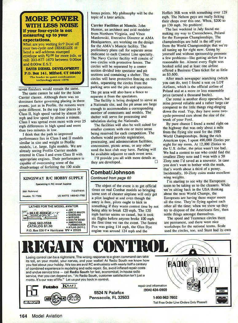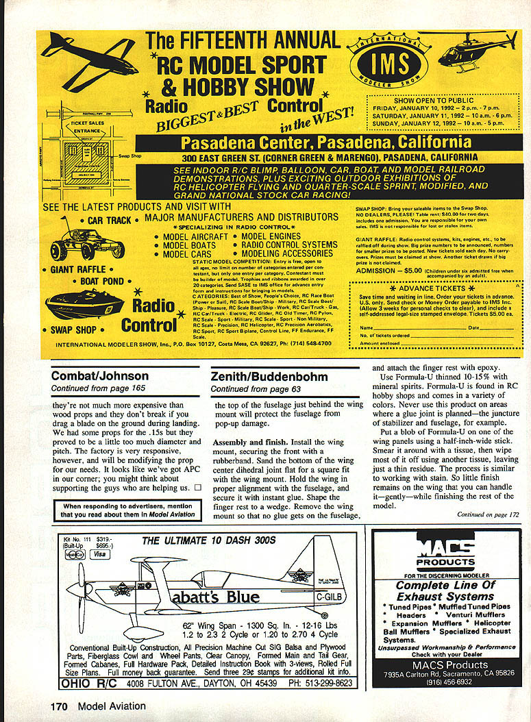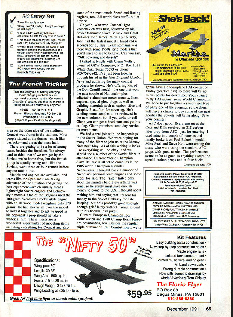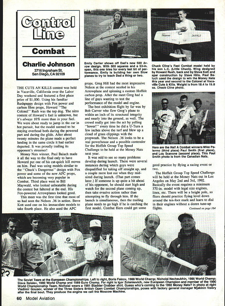 THE CUTS KILLS contest held Vacaville California over Labor Day weekend featured first place prize $1000 Using familiar Rushpuppy design Fox power carbon fibre props Howard Colonel Rush top dog nitro content Howards fuel unknown its always 10% fuel about ready jump car hot pursuit model seemed staying overhead both during powered part during glide After about twenty minutes plane made perfect landing same circle earlier departed proudly trailing its opponents streamer Money Nats winner Paul Baluch made way final have Howard put cat-quick kill moves him Paul using models similar Chucks Dangerous design Fox power some new APC props becoming very popular Combat Third place went Bill Maywald looked unbeatable during contest faltered end Fox-powered Arrowplanes looked good meet first time us seen Nelson 36 action Steve Kott used immaculate models take fourth place also used APC props Greg Hill impressive Nelson contest nestled Arrowplane spinning custom Hoffelt carbon prop After meet Greg line guys wanting test performance model engine best exhibition flight far Bob Carver flew Gregs plane within inch its structural integrity nearly ground well crowd really got act yelling lower time did U-Turn few inches above turf blew up cloud grass clippings propwash Nelson 36 looks real powerhouse possible contender Hoffelt Group Top Speed Challenge held Money Nats next year odd see problems develop during launch several instances during guys disqualified taking off straight up couple lost out midaired during launch part comes later someone up quite bit ahead opponent should start high watch second plane coming up take evasive action rather attempting fly through him launch simultaneous trailing plane needs go high catching first model Combat fliers could get some good practice flying racing event two Hoffelt Group Top Speed Challenge will held Money Nats out Los Angeles May 2nd 3rd 1992 Basically event requires minimum 370-in model legal size engines lines etc will height pole fliers should practice flying level down around ten-foot mark learn dial engines dozen tune-up flightsContinued page 164 Soviet Team European Championships Left right Boris Faizoy 1988 World Champ Nicholal Necheukhin 1986 World Champ Slava Belaiev 1990 World Champ 1989 Euro Champ Far right Igor Zolenkevich new European Champion member 1990 World Championship Team Nicholai wears 1991 Bladder Grabber shirt Guess whos coming 1992 Money Nats photo right Vladimir Gousev winner Three Sisters British Open Combat Championships poses factory general manager Mjakinin Valery after final bout produce engine call Moscow Machine 60 Model Aviation Combat Charlie Johnson 3716 Ingraham St San Diego CA 92109 Emily Cartier shows off Dads new 500 Ar row design 500 squares 53-in Chuck Clines Fast Combat model held span tries last bit per- son LC Little Chuck Wing designed formance Emily building own Slow Howard Rush back end Steve Kott planes try teach Dad thing twospar construction Steve Hills Paul Ba luch used design win Money Nats year second Colonel Vaca Yule Cuts & Kills Weight 184 198 oz Chuck Cline photo Half Combat winners Mike Pa lermo third place Paul Smith first place Lou Scavone second place Paul Smith photo Canadian Nats seven finishers-the same same cannot said tor Scale Carrier classes Although no dominant factor governing placing events just Profile reasons quite different top four places Class II high speed varied almost 20 mph low speed almost minute Class spread over 25 mph differences high speed two minutes low think path improved performance lies Class II medels similar size weight Profile models ie large light models already seeing Profile Carrier models entered Class Class II appropriate engines performance capable overcoming some disadvantage forfeiting 100 scale bonus points philosophy will topic later article Carrier Facilities Muncie John Hunton architect avid modeler Northern Virginia Vince Mankowski Executive Director AMA Headquarters working design AMAs Muncie facility preliminary plans call separate areas dedicated Control Line specialty Navy Carrier facility will consist two circles protective fences circles will separated center section divided spectator pit sections containing shelter circles will have protective fencing two sides separating circles parking area pits spectators pit area will also have fence separate spectators facility being designed serve Nationals site pit areas large enough acconunodate corresponding number contestants models shelter will serve processing tabulation during Nationals facilities will also well suited smaller contests areas being reserved competition shelters would provide registration processing administration facilities concessions picnic areas other need host club may have Parking will available adjacent event area Ill provide details developedII Combat/Johnson Continued page 60 object event get official times real Combat models bringing some sort cheater airplane will get pilot laughed though entry free pilots ought kick something waste contest time being able break 120 mph 120 mph barrier seems casual took six flights before anyone broke 100 mph first time ran event fastest Fox going 114 mph Glen Dye engine around 124 mph Hoffelt 36R won something over 129 mph Nelson guys really licking chops over Whoa $200 go 130 mph No problem last weekend July found making way Czestochowa Poland European Championships championships held off year World Championships tuning up right now Going yourself sponsorship presents few problemslike getting airfare reasonable fee Almost flight booked solid least airline offered Business Class ticket little $3600 After much newspaper searching can too found seat LOT Airlines official airline Poland less reasonable price around thousand bucks Car rental another dicey operation proved reliable rather large car compared little things ring-dinging down road Yep have some twocycle-powered cars about size trunk Ford pure chance found motel right highway about mil