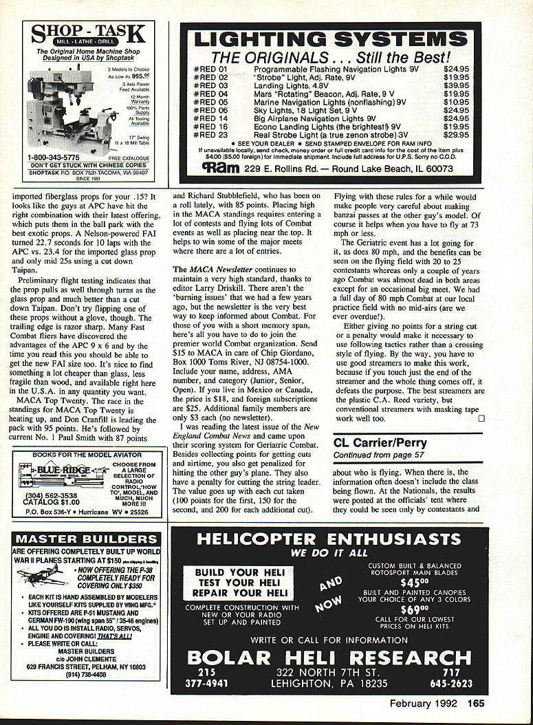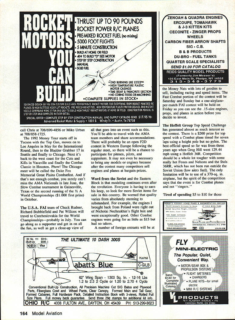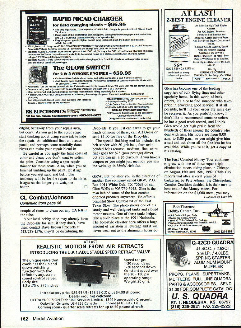 Combat NOT JUST FOR COMBAT Youll notice photos month features rather confusing array items available through Art Gross 12516 Maplewood Ave Edmonds WA 98026 Tel 206/7439332 hand belt sander combines practical use sanding block continuous belt can use 54 square inches paper An easy-to-use locking device allows quick removal replacement proper type grit wont have ten different blocks lying around spraying some silicon paper can keep loading up thanks ability unlock rotate paper residue just falls off goes around corner Art demonstrated technique Bladder Grabber get sander youll find out works just well photo youll see sander bottom pack replacement belts Wedge Lock Youll also notice some strange tubes top sander called Drop-Ets dispensers cyanoacrylate glue Yeah know buy one-use size glue what want save some money buy big bottles could like pour some little bottles end up What use 80 mph event Fast Combat model restrictor venturi 9 x 4 9 x 5 10 x 4 prop ieft Chuck Rudner third Bruce Coffey first Russ Graves second Coffey needs tape leading edge keep getting foam kliis tip touch work youll contaminate glue make set up tip Moisture contamination will make glue set up pronto storing bulbs should keep vertical lightly squeeze bulb half bottle half carpet provides better way use Drop-Ets squeeze out air place long tube CA allowing vacuum draw glue up bulb Art warns using Drop-Ets must let 56 Model Aviation ELtix Charlie Johnson 3716 Ingraham St San Diego CA 92109 Va woria namps wnrnier Narrows ucioosr 1 i io rp unur Pete Athans Fred Badwin organizers first through fifth Steve Hiiis Russ wiicox vreg Hiil Rich Lo pez Don Repp Champs got about $2900 merchandise cash awards Continued page 162 Hand BCIt Sander wedge Lock sanding beits two Drop-Ets making efficient use bulk cyanoacryiste glue No ex cuses sanding now great stuffs just Combat Heres GRW tank adjustable mounts elevator horn Quality items used Na tionais winners Combat fiiers ail over country fact tank took first through sixth 1991 Nationals Availabie Gien Weiis PO Box 1011 White Oak Texas 75693 RAPID NKAD CHARGER field charging nicads $6695 adjustable 100% capacity MOSPET field charger 4 S cell RX B cell TX nicads Using state-of-the-art MOSIET technology can rapidly field charge 48 60 VBX 96 V TX nicads simultaneously independently Plug cigarette lIghter socket plug included push bulton Ibis unit will restl FULL 100% CAPACITY WITHOUT ThE CAR ENGINE RUNNING 120-140 V souree Auromauc voicircuitiy will terminate iSle charge LEOs will indicate Separate RX si.adjusbnente up least 1000 mA factory set 500 mA allow fasi charging nicads excess 1000 mAll capacity ability used home tricide/overniglit/fast charging system using V DC regulated poser supply Separate fiX TX trip voltage adjustments allow charging 4 5 cell fiX nicads well precise control owe Oh rinanne termination voltages GLOW SWITCH 2 & 4 STROKE ENGINES $3995 board Glow Switch allows easier safer starting land 4 stroke engines Just throttle hack flip prop No external batteries cords deal Works on-board 11 volt nicad cell Automatic Turn means unit shuts off receiver powered dlowm Will work Ill & ICM radios Servo reversing adjustable Irip point LED Indicator Will work 1 glow plugs Ideal Inverted cowled engines Provides reliable idling especially 4 slrolres dual POWER MOPTSET desIgn ensures exiremely low voltage drop therefore masimum heat glow plug Unit shIpped tinned leads Also avaIlable Installed Putaba J connector $500 additional Er mrdWErdN1N dLLAIrnDFflI BY DESIGN 30 Fox. Eguaa flew itamnpddre mat 8824022 edging out away repair area dont As get color stage start thinking about using some ink hide repair An additional line access panel perhaps some tastefully done rivets can make repair blend careful apply final coats color clear dont want soften paint Consider using spot repair thinner coats Also youre finished building up paint let age before wet sand buff tendency will repair shrink ages longer wait betterL] CL Combat/Johnson Continued page 56 couple times clean out CA left tube local hobby shop may already have Drop-Ets sale dont have contact Dave Brown Products 513/738-1576 theyll distributing Prepaid Orders Money Order Cerhiled Check Shipping & Handing $500 COD Orders Cash Cerlihed Check collected delivery Add $400 above amounts DEAIA5 IJYQVJRIES IrIVIIED Prices and Specifications Subject Change Without Notice Designed manufactured USA Drop-Ets just cant wait get hands some call Art Gross send $500 five Drop-Ets special finishing tool kit includes belt sander 80 grit belt four resinbonded belts course medium fine extra fine goes $25 plus postage direct can get $5 discount have coupon might just mention saw write-up Model Aviation GRW Let steer direction another fine company called GRW PO Box 1011 White Oak TX 75693 call Glen Wells 903/759-3942 Glen man behind some best combatoriented products anywhere offers beautiful Slow Combat kit East Texas Slow photo shows sturdy well-designed tanks slotted motor mounts tanks helped take sixth place 1991 Nationals bolt-style elevator horn offers huge amount variation leverage will never wear out aluminum horns AT LAST REALISTIC MOTION FROM AIR RETRACTS INTRODUCING THE UP1 ADJUSTABLE SPEED RETRACT VALVE unique valve combines up down switching function two infinitely adjustable speed control valves Body size 12 x 75 x 375 inches Speed range 1-20 seconds up 1-20 seconds down Constant speed over 20- 100 psi operating range Weight 20 gins Introductory price $24 95 US $2895 CD plus $400 shipping Dealer inquiries welcome ULTRA PRECISION Technical Services Limited 1244 Honeysuckle Crescent Oakville OntarioL6H 2S8 Canada Phone 416 842 1703 Coming soon quarter scale retracts up 50 pound aircraft AT LAST Z-BEST ENGINE CLEANER $2ttlS& H CA 825% lax send check money orderer ask local denier An Effective High Tech Engine Cleaner Foe It/C Engines Removes Burned-on Fuel Residue Encrusted Carhon Euildup Any Bare Metal Engine Oulside snd Inside Z-BE5T Clean
