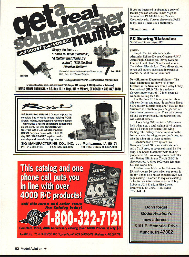 CONTROL LINE COMBAT INTRODUCTION Since Im quite famous some fellow columnists Ill tell little about myself born raised southern California have lived life Ive flying control line airplanes off since about eight years old venturing forms CL have great appreciation succeed regardless discipline personal favorite Combat am presently AMA CD hold office MACA [Miniature Aircraft Combat AssociationEd] District 10 vice president have associated several AMA chartered clubs over years holding office severalmost recently president southern California club Knights Round Circle usually compete eight 12 Combat contests year including AAA regional AA local AMA Fast Combat Money Meets /2A World Champs west coast also fly almost weekend participate lot practice matches /2A 80 MPH FAI blast past Ed Bridants excellent photos Alan DeVeuve Mitch Cleveland locked match way us would rather experiencebut probably have time anotherwere taken last Team Trials Vacaville California Top Gun spite really extreme weather part country first big meet year Top Gun Shoot-Out Tucson Arizona went off hitch Thirty contestants over country flew triple-elimination Fast Combat smoothest-run contests Ive ever attended weather beautiful bit test flying arrived Friday cool cloudy Saturday Rain Sunday morning let up during first round held off until after finals turnout seemed down slightly quality equipment skill pilots seemed up notch Richard Stubblefield hot beginningmaking five kills Saturday going take win Mark Smith flew very well finish second Dave Stewart undefeated until very end lost three matches finished third Ken Manchester placed fourth still flying very well after winning Morgan Hill meet Alan DeVeuve Greg Hill rounded out top five great contest very well-organized hardworking contest management 30 contestants flew two days top-notch Combat very good equipment deserving top five collecting spoils Sunday evening International News received small brochure Tomas Mejzlik member Czechoslovakian Combat team listing whole bunch neat modeling goodies contains items FAI disciplines Combat Speed Stunt free flight items FAI combat F2D quite interesting engines mufflers meet 1993 rules change both diesel glow versions F2D Combat model kits already built RTF models three different designs Rich Lopez Chuck Rudner brought back several similar prebuilt Russian planes World Championships last year weve flying quite bit doing engine muffler tests few test hops fun practice very competitiveobvious World Championship resultslots fun fly $32 plus shipping cost includes set aluminum motor mounts theyre great buy Also brochure accessories needed get jewels airborne Bulk reels line individual premade sets preassembled fuel bladders belleranks pushrods control horns separate mufflers rubber aluminum flying handles pretied streamers also seven types carbon /Kevlar-molded glass props available designed past present world-class fliers last page complete listing spare parts engines sells prices photos show example Russian airplanes nose section showing high-quality workmanship detail engine prop aluminum mounts particular engine has singleexhaust spigot intended muffler use couple Richs photos taken last World Championships show some goodies available onsite luck would have now us through mail order looks like great opportunity us pick up some very competitive F2D equipment reasonable prices youre planning compete team trials still might want consider buying couple just play fly practice matches flue putting together order now should able give vi1iiitinn nf th~ it~m i future cnhuumn October1993 81 Alan DeVeuve Mitch Cleveland battle Vacaville California Ed Bridant photos out last Team Trials Combat View Russian planes nose section shows high quality detail Tomas Mejzliks Combat products Combat essentials Tomas Mejzlik now available States via Tomass new brochure Lopez photos above statements made Clarence Lee Don Lowe Howard Crisp/n IEEE Tack Support 202-177-1712 TUE LiIAI DEALE HE CALL less coesgieta calalag mud uN-addresud 750 stamped #10 eveIepe 18311 esallted let order HAVE MUIR PROIICTS I 141 MA rd CT WE I71-1MI interested obtaining copy list can write Tomas Mejzlik Jurkovicova 19 63800 Brno Czechol Czechoslovakia can also send SASE Ill send photocopy Till next time. oaringlBlakeslee Continued page 66 gliders Simple Electric kits include Airtronics Eclipse Deluxe Graupner UHU Astro Flight Challenger Davey Systems Lucifer Great Planes Spectra similar Two-Meter Electric kits use six- seven-cell battery packs inexpensive motors lot fun buck New Skimmer Electric sailplane latest addition above list fun Electrics Skimmer Hobby Lobby International HLI rudderelevator-motor control 70-inch-span allwood kit selling $48 Jim Martin HLI very excited about new design says performs like $300 custom Electric sailplane says Skimmer will climb speck height two three times charge power off prop folded Jim guarantees will catch thermals has Selig 3021 airfoil 532-squareinch wing area total weight 44 ounces 12-ounce-per-square-foot wing loading battery compartment bottom under wing dont need take wing off swap batteries Recommended drive system Graupner Speed 600 motor six cells 7 x 3 prop seven cells 8 x 41/2 prop Speed 600 motor folding propeller $33 An on/off motor controller Battery Eliminator Circuit BEC also required Hitec 1003 costs less $30 works fine video available Skimmer $9 get $6 back return Hobby Lobby also has excellentfree 124page catalog order request catalog further information write Hobby Lobby 5614 Franklin Pike Circle Brentwood TN 37027 Tel 615 373-1444 odel Aviation ply Dust. Teat ad 8818 S Metea Muff laP Thinks its pipe itiii Meat Effective Muffler SIG MANUFACTURING CO now imports complete line world record holding ROSSI aircraft marine helicopter race car engines includes full line parts accessories plus full time ROSSI REPAIR CENTER US SIG-imported ROSSI engines come full 90 day SIG WARRANTY against work manship manufacturing defects S