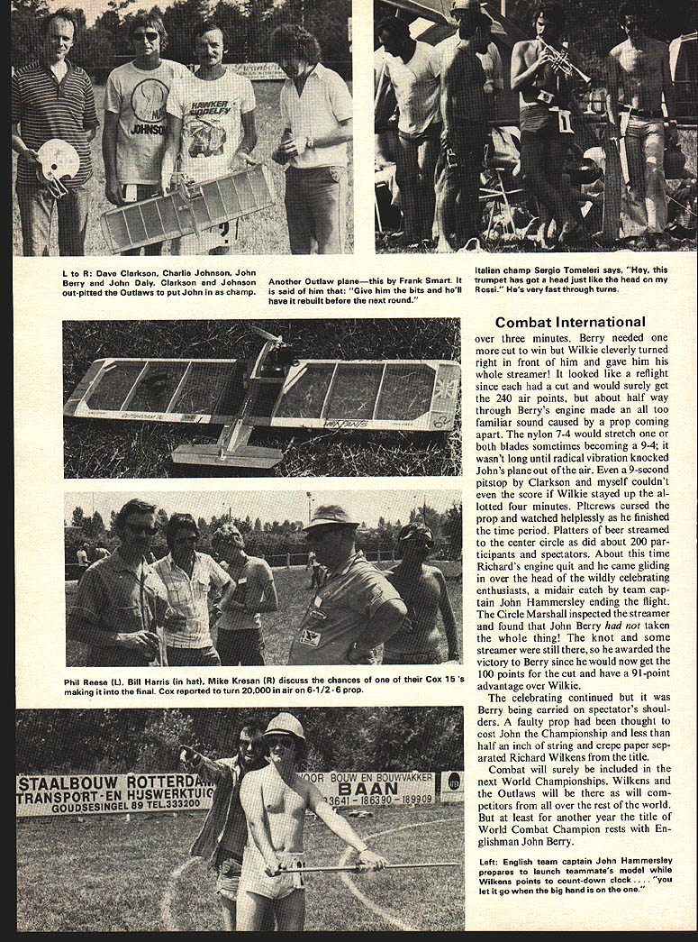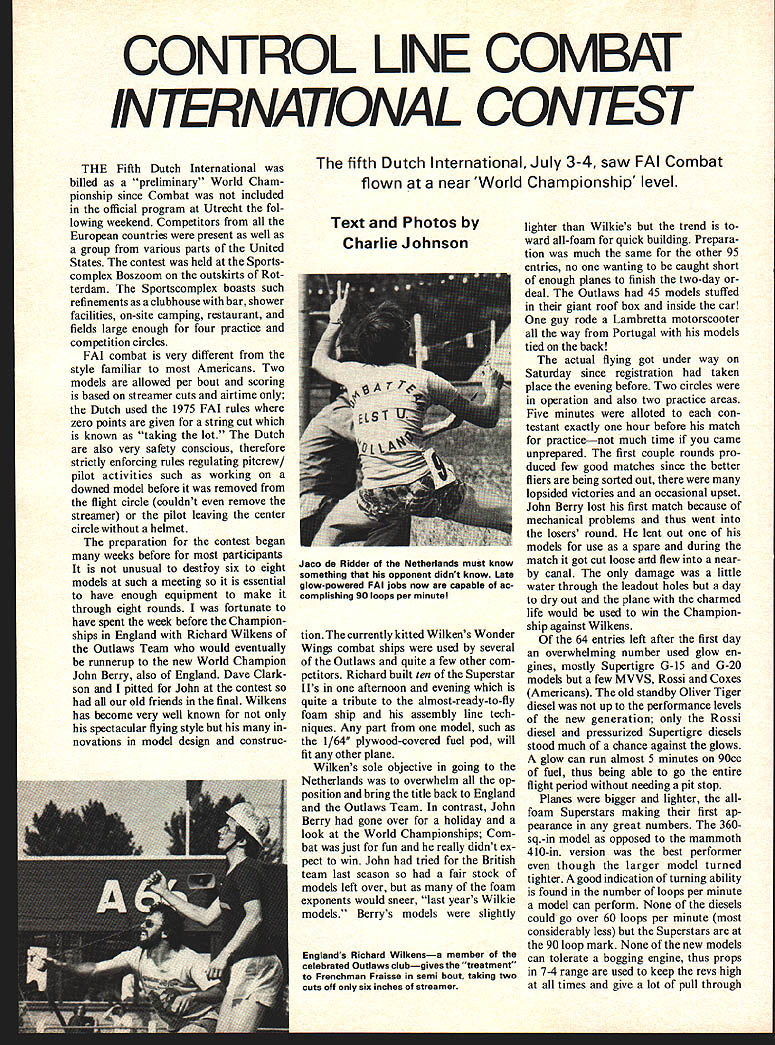 CONTROL LINE COMBAT INTERNATIONAL CONTEST THE Fifth Dutch International billed preliminary World Cham pionship since Combat included official program Utrecht fol lowing weekend Competitors European countries present well group various parts United States contest held Sportscomplex Boszoom outskirts Rot terdam Sportscomplex boasts such refinements clubhouse bar shower facilities on-site camping restaurant fields large enough four practice competition circles FAI combat very different style familiar Americans Two models allowed per bout scoring based streamer cuts airtime Dutch used 1975 FAI rules zero points given string cut known taking lot Dutch also very safety conscious therefore strictly enforcing rules regulating pitcrew/ pilot activities such working downed model before removed flight circle couldnt remove streamer pilot leaving center circle helmet preparation contest began weeks before participants unusual destioy six eight models such meeting essential have enough equipment make through eight rounds fortunate have spent week before Champion ships England Richard Wilkens Outlaws Team would eventually runnerup new World Champion John Berry also England Dave Clarkson pitted John contest old friends final Wilkens has become very well known spectacular flying style novations model design construc fifth Dutch International July 3-4 saw FAI Combat flown near World Championship level Text Photos Charlie Johnson tionThe currently kitted Wilkens Wonder Wings combat ships used several Outlaws quite few other com petitors Richard built ten Superstar IIs afternoon evening quite tribute almost-ready-to-fly foam ship assembly line tech niques Any part model such l/64 plywood-covered fuel pod will fit other plane Wilkens sole objective going Netherlands overwhelm op position bring title back England Outlaws Team contrast John Berry gone over holiday look World Championships Com bat just fun really didnt ex pect win John tried British team last season fair stock models left over foam exponents would sneer last years Wilkie models Berrys models slightly Englands Richard Wilkensa member celebrated Outlawa clubgives treatment Frenchman Fraisse semi bout taking two Cuts oft six inches streamer lighter Wilkies trend ward all-foam quick building Prepara tion much same other 95 entries no wanting caught short enough planes finish two-day deal Outlaws 45 models stuffed giant roof box inside car guy rode Lambretta motorscooter way Portugal models tied back actual flying got under way Saturday since registration taken place evening before Two circles operation also two practice areas Five minutes alloted con testant exactly hour before match practicenot much time came unprepared first couple rounds pro duced few good matches since better fliers being sorted out lopsided victories occasional upset John Berry lost first match because mechanical problems thus went losers round lent out models use spare during match got cut loose flew near canal damage little water through leadout holes day dry out plane charmed life would used win Champion ship against Wilkens 64 entries left after first day overwhelming number used glow en gines mostly Supertigre G-15 G-20 models few MVVS Rossi Coxes Americans old standby Oliver Tiger diesel up performance levels new generation Rossi diesel pressurized Supertigre diesels stood much chance against glows glow can run almost 5 minutes 90cc fuel thus being able go entire flight period needing pit stop Planes bigger lighter allfoam Superstars making first ap pearance great numbers 360sq-in model opposed mammoth 410-in version best performer though larger model turned tighter good indication turning ability found number loops per minute model can perform None diesels could go over 60 loops per minute considerably less Superstars 90 loop mark None new models can tolerate bogging engine thus props 7-4 range used keep revs high times give lot pull through Jaco Ridder Netherlands must know something opponent didnt know Late glow-powered FAI jobs now capable ac complishing 90 loops per minute turns Some Americans used clipped 7-6 nylons Cox 15s during violent turning motor would often pulled off its power band though motor reported turn excess 20000 rpm air about what Supertigre does 7-4anything prop self destructs Italian Rossi operators solved prop problems using 7-5 fiberglass props Italian Champion Sergio Tom meleri chief proponent com bination very fast level -more power through maneuvers anyone else Thrown prop blades changed course matches Cham pionships including final Berrys prop actually grew another inch competition Sunday very ex citing good matches though Americans out sixth round Smith Kresan Reese chanical problems Harris Johnson just lost Richard Wilkens soundly de feated ex-Champ Vernon Hunt daz zling display glow dominance over Oliver diesel Vernon very best offensive fliers never able mount attack being chased ground several times Wilkens opponents found safe place ground found way either purpose result some treatment Outlaws call As can see quarter-final matchings no high scores until semi-final Wilkens ran up 440 points taking large cut two smaller ones off 6 inches streamer closest fought matches tween Fraisse France Jaco de Ridder Netherlands flight third fourth place dead-heated 405 405 first match de Ridder finally pulling out victory 512 474 Name & Country Berry England Rasmussen Denmark Fraisse France Morgan England Hammersley England deRidder Netheri Wilkens England Hunt England QuarterSemifinal Final ScoreScore highest combined total entire contest final turned out real Cinderella story John Berry having lost first round come back losers round inch way final solid 390-plus scores several flights Wilkens Outlaws very con fident Richard having taken platter beers out pilots circle after de Rid der defeated Frenchman John Berry off himself preparing model th3t fallen victim canal previous day Berry excellent pilot would force Wilkens apply himself match previ