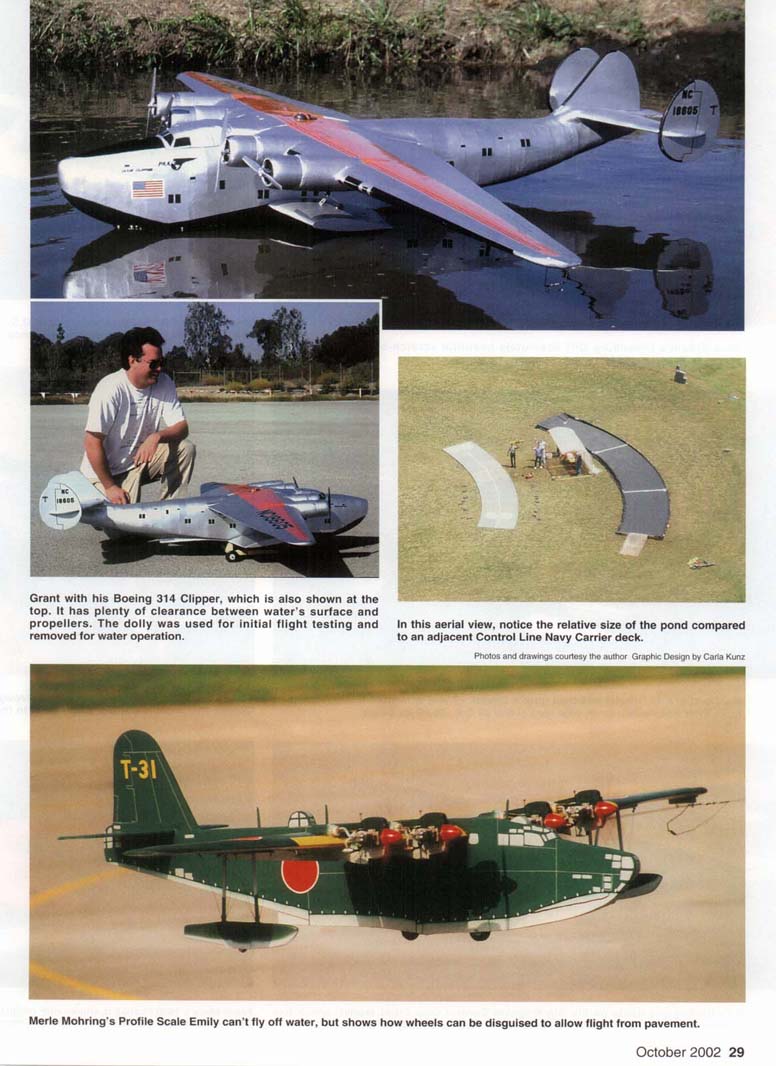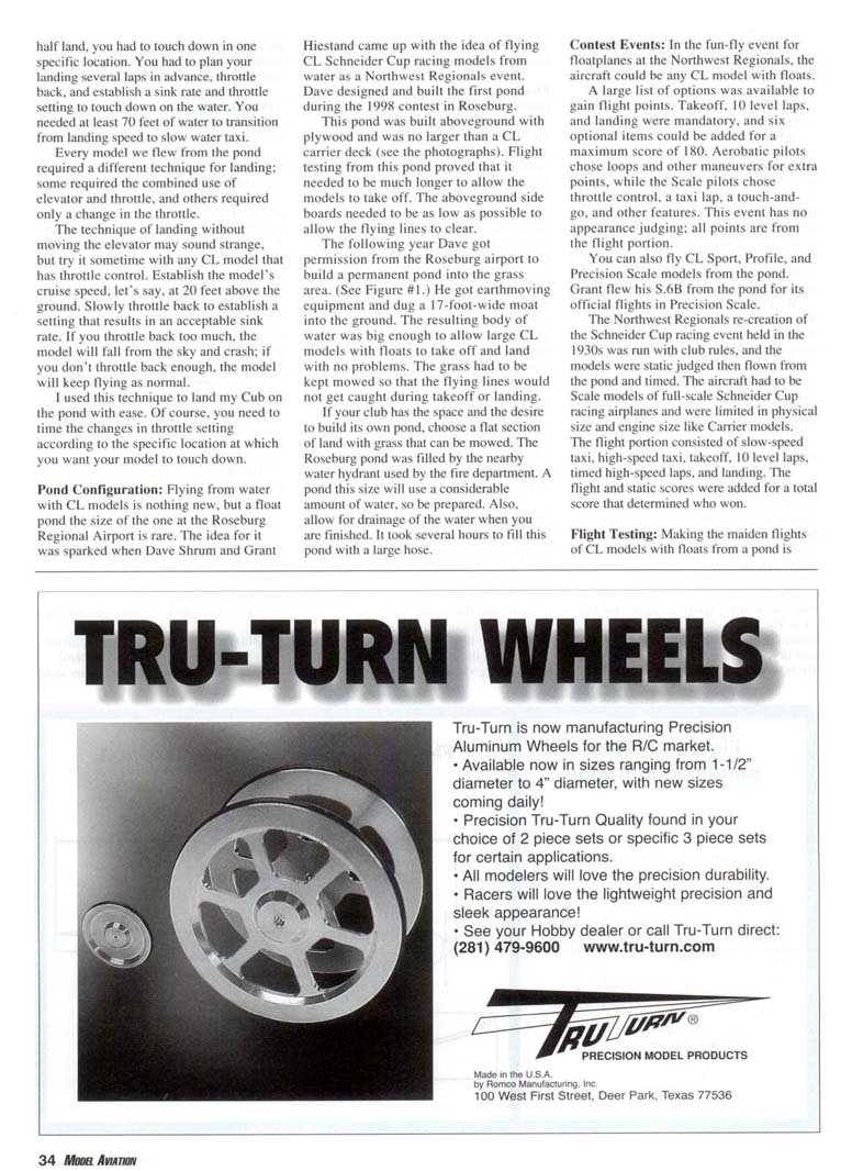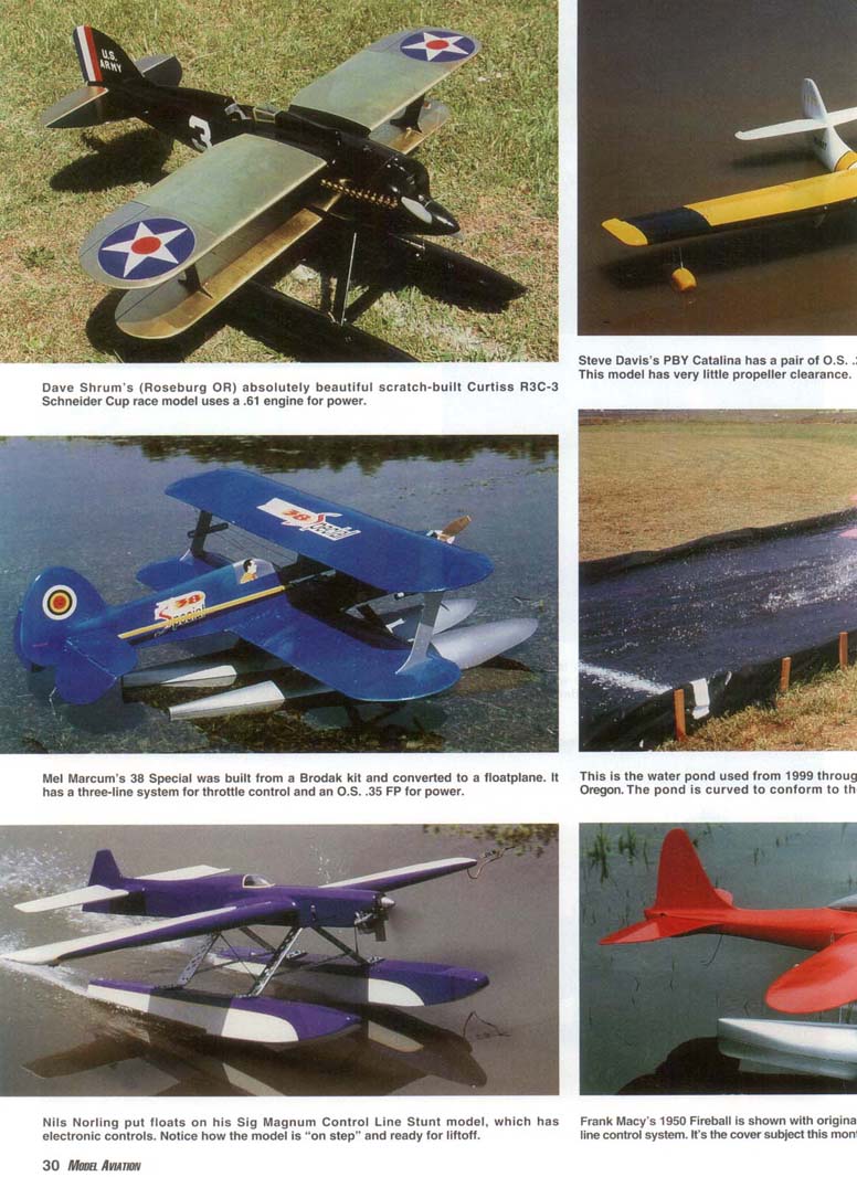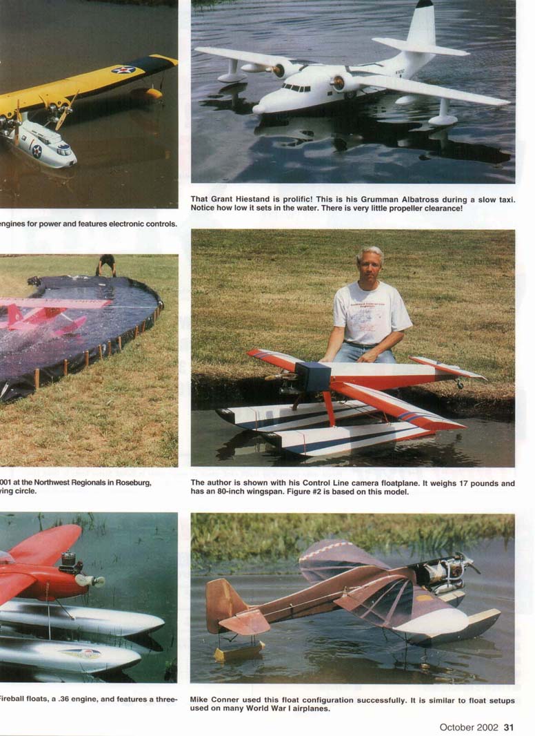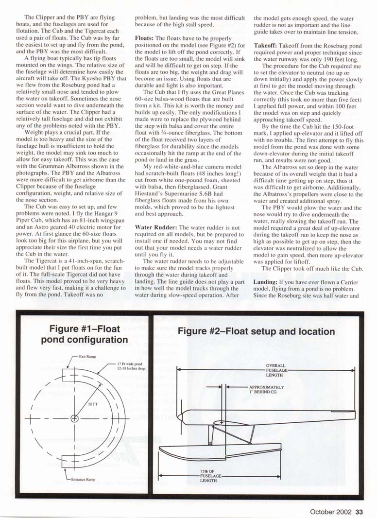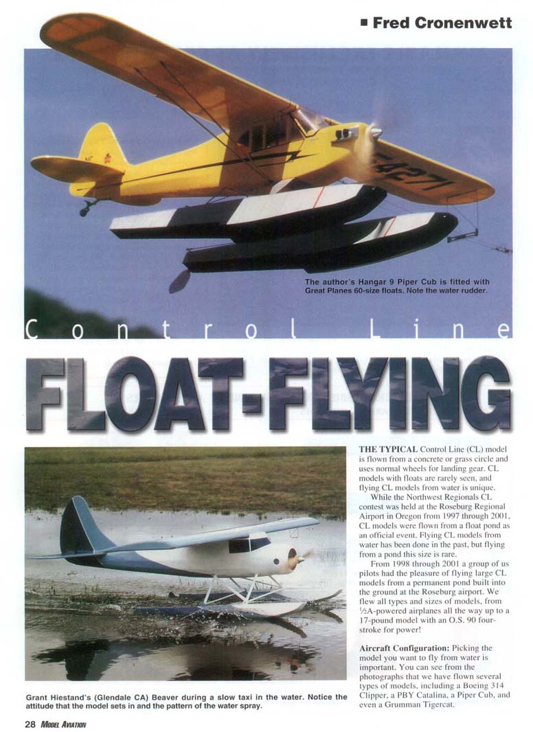 THE TYPICAL Control Line (CL) model is flown from a concrete or grass circle and uses normal wheels for landing gear. CL models with floats are rarely seen, and flying CL models from water is unique. While the Northwest Regionals CL contest was held at the Roseburg Regional Airport in Oregon from 1997 through 2(K)1, CL models were flown from a float pond as an official event. Flying CL models from water has been done in the past, but flying from u pond this size is rare. From 1998 through 2001 a group of us pilots had the pleasure of flying large CL models from a permanent pond built into the ground at the Roseburg airport. We flew all types and sizes of models, from '/:A-powered airplanes all the way up to a 17-pound model with an O.S. 90 four-stroke for power! Aircraft Configuration: Picking the model you want to fly from water is important. You can sec from the photographs that we have flown several types of models, including a Boeing 314 Clipper, a PBY Catalina, a Piper Cub, and even a Grumman Tigercat. The Clipper and the PBY are flying boats, and the fuselages are used for flotation. The Cub and the Tigercat each used a pair of floats. The Cub was by far the easiest to set up and fly from the pond, and the PBY was the most difficult. A flying boat typically has tip floats mounted on the wings. The relative size of the fuselage will determine how easily the aircraft will take off. The Kyosho PBY that we flew from the Roseburg pond had a relatively small nose and tended to plow the water on takeoff. Sometimes the nose section would want to dive underneath the surface of the water. The Clipper had a relatively tall fuselage and did not exhibit any of the problems noted with the PBY. Weight plays a crucial part. If the model is too heavy and the size of the fuselage hull is insufficient to hold the weight, the model may sink too much to allow for easy takeoff. This was the case with the Grumman Albatross shown in the photographs. The PBY and the Albatross were more difficult to get airborne than the Clipper because of the fuselage configuration, weight, and relative size of the nose section. The Cub was easy to set up. and few problems were noted. I fly the Hangar 9 Piper Cub. which has an 81-inch wingspan and an Astro geared 40 electric motor for power. At first glance the 60-size floats look too big for this airplane, but you will appreciate their size the first time you put the Cub in the water. The Tigercat is a 41-inch-span, scratchbuilt model that I put floats on for the fun of it. The full-scale Tigercat did not have floats. This model proved to be very heavy and flew very fast, making it a challenge to fly from the pond. Takeoff was no problem, but landing was the most difficult because of the high stall speed. Floats: The floats have to be properly positioned on the model (see Figure #2) for the model to lift off the pond correctly. If the floats are too small, the model will sink and will be difficult to get on step. If the floats are too big, the weight and drag will become an issue. Using floats that are durable and light is also important. The Cub that I fly uses the Great Planes 60-size balsa-wood floats that are built from a kit. This kit is worth the money and builds up easily. The only modifications I made were to replace the plywood behind the step with balsa and cover the entire float with 3/4-ounce fiberglass. The bottom of the float received two layers of fiberglass for durability since the models occasionally hit the ramp at the end of the pond or land in the grass. My red-white-and-blue camera model had scratch-built floats (48 inches long!) cut from white one-pound foam, sheeted with balsa, then fiberglassed. Grant Hiestand's Supermarine S.6B had fiberglass floats made from his own molds, which proved to be the lightest and best approach. Water Rudder: The water rudder is not required on all models, but be prepared to install one if needed. You may not find out that your model needs a water rudder until you fly it. The water rudder needs to be adjustable to make sure the model tracks properly through the water during takeoff and landing. The line guide does not play a part in how well the model tracks through the water during slow-speed operation. After the model gets enough speed, the water rudder is not as important and the line guide takes over to maintain line tension. Takeoff: Takeoff from the Roseburg pond required power and proper technique since the water runway was only 190 feet long. The procedure for the Cub required me to set the elevator to neutral (no up or down initially) and apply the power slowly at first to get the model moving through the water. Once the Cub was tracking correctly (this took no more than five feet) I applied full power, and within 100 feet the model was on step and quickly approaching takeoff speed. By the time the Cub hit the 150-foot mark, I applied up-elevator and it lifted off with no trouble. The first attempt to fly this model from the pond was done with some down-elevator during the initial takeoff run, and results were not good. The Albatross set so deep in the water because of its overall weight that it had a difficult time getting up on step, thus it was difficult to get airborne. Additionally. the Albatross's propellers were close to the water and created additional spray. The PBY would plow the water and the nose would try to dive underneath the water, really slowing the takeoff run. The model required a great deal of up-elevator during the takeoff run to keep the nose as high as possible to get up on step, then the elevator was neutralized to allow the model to gain speed, then more up-elevator was applied for liftoff. The Clipper took off much like the Cub. Landing: If you have ever flown a Carrier model, flying from a pond is no problem. Since the Roseburg site was half water and half land, you had to touch down in one specific location. You had to plan your landing several laps in advance, throttle back, and es