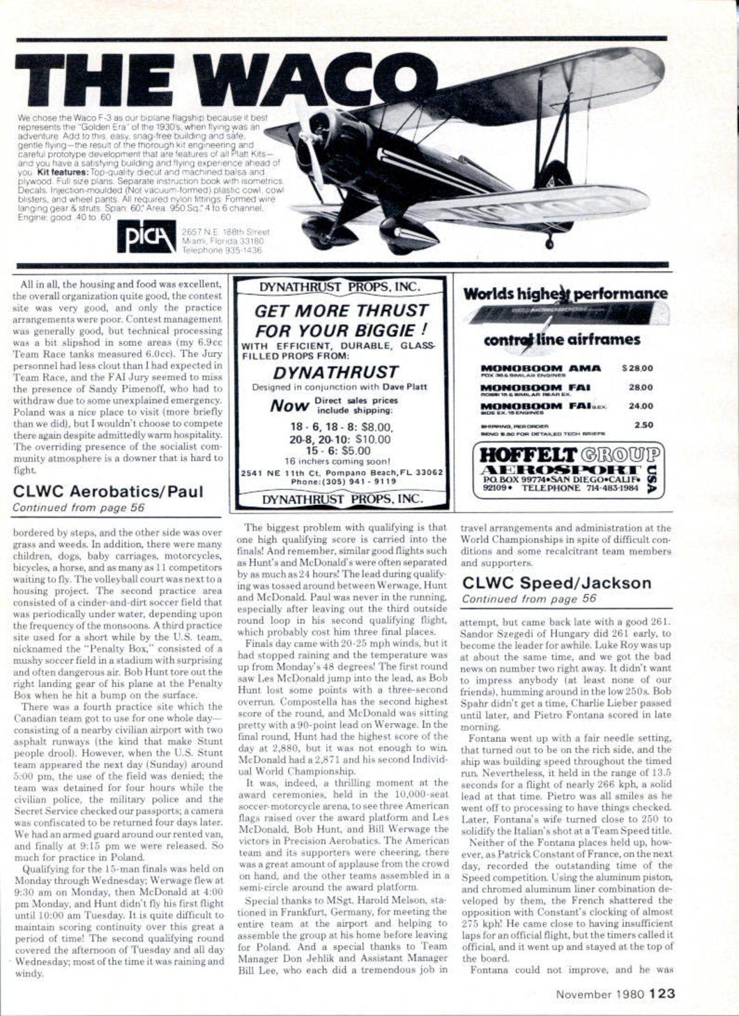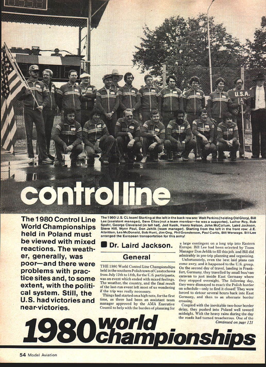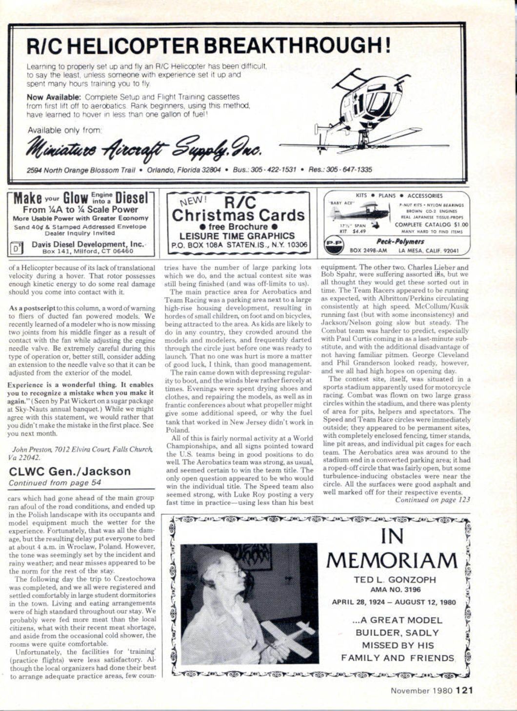 The 1980 Control Line World Championships held Poland must viewed mixed reactions weath er generally poorand problems prac tice sites some extent politi cal system Still US victories near-victories 1980 US CLteam Starting atthe left back raw Walt Perkinsholding Old Glory Bill Lee assistant manager Dave Elias team memberhe supporter Luther Roy Bob Spahr George Cleveland tall hat Jed Kusik Henry Nelson John McCollum Laird Jackson Steve Hill Wynn Paul Don Jehllk team manager Starting left front row JE Albritton Les McDonald Bob Hunt Jim Ong Phil Granderson Paul Curtis Bill Werwage Bill Lee arranged European transportation army U Dr Laird Jackson General THE 1980 World Control Line Championships held southern Polish town Czestochowa July 12th 18th US participants event ended mixed feelings weather country final result last-run event left us wondering trip really necessary Things started high note first time assistant team manager approved AMA Executive Countil help burden planning large contingent long trip Eastern Europe Bill Lee selected Team Manager Don Jehlik fill job Bill did admirably pre- trip planning organizing Unfortunately best laid plans can come awry happened US group second day travel landing Frank furt Germany travelled small bus/van caravan just inside East Germany stopped overnight following day dismayed reach Polish border scheduleonly find closed forced detour several hours back East Germany alternate border crossing Coupled inevitable two-hour border delay pushed Poland well toward midnight heavy rains during day tbe roads turned treacherous Continued page 121 ampionships 54 Model Aviation RIC HELICOPTER BREAKTHROUGH Learning properly set up fly R/G Helicopter has difficult say least unless someone experience set up spent hours training fly Now Available Complete Setup Flight Training cassettes first lift off aerobatics Rank beginners using method have learned hover less gallon fuel Available *z 2594 North Orange Blossom Trail ndo Florida 32804 305 422 1531 Res305-647-1335 [IInu EngineIKITS S PLANS 0 ACCESSORIES Make UBUE Diesel 1 iRARACS,4jP-NUT KITS NYLON BEARINGS Usable Power Greater EconomytCa mr4cBROWN CO-2 ENGINES 14A 1/4 Scale Power ~ L JAPANESS TISSUE-PROPS Send 4O & Stamped 0 free Brochure 449 MANY HARD TO FIND ITEMS IAddressed Envelope17 SPAN 4COMPLETECATALOG$100 l1 Davis Diesel Development Inc-po BOX 108A STATENIS NY 10306 Dealer Inquiry InvItedLEISURE TIME GRAPHICS BOX 141 Mllford CT 06460W BOX 2498 AMLA MESA CALIF 92041 Helicopter because its lack translational velocity during hover rotor possesses enough kinetic energy some real damage should come contact As postscript column word warning fliers ducted fan powered models recently learned modeler now missing two joints middle finger result contact fan adjusting engine needle valve extremely careful during type operation better still consider adding extension needle valve can adjusted exterior model Experience wonderful thing enables recognize mistake make again Seen Pat Wickert sugar package Sky-Nauts annual banquet might agree statement would rather didnt make mistake first place See next month John Preston 7012 Elvira Court Falls Church Va 22042 CLWC Gen/Jackson Continued page 54 cars gone ahead main group ran afoul road conditions ended up Polish landscape its occupants model equipment much wetter experience Fortunately alt dam age resulting delay put everyone bed about 4 am Wroclaw Poland However tone seemingly set incident rainy weather near misses appeared norm rest stay following day trig Czestochowa completed registered settled comfortably large student dormitories town Living eating arrangements high standard throughout stay probably fed meat local citizens what recent meat shortage aside occasional cold shower rooms quite comfortable Unfortunately facilities training practice flights less satisfactory Al though local organizers done best arrange adequate practice areas few coun tries have number large parking lots actual contest site still being finished off-limits us main practice area Aerobatics Team Racing parking area next large high-rise housing development resulting hordes small children foot bicycles being attracted area As kids likely country crowded around models modelers frequently darted through circle just before ready launch no hurt matter good luck think good management rain came down depressing regular ity boot winds blew rather fiercely times Evenings spent drying shoes clothes repairing models well frantic conferences about what propeller might give some additional speed fuel tank worked New Jersey didnt work Poland fairly normal activity World Championships signs pointed toward US teams being good positions welL Aerobatics team strong usual seemed certain win teem title open question appeared would win individual title Speed team also seemed strong Luke Roy posting very fast time practiceusing less best equipment other two Charles Lieber Bob Spahr suffering assorted iMs thought would get sorted out time Team Racers appeared running expected AlbrittomPerkins circulating consistently high speed McCollum/Kusik running fast some inconsistency Jackson/Nelson going slow steady Combat team harder predict especially Paul Curtis coming last-minute sub stitute additional disadvantage having familiar pitmen George Cleveland Phil Granderson looked ready however high hopes opening day contest site itself situated sports stadium apparently used motorcycle racing Combat flown two large grass circles within stadium plenty area pits helpers spectators Speed Team Race circles immediately outside appeared permanent sites completely enclosed fencing timer stands line pit areas individual pit cages team Aerobatics area around stadium end converted parking area roped-off circle fairly open some turbulence-inducing obstacles near circle surfaces good asphalt well marked off respective events Continued page 123 IN MEMORIAM L GONZOPH 2 NO 3196 APRIL 281924 AUGUST 12 1980 .A GREAT MODEL BUILDER SADLY MISSED