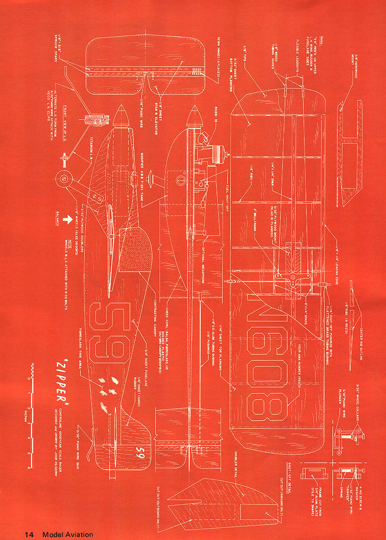 John F Kilsdonk THE CL GOODYEAR Scale Racing event has enjoyed seven very popular years official AMA event event least rule-wise basically same 1968 some noticeable changes have taken place intent article attempt describe techno logical changes update so-called state-of-the-art Zipper model presented arti cle designed take full advantage new technology currently available event Perhaps noticed im provement event has creased airspeed models primary reason has advent Scheurle-ported engine design Al though now quite few different engines available three-intakeport design Rossi 15 has quickly emerged rule Goodyear event one-for-one basis engine pro duces 2000 rpm previous king event Super Tigre 15 improvement does come easily though Rossi difficult find times approximately triple price ST Replacement parts limited im possible locate put forth effort locate willing pay asking price two-thirds way home Now have rework engine us have some professional several people rework engines varying degrees proficiency Without doubt George Aldrich has best track record reworking Rossi 15s Good year rework engine consists Control Line GoodyearAn Update zjpper Because little has published late type model definitive article plan fill deep information gap author well known CL Racing circles making new cylinder head retiming crankshaft fitting piston cylinder piston-to-cylinder fit prob ably critical item must run fast must restart George seems have magic touch area Contact him directly details prices GMA Models 1317 St Marie Mission Texas 78572 further performance increases might experiment exhaust tuning have much luck expansion chambers ala CL speed have seen some interesting results using megaphones megaphone shown Fig No basically Rossi megaphone cant find look Rossi expan sion chamber cut off back section will have same thing strike out also still want pursue project can make yourself lathe have made tried several variations shown have found design best Bench tests properly tuned Rossi 50 percent nitro fuel prop pitched Fig No 2 should show rpm reading between 20000 21000 rpm Using leather glove holding megaphone engine should indicate 1000 1500 rpm increase above figure quite interesting looks like quick performance gain However gain static rpm due megaphone may fully realized air due some increase drag frontal area megaphone although some definite im provement will found Zipper used test bed megaphone particular design selected due its wing location respect axial centerline other September 1975 13 shut-off shown actuated pushrod Close-up model shows salient features design particular note cheekfull-down position megaphone fits snugly cowl covers fuel tank cowl removable access tank Rossi 15 producesover wing adds 1 OOO 1500 rpm sizeable rpm increase over Supertigre three times costthe static thrust NO OCR TEXT Control Line Goodyear words megaphone has clear wing Midget Mustangs several other designs low wings fit criteria also wings too low causing peculiar flying characteristics especially higher altitudes flight tests both megaphone indicate megaphone gives approximately 05 sec onds advantage eight laps about three mph Construction construction very straightforward typical Goodyear racers exception fuel tank stallation inboard side fuse lage necessary provide clearance megaphone fuel shut-off also necessitates fabricating large cheek cowl house fuel tank have access vacuum-forming facility fabricated 060 acetate plastic turned out similar bubble canopy could also probably use Alternate con struction cowl also possible balsa and/or fiberglass fuel tank held position rubber bands cowl held place angle brackets model shown However could just well epoxy both fuel tank cowl 750 3625 7553630 573 REF Not INSIDE DIAMETERS ARE CRITICAL OU1S0E DIAMETERS VARY WITH WALL THICKNESS ROSSI IS MEGAPHONE FIGURE NO1 place would sacrifice removeability case repair fuel shut-off shown plans mouse trap design fabricated inum plate using hack band saw some file work other components ordinary piano wire Du Bro wheel collars spring 080111 ID 020 WALL CONSTANT 023 MTL ALUMHUM September 1975 15 Above Fuel shut-off fits neatly between megaphone fuselage Right Another view megaphone source givenalso gear 00 NOT SCALE Downb JFK Left Underneath view shows landing gear fuel line details Another type landing gear may substituted Right Overall view model Design selected positions wing clear megaphone 0 I I 2 II I INC HE S 4-3/4 5 q5-1/2 5-1/2 q6 PROP PITCH TABLE FIGURE NO2 Control Line Goodyear springs have found best can purchased good hardware stores Select-A-Spring No 1 Make sure after shut-off assembled will completely squeeze off two pieces tubing tripped Alternate shut offs also commercially available W-K Hobbies 19 N Main Centerville Ohio 45459 513 433-0752 landing gear shown 060-inch titanium Since material hard find difficult work get pre-bent ready install Glenn Lee 819 Mandrake Batavia III 60510 Glenn also has available some excellent polyurethane wheels finishing technique prefer cover entire wing -oz fiber glass cloth polyester surfacing resin K&B Hobbypoxy Sig etc using microballoons fillets nicks After surface has prepared finish sanded 150-grit paper two coats Hobbypoxy color sprayed wet sanding between coats decals applied canopy trim put coat clear Hobbypoxy sprayed wet sanded 600 paper rubbed out waxed Install engine other hardware youre ready fly propeller next critical item fiberglass props seem give best performance also durable Bartels props made Ger about elusive Rossi engines K&W also makes some nice props available through Joe Klause 5851 Sandstone Dr Durham NC 27707 also other outlets basic 7-6 prop used pitched least start values shown Fig No 2 best results pitch gauge should used might experiment some different prop pitches values shown what have found best also necessary maintain same width thickness both prop blades pitching station dial caliper works best After have completed pitching routine make sur