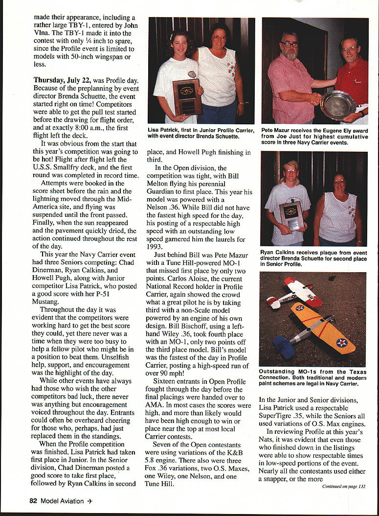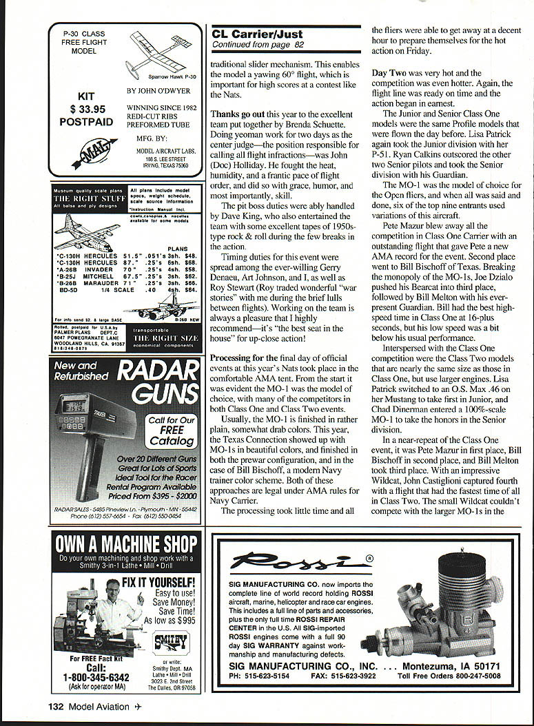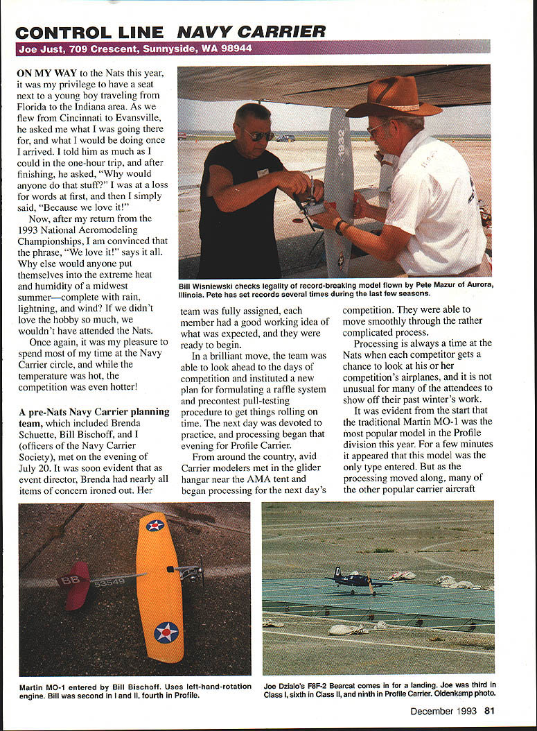CONTROL LINE NAVY CARRIER Eq rT-Juq II LsiAIEPI izI- Y WAY Nats year privilege have seat next young boy traveling Florida Indiana area As flew Cincinnati Evansville asked what going what would doing once arrived told him much could one-hour trip after finishing asked would anyone stuff loss words first simply said 'Because love it' Now after return 1993 National Aeromodeling Championships am convinced phrase love says else would anyone put themselves extreme heat humidity midwest summercomplete rain lightning wind didnt love hobby much wouldnt have attended Nats Once again pleasure spend time Navy Carrier circle temperature hot competition hotter pre-Nats Navy Carrier planning team included Brenda Schuette Bill Bischoff officers Navy Carrier Society met evening July 20 soon evident event director Brenda nearly items concern ironed out team fully assigned member good working idea what expected ready begin brilliant move team able look ahead days competition instituted new plan formulating raffle system precontest pull-testing procedure get things rolling time next day devoted practice processing began evening Profile Carrier around country avid Carrier modelers met glider hangar near AMA tent began processing next days competition able move smoothly through rather complicated process Processing always time Nats competitor gets chance look competitions airplanes unusual attendees show off past winters work evident start traditional Martin MO-i popular model Profile division year few minutes appeared model type entered processing moved along other popular carrier aircraft December 1993 81 Bill Wisniewski checks legality record-breaking model flown Pete Mazur Aurora Illinois Pete has set records several times during last few seasons Martin MO-i entered Bill Bischoff Uses left-hand-rotation Joe Dzialos F8F-2 Bearcat comes landing Joe third engine Bill second II fourth Profile Class sixth Class II ninth Profile Carrier Oldenkamp photo made appearance including rather large TBY- 1 entered John Vina TRY-i made contest spare since Profile event limited models 50-inch wingspan less Thursday July 22 Profile day Because preplanning event director Brenda Schuette event started right time Competitors able get pull test started before drawing flight order exactly 800 am first flight left deck obvious start years competition going hot Right after flight left USS Smallfry deck first round completed record time Attempts booked score sheet before rain lightning moved through MidAmerica site flying suspended until front passed Finally sun reappeared pavement quickly dried action continued throughout rest day year Navy Carrier event three Seniors competing Chad Dinerman Ryan Calkins Howell Pugh along Junior competitor Lisa Patrick posted good score P-Si Mustang Throughout day evident competitors working hard get best score could yet never time too busy help fellow pilot might position beat Unselfish help support encouragement highlight day other events have always wish other competitors bad luck never anything encouragement voiced throughout day Entrants could often overheard cheering perhaps just replaced standings Profile competition finished Lisa Patrick taken first place Junior Senior division Chad Dinerman posted good score take first place followed Ryan Calkins second place Howell Pugh finishing third Open division competition tight Bill Melton flying perennial Guardian first place year model powered Nelson 36 Bill did have fastest high speed day posting respectable high speed outstanding low speed garnered him laurels 1993 Just behind Bill Pete Mazur Tune Hill-powered MO-i missed first place two points Carlos Aloise current National Record holder Profile Carrier again showed crowd what great pilot taking third non-Scale model powered engine own design Bill Bischoff using lefthand Wiley 36 took fourth place MO- 1 two points off third place model Bills model fastest day Profile Carrier posting high-speed run over 90 mph Sixteen entrants Open Profile fought through day before final placings handed over AMA cases scores high likely would have high enough win place near top local Carrier contests Seven Open contestants using variations K&B 58 engine also three Fox 36 variations two OS Maxes Wiley Nelson Tune Hill vuisianaing MU-is trom Texas Connection Both traditional modern paint schemes legal Navy Carrier Junior Senior divisions Lisa Patrick used respectable SuperTigre 35 Seniors used variations OS Max engines reviewing Profile years Nats evident finished down listings able show respectable times low-speed portions event Nearly contestants used either snapper Continued page 132 82 Model Aviation * Lisa Patrick first Junior Profile Carrier event director Brenda Schuette Pete Mazur receives Eugene Ely award Joe Just highest cumulative score three Navy Carrier events Ryan Calkins receives plaque event director Brenda Schuette second place Senior Profile 7 Sparrow Hawk P-30 BY JOHN ODWYER WINNING SINCE 1982 REDI-CUT RIBS PREFORMED TUBE MEG BY MODEL AIRCRAFT LABS tOE S LEE STREET IRVING TEXAS 75060 FIX IT YOURSELF use Save Time As low $ 995 CallSmithy Dept MA 1-800-345-6342Lathe l 3023 F 2nd Street Ask operator MAThe Dalles OR 97058 CL CarrierlJust Continued page 82 traditional slider mechanism enables model yawing 600 flight important high scores contest like Nats Thanks go out year excellent team put together Brenda Schuette Doing yeoman work two days center judgethe position responsible calling flight infractionswas John Doc Holliday fought heat humidity frantic pace flight order did grace humor importantly skill pit boss duties ably handled Dave King also entertained team some excellent tapes 1950stype rock & roll during few breaks action Timing duties event spread among ever-willing Geny Denaeu Art Johnson well Roy Stewart Roy traded wonderful war stories during brief lulls between flights Working team always pleasure highly recommendits best seat house up-close action Processing final day official even