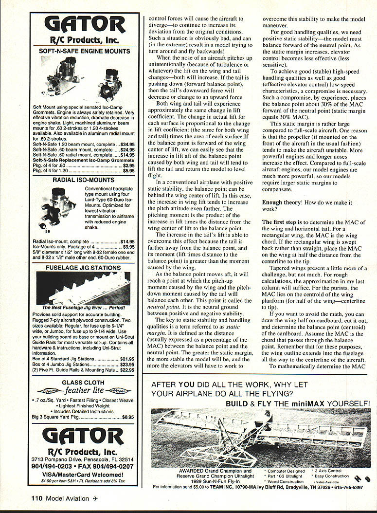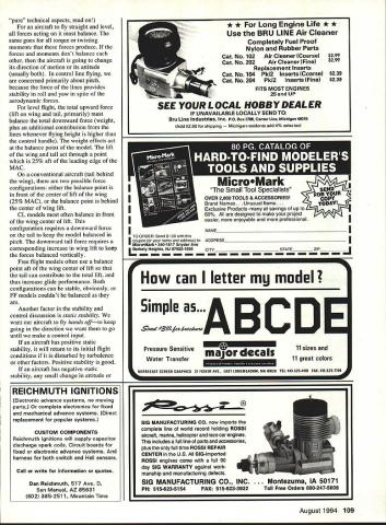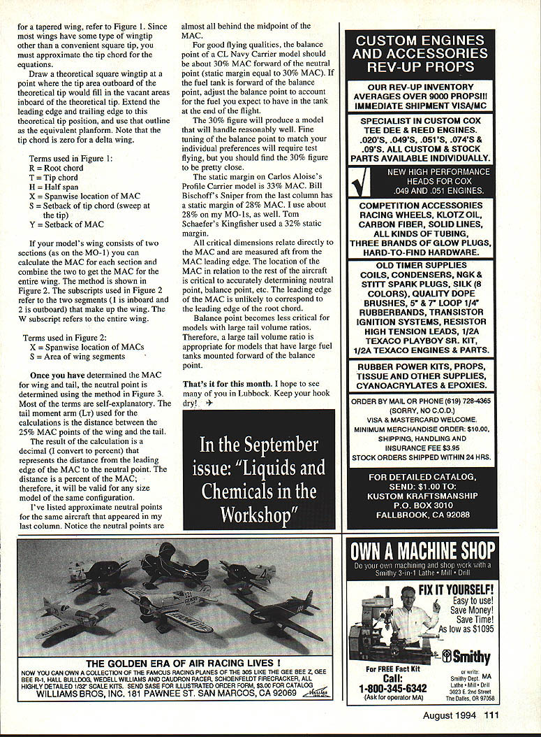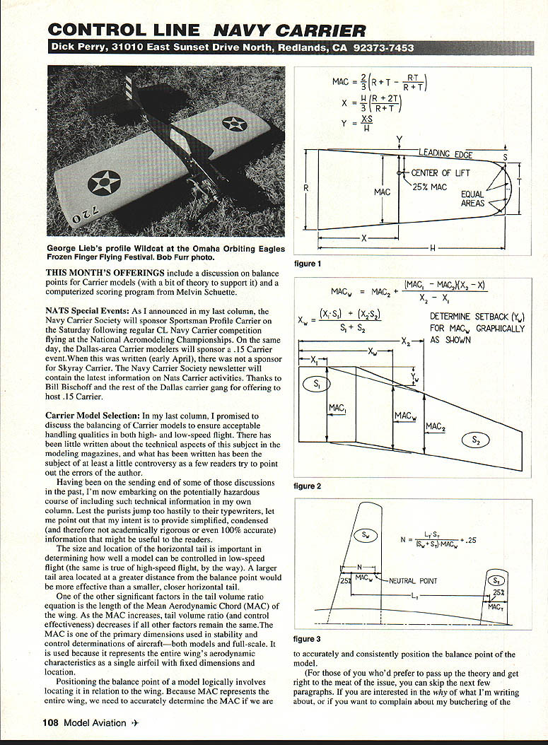 CONTROL LINE NAVY CARRIER THIS MONTHS OFFERINGS include discussion balance points Carrier models bit theory support computerized scoring program Melvin Schuette NATS Special Events As announced last column Navy Carrier Society will sponsor Sportsman Profile Carrier Saturday following regular CL Navy Carrier competition flying National Aeromodeling Championships same day Dallas-area Carrier modelers will sponsor 15 Carrier eventWhen written early April sponsor Skyray Carrier Navy Carrier Society newsletter will contain latest information Nats Carrier activities Thanks Bill Bischoff rest Dallas carrier gang offering host 15 Carrier Carrier Model Selection last column promised discuss balancing Carrier models ensure acceptable handling qualities both high- low-speed flight has little written about technical aspects subject modeling magazines what has written has subject least little controversy few readers try point out errors author Having sending end some discussions past Im now embarking potentially hazardous course including such technical information own column Lest purists jump too hastily typewriters let point out intent provide simplified condensed therefore academically rigorous 100% accurate information might useful readers size location horizontal tail important determining well model can controlled low-speed flight same true high-speed flight way larger tail area located greater distance balance point would effective smaller closer horizontal tail other significant factors tail volume ratio equation length Mean Aerodynamic Chord MAC wing As MAC increases tail volume ratio control effectiveness decreases other factors remain sameThe MAC primary dimensions used stability control determinations aircraftboth models full-scale used because represents entire wings aerodynamic characteristics single airfoil fixed dimensions location Positioning balance point model logically involves locating relation wing Because MAC represents entire wing need accurately determine MAC MAC T x JJR2T 3 RT / Y H Y LEADING EDGE 5 CENTER OF LiFT RMAC25% MAC EQUAL AREAS x H figure 1 MACW MAC2X2 — x xw 2 Ii ci MAC x-x 2 DETERMINE SETBACK Y FOR MACW GRAPI-JICALLY AS SI-ION Y w MACW MAC2 figure 2 N LTST S, O N j 25 MACWNEUTRAL POINT 25% / MAC figure 3 accurately consistently position balance point model whod prefer pass up theory get right meat issue can skip next few paragraphs interested what Im writing about want complain about butchering 108 Model Aviation ge Liebs profile Wildcat Omaha Orbiting Eagles Frozen Finger Flying Festival Bob Furr photo pure~ technical aspects read aircraft fly straight level forces acting must balance same goes torque twisting moments forces produce forces moments dont balance other aircraft going change its direction motion its attitude usually both control line flying concerned primarily about pitch because force lines provides stability roll yaw spite aerodynamic forces level flight total upward force lift wing tail primarily must balance total downward force weight plus additional contribution lines whenever flying height higher control handle weight effects act balance point model lift wing tail act through point 25% aft leading edge MAC conventional aircraft tail behind wing two possible force configurations either balance point front center lift wing 25% MAC balance point behind center wing lift CL models often balance front wing center lift configuration requires downward force tail keep model balanced pitch downward tail force requires corresponding increase wing lift keep forces balanced vertically Free flight models often use balance point aft wing center lift tail can contribute total lift thus increase glide performance Both configurations can stable obviously FF models couldnt balanced Another factor stability control discussion static stability want aircraft fly hands offto keep going direction want go until make control input aircraft has positive static stability will return its initial flight conditions disturbed turbulence other factors Positive stability good aircraft has negative static stability small change attitude * * Long Engine Life * * Use BRU LINE Air Cleaner Completely Fuel Proof Nylon Rubber Parts Cat No 102 Air Cleaner Coarse $299 Cat No 202 Air Cleaner Fine $299 Replacement Inserts Cat No 104 Pkl2 Inserts Coarse $239 Cat No 204 Pkl2 Inserts Fine $239 FITS MOST ENGINES 25and UP SEE YOUR LOCAL HOBBY DEALER IF UNAVAILABLE LOCALLY SEND TO Bru Line Industries Inc P0 Box 3786 Center Line Michigan 48015 Add $250 sh pp ngM ch gan residents add 4% sales tax p p mm U IKAVI7 i Small Tool Specialists TO ORDER Send $100 ibis Brand Names. Unusual Items OVER 2000 TOOLS & ACCESSORIES IODAY IExclusive Products-many say ngs up 60% designed make prolect easier enjoyable professional INAME name address ADDRESS coupon br MicroMark340-1617 Snyder Ave L Berkely Heights NJ 07922-1595CITYSTATE ZIP r can letter mu model Simple &vd66ckae B Pressure Sensitive Water Transfer major decals 11 sizes 11 great colors RTHEAST SCREEN GRAPHICS 21 FISHER AVE EAST LONGMEADOW MA 01025 TEL 413-5254110 FAX 413-525-77R August1994 109 REICHMUTH IGNITIONS [Electronic advance systems no moving parts] complete electronics fixed mechanical advance systems Direct replacement popular systems CUSTOM COMPONENTS Reichmuth Ignitions will supply capacitor discharge spark coils circuit boards fixed electronic advance systems harness both switch Hall sensors Call write information quotes Dan Reichmuth 517 Ave D San Manuel AZ 85631 602 385-2511 Mountain Time SIG MANUFACTURING CO now imports complete line world record holding ROSSI aircraft marine helicopter race car engines includes full line parts accessories plus full time ROSSI REPAIR CENTER US SIG-imported ROSSI engines come full 90 day SIG WARRANTY against work manship manufacturing defects SIG MANUFACTURING CO INC . Montezuma IA 50171 PH 515-623-5154FAX 515-623-3922Toll Free Orders 800-247-5008 G0TOR RIC Products Inc SOFT-N-SAFE ENGINE MOUNTS So