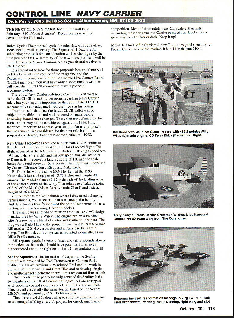 CONTROL LINE NAVY CARRIER El IT ~ YWA6I 6JiU ii-i U L5XUs] lid1 111 [ LI I- ~L L l NEXT CL NAVY CARRIER column will February 1995 Model Aviations December issue will devoted Nationals Rules Cycle proposal cycle rules will effect 1996-1997 well underway September 1 deadline submitting proposals consideration will closing time read summary new rules proposals will December Model Aviation should receive late October important look proposals because will little time between receipt magazine December 1 voting deadline Control Line Contest Board CLCB members will have short time write call district CLCB member make proposal recommendation Navy Carrier Advisory Committee NCAC assist CLCB making decisions regarding Navy Carrier rules input important district CLCB representative can adequately represent voting proposals pass initial CLCB ballot will subject modification will voted again before becoming formal rules changes defeated initial ballot may considered again until 1996 therefore important express support proposals would like considered next rule book proposal defeated cannot become rule until 1998 New Class Record received letter CLCB chairman Bill Bischoff describing April 17 Class record flight flight occurred AA contest Dallas Bills high speed 191 seconds 942 mph low speed 301 seconds 60 mph Bill received landing score 100 scale bonus total score 4522 points flight supervised Contest Director Terry Kirby Mike Greb Bills model same MO-l flew 1993 Nationals has wingspan 4375 inches weighs 43 ounces model balances 312 inches aft leading edge center section wing relates balance point 31% MAC Mean Aerodynamic Chord static margin 26% MAC refer last column discussed balancing Carrier models youll see Bills balance point slightly aftless 3/ inchof point recommended starting point trimming Carrier models engine left-hand rotation front-intake AAC design manufactured Willy Wiley engine ran 40% nitro Ritchs Brew blend castor synthetic lubricant plug K&B iL propeller APC 9 x 6 pusher Bill used 0S 4D carburetor Perry oscillating fuel pump Brodak control system mounted externally Bills Profile models Bill reports speeds nd faster thirty seconds slower practice model should have potential higher record under right conditions Congratulations Bill Seafire Squadron formation Supermarine Seafire aircraft provided Fred Cronenwett Canoga Park California have previously mentioned Fred work did Merle Mohring Grant Hiestand develop singleand multichannel electronic control units control line models models photo some Seafires built members 10 1st Screaming Eagles equipped two-line control systems electronic throttle control essentially same design based Seafire MkXV powered 0S 35 FP engines have solid 3/ sheet wing simplify construction encourage building club project one-design Carrier competition Most modelers CL Scale enthusiasts expanding horizons Carrier competition Looks like great way fill Carrier deck Keep up MO-i Kit Profile Carrier new CL kit designed specially Profile Carrier has hit market 44-inch span MO-l October1994 113 Bill Bischoffs MO-i set Class record 4522 points Willy Wiley L made engine CD Terry Kirby R certified flight Terry Kirbys Profile Carrier Grumman Wildcat built around Gotcha 460 SX foam wing Corehouse Supermarine Seafires formation belongs Virgil Wilbur lead Fred Cronenwett left wing Merle Mohring right wing slot WATER JET CUT CARBON FIBER STRIPS Latest Technology No Sanding Necessary Smooth Edges Great Spar Caps Precision Cut Strips Foam Wing Reinforcement Bondable Surfaces Lowest Prices CLi 007 Thick 1/4x4F2/pkgl $315 3/tx482pkgS350 CL2 014 Thidil I/4x4F 2/pkgl $400 3/8x48 2 oko $4i5 CLI 022 Thick l/4s4r 2Ipkgl S500 3/8x48 2 pkg $675 CL4 030 Thick 1/4x48 2/pkg S600 3/tx4r 2 pkgl $900 Send SASE informotion additional sizes roducts Add $500 shipping handling Calif resints add 825%tax Overseasordersadd 15% OrderCOD MCI VISA send check money order Aemspace Composite Products ThtghMnwterhik 14210 DOOLfTT1I 01 SAN LEANOAO CA 94511 352-2022 FAX 5101 352-2021 order call Eric Sanders gj l3-299-7684 5 pm-l0 pm 3904 Traine Dr Kettering OH 45429 Dft1tQtflW2ftL Far tAMs w/EGA VGA Built CAD~,.,rnu . ,. car pragramni Easy user Calculatea el Add washaul Feature! CompuFoil lots full sets ribs Pap up Feat cornpletewsthtranaitionsparslots building jig ho Cs etc. Campare air4 Plus much muca mare.na amercan 1 ib building jig hates lEnd tip airtaits estimations Hints spar slats FREE updatesl CampuFail Pro VI81-$65 Demo disk-$5 CompuFoil Plus-$45 155 airfoil library-SOO 5&H add $3 iiiillI I I I IIII III II T-~ 1 [v32][b-1-10-1-10]] II I . AFTER YOU DID ALL THE WORK WHY LET YOUR AIRPLANE DO ALL THE FLYING BUILD & FLY THE miniMAX YCLJRSFL F I t Reserve Grand Champion UllralightPart 103 ultralightEasy Construction 1989 Sun-N-Fun Fly-InWood ConstructionVideo Availa5ie information send $500 TEAM INC 10790-MA Ivy Bluff Rd Bradyville TN 37026 765-5397 114 Model Aviation red Golden State Models 2368 Avenue 396 Kingsburg CA 93631 Tel 209 897-1681 Contact Bob Kathy Ellis Golden State details ordering information NATS Unofficial Events Nationals aware Texas Connection responsible holding unofficial Carrier event competition Saturday decision sponsor Saturday flying made too ate make pre-Nationals column hope would have liked compete events learned through word-of-mouth Navy Carrier Society newsletter owe sincere thank Bill Bisehoff fellow Texas Carrier modelers efforts sponsoring Saturday events Also deserving thanks Brodaks Control Line Aviation Supplies Service Corehouse Ritchs Brew donating merchandise prizes J ELECTRONICS 900 Lucy RoadHowell Michigan 48843 517-546-2644 Service&RepairsForMostRadioControlSystems Utilizing Calibrated Test Equipment & Spectrum Analyzers Endorsed AMA RCMA Sticker Station #l05 Futaba Airtronics JR Ace HiTec Tower Cirrus World Engines & WE USE GENUINE FACTORY REPLACEMENT PARTS Complete 1991 Narrow Banding & Upgrades RCD / HITEC R/C DEALER FCC Licensed Speed Control Repairs Qualit