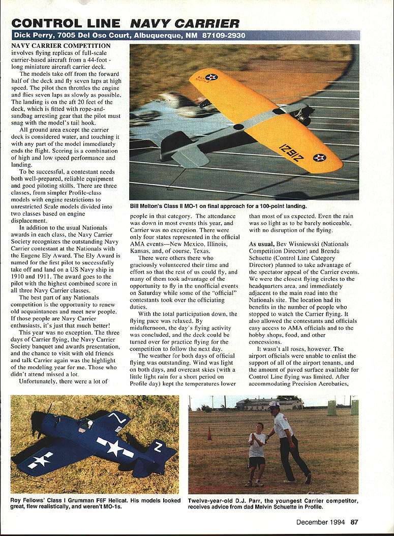 CONTROL LINE NAVY CARRIER mm rr NAVY CARRIER COMPETITION involves flying replicas full-scale carrier-based aircraft 44-foot long miniature aircraft carrier deck models take off forward half deck fly seven laps high speed pilot throttles engine flies seven laps slowly possible landing aft 20 feet deck fitted rope-andsandbag arresting gear pilot must snag models tail hook ground area except carrier deck considered water touching part model immediately ends flight Scoring combination high low speed performance landing successful contestant needs both well-prepared reliable equipment good piloting skills three classes simpler Profile-class models engine restrictions unrestricted Scale models divided two classes based engine displacement addition usual Nationals awards class Navy Carrier Society recognizes outstanding Navy Carrier contestant Nationals Eugene Ely Award Ely Award named first pilot successfully take off land US Navy ship 1910 1911 award goes pilot highest combined score three Navy Carrier classes best part Nationals competition opportunity renew old acquaintances meet new people people Navy Carrier enthusiasts its just much better year no exception three days Carrier flying Navy Carrier Society banquet awards presentation chance visit old friends talk Carrier again highlight modeling year didnt attend missed lot Unfortunately lot people category attendance down events year Carrier no exception four states represented official AMA eventsNew Mexico Illinois Kansas course Texas others graciously volunteered time effort rest us could fly took advantage opportunity fly unofficial events Saturday some official contestants took over officiating duties total participation down flying pace relaxed midafternoon days flying activity concluded deck could turned over practice flying competition follow next day weather both days official flying outstanding Wind light both days overcast skies little light rain short period Profile day kept temperatures lower us expected rain light barely noticeable no disruption flying As usual Bev Wisniewski Nationals Competition Director Brenda Schuette Control Line Category Director planned take advantage spectator appeal Carrier events closest flying circles headquarters area immediately adjacent main road Nationals site location its benefits number people stopped watch Carrier flying also allowed contestants officials easy access AMA officials hobby shops food other concessions wasnt roses however airport officials unable enlist support of airport tenants amount paved surface available Control Line flying limited After accommodating Precision Aerobatics December 1994 87 Bill Meltons Class II MO-i final approach 100-point landing Roy Fellows Class Grumman F6F Hellcat models lookedTwelve-year-old DJ Parr youngest Carrier competitor great flew realistically werent MO-isreceives advice dad Melvin Schuette Profile Speed Racing needed paved area no room other events Carrier events moved pavement airport parking ramp grass area opposite side headquarters area Anyone experience high plains west Texas will know grassland part country has little different meaning what us accustomed fact what grass was rather widely dispersed among rocks cactus fine dust predominant features flying site flying site characteristics significantly increased penalties normally associated landing off carrier deck water putting particular premium accurate landings reliable engines During practice flying Wednesday few fliers discovered another hazard Whenever handle moved short distance along ground picked up interior coating dust dust probably helped smooth rough edges handle mechanisms didnt much improve free operation us value Carrier flyers noted innovation problem solving however next day handles safely nestled gallon-sized plastic Ziploc freezer bags Im sure local merchants hadnt planned particular benefit having Nationals town Although participation down little year two Senior contestants Junior Ryan Calkins Howell Pugh vied Senior honors DJ Parr flew JuniorThis DJs first Nationals fact hes flying Carrier competition relatively short time first contest experience Sig contest June bragging about beating dad Melvin Schuette Profile DJ 12 years old Hell Junior few years definitely watch wind Profile Carrier day Thursday very close ideal wind very light steady change head wind over deck morning cross wind middle day giving contestant equal opportunity spite conditions first four flights ended before landing contestants learned low speed going judged Although warnings being given attitudes lower contestants expected judging very consistent throughout day Everyone soon adapted judging criteria top three scores day established next four flights Pete Mazur took early lead two flights later Bill Bischoff managed slightly better low-speed score pull ahead just under nine points next flight Mike Greb posted score would earn him third place day Jim Kirbys first flight good fourth place second attempt managed better high speed significantly improved low pose serious threat third place after score computed ended up just short points needed put MO- 1 models first four places Bill Melton posted best high speed day 92 mph using Nelson 36 OS carb APC 9 x 6 prop Unfortunately pushing good low speed called stopping forward motion first flight model touched ground second flight Another challenge raised Bill Calkins put good high speed best low speed day 211 seconds failed catch cable landing Senior competition Ryan Calkins posted first complete flight Howell Pugh posted higher score just 88 Model Aviation 4Jim Kirbys Class II Martin AM-i Mauler takes wave-off landing ii Class winner Pete Mazur center got plenty help L-R Howell Pugh H watches Dave King check lines before pull Mark Walton Bill Melton Ryan Bill Calkins test Howell won both Profile Class Senior before lunch break move first place 13 models entered three Guardians beautiful Skyraider Roy Fellows original foamwing F4F Wildcat built Terry Kirb