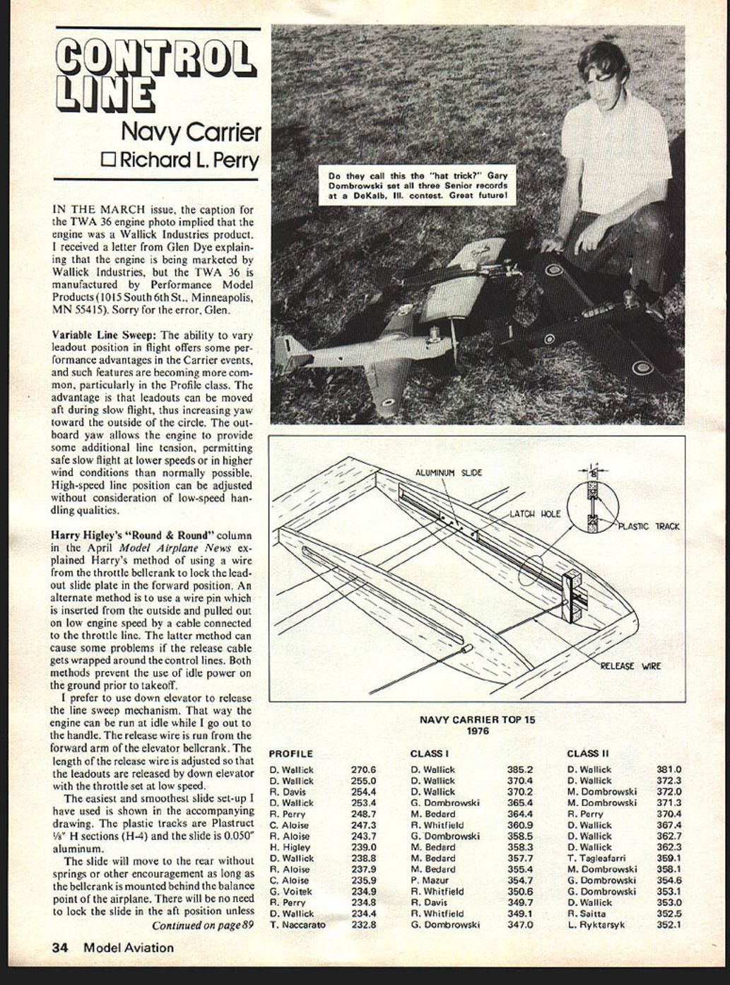 Navy Carrier Liii Richard L Perry IN THE MARCH issue caption TWA 36 engine photo implied engine Wallick Industries product received letter Glen Dye explain ing engine being marketed Wallick Industries TWA 36 manufactured Performance Model Products 1015 South 6th St Minneapolis MN 55415 Sorry error Glen Variable Line Sweep ability vary leadout position flight offers some per formance advantages Carrier events such features becoming com mon particularly Profile class advantage leadouts can moved aft during slow flight thus increasing yaw toward outside circle out board yaw allows engine provide some additional line tension permitting safe slow flight lower speeds higher wind conditions normally possible High-speed line position can adjusted consideration low-speed han dling qualities Harry Higleys Round & Round column April Model Airplane News ex plained Harrys method using wire throttle bellcrank lock leadout slide plate forward position An alternate method use wire pin inserted outside pulled out low engine speed cable connected throttle line latter method can cause some problems release cable gets wrapped around control lines Both methods prevent use idle power ground prior takeoff prefer use down elevator release line sweep mechanism way engine can run idle go out handle release wire run forward arm elevator bellcrank length release wire adjusted leadouts released down elevator throttle set low speed easiest smoothest slide set-up have used shown accompanying drawing plastic tracks Plastruct ctions HA slide 0050 aluminum slide will move rear springs other encouragement long bellcrank mounted behind balance point airplane will no need lock slide aft position unless Continued page 89 NAVY CARRIER TOP 15 1976 PROFILE D Wallick D Wallick R Davis D Wallick R Perry C Aloise R Aloise H Higley D Wallick R Aloise C Aloise G Voitek R Perry D Wallick T Naccarato CLASS 2706 2550 2544 2534 2487 2473 2437 2390 2388 2379 2359 2349 2348 2344 2328 0 Wallick D Wallick 0 Wallick G Dombrowski M Bedard R Whitfield G Dombrowskt M Bedard M Bedard M Bedard P Mazur R Whitfield R Davis R Whitfield G Dombrowiki CLASS II 3852 3704 3702 3654 3644 3609 3585 3583 3577 3554 3547 3506 3497 3491 3470 D Wallick D Wallick M Dombrowski M Dombrowski R Perry 0 Wallick D Wallick 0 Wallick T Tagleafarri M Dombrowski G Dombrowski G Dombrowski D Wallick R Saitta L Ryktarsyk 34 Model Aviation LASliC TRACK NRELEASE WIRE N 3810 3723 3720 3713 3704 3674 3627 3623 3591 3581 3546 3531 3530 3525 3521 holds tail-rotor blades lack individual adjustments tail-rotor blades makes almost impossible per fectly track tail-rotor blades causes vibration Also rigidity tail-rotor disc causes tail bounce around gusty winds have spent great deal time studying Delta Hinge Proto-type Jet Ranger have felt long time could adapted models Several hubs worked up hand tried models Sever al things immediately became apparent Perfect blade tracking instantly auto matic Vibration tracking dis appeared yawing action gusty wind greatly reduced What ac tually takes place instead wind gust moving tail moved tail-rotor disc automatically added pitch opposite blade instantly brought disc back normal 90 de grees tail-rotor shaft Because precision hub must hinged practically impos sible average modeler build hub has made available Miniature Aircraft Supply 2563 Diversi fied Way Orlando FL 32807 Next months column will cover rigid mounting swashplate smoother cyclic control head modifications super smooth flying can get permis sion developer Dont get Helicopter Nationals June 10 11 12 South Bend Indiana youre flying youre trying hard enough Walt Schoonard 2080 Sharon Rd Winter Park FL 32789 CL Navy Carrier/Perry continued page 34 bellcrank close balance point necessary friction lock can made bending aft part track slide will bind track aft part its travel Engines K&B some good news some bad news First bad news looking plain-bearing version new K&B 58cc 35 Schnuerle ABC will have wait K&B produced plain-bearing 35 Series 75 engine based Series 71 ball bearing 40 still have 4000 stock after Slow Combat rules allowed use ball-bearing engines Rather get stuck again going wait before considering plain-bearing engine again Next year possible will no eventsincluding Profile Carrierwhich require plain bearing engines case plain bearing 58cc engine unlikely Now good news some time now have no good engines use twin-engine Carrier ship 15s little small Class 19s werent really competitive 29s too few too expensive Class II Check out new K&B ads will see quite variety ABC Schnuerle engines 325cc 19 would make good pair Class 35cc 21 could substituted make Class II twin Two 49cc 29 engines should make highly competitive Class II Dont forget five bonus points additional engine Carrier Newsletter Ted Kraver has written about starting Carrier newsletter Quite few people have brought up subject Ted first actually willing something has putting together sample plans send Carrier fliers interested such publication Plans eight pages printed monthly Annual subscription rate would $500 100 people subscribe less people subscribe some advertising interest shown Ted paying first printing interested receiving copy participating project helping expenses contributing contact Ted 1212 E Manhatton Dr Tempe AZ 85282 call him 602 838-1717 Top 15 Ive trying past year analyze Navy Carrier competition determine interest performance dif ferent areas country has formidable task because faulty reporting CDs Almost third contest reports omissions scores number age category contes tants because reproduction methods form layout impossible identify specific contest al though names usually allowed get some idea area thing able set up list top 15 scores 1976 season realize may two omissions because Job Opportunities Wind Tunnel model Demignerm und model mukerm Immediate openings growing company Designers Engineers Engr Aides Draftpersons N/C Programmers Model Makers Wind Tunnel Personnel offer pleasant working co