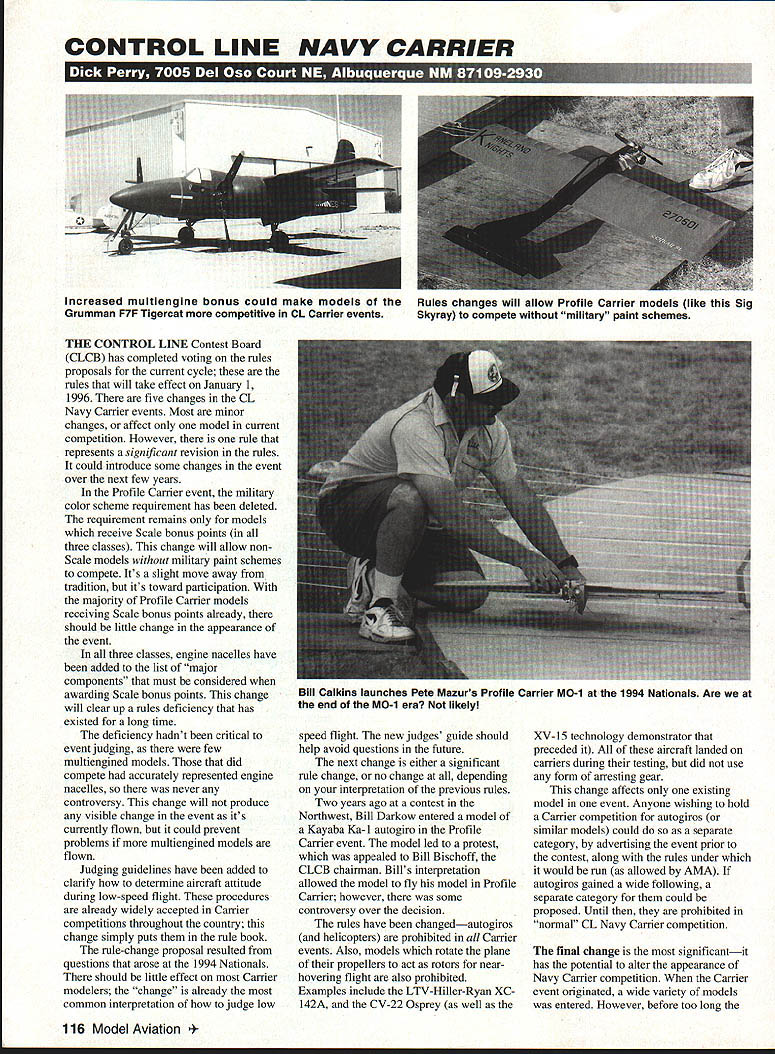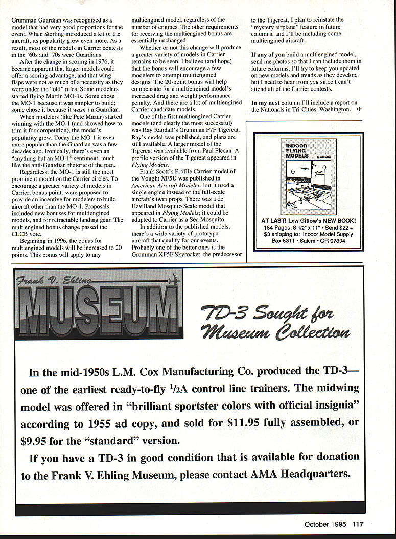 CONTROL LINE NAVY CARRIER U ' -- CONTROL LINE Contest Board CLCB has completed voting rules proposals current cycle rules will take effect January 1 1996 five changes CL Navy Carrier events Most minor changes affect model current competition However rule represents significant revision rules could introduce some changes event over next few years Profile Carrier event military color scheme requirement has deleted requirement remains models receive Scale bonus points three classes change will allow nonScale models military paint schemes compete Its slight move away tradition its toward participation majority Profile Carrier models receiving Scale bonus points already should little change appearance event three classes engine nacelles have added list major components must considered awarding Scale bonus points change will clear up rules deficiency has existed long time deficiency hadnt critical event judging few multiengined models did compete accurately represented engine nacelles never controversy change will produce visible change event its currently flown could prevent problems multiengined models flown Judging guidelines have added clarify determine aircraft attitude during low-speed flight procedures already widely accepted Carrier competitions throughout country change simply puts rule book rule-change proposal resulted questions arose 1994 Nationals should little effect Carrier modelers change already common interpretation judge low speed flight new judges guide should help avoid questions future next change either significant rule change no change depending interpretation previous rules Two years ago contest Northwest Bill Darkow entered model Kayaba Ka- 1 autogiro Profile Carrier event model led protest appealed Bill Bischoff CLCB chairman Bills interpretation allowed model fly model Profile Carrier however some controversy over decision rules have changedautogiros helicopters prohibited Carrier events Also models rotate plane propellers act rotors nearhovering flight also prohibited Examples include LTV-Hiller-Ryan XC 142A CV-22 Osprey well XV- 15 technology demonstrator preceded aircraft landed carriers during testing did use form arresting gear change affects existing model event Anyone wishing hold Carrier competition autogiros similar models could separate category advertising event prior contest along rules under would run allowed AMA autogiros gained wide following separate category could proposed Until prohibited normal CL Navy Carrier competition final change significantit has potential alter appearance Navy Carrier competition Carrier event originated wide variety models entered However before too long 116 Model Aviation eased multiengine bonus could make models Rules changes will allow Profile Carrier models like Sig Grumman F7F Tigercat competitive CL Carrier events Skyray compete military paint schemes Bill Calkins launches Pete Mazurs Profile Carrier MO-i 1994 Nationals Are end MO-i era likely Grumman Guardian recognized model very good proportions event Sterling introduced kit aircraft its popularity grew As result models Carrier contests 60s 70s Guardians After change scoring 1976 became apparent larger models could offer scoring advantage wing flaps much necessity under old rules Some modelers started flying Martin MO-Is Some chose MO- 1 because simpler build some chose because wasnt Guardian modelers like Pete Mazur started winning MO-i showed trim competition models popularity grew Today MO-I popular Guardian few decades ago Ironically theres anything MO- 1 sentiment much like anti-Guardian rhetoric past Regardless MO-I still prominent model Carrier circles encourage greater variety models Carrier bonus points proposed provide incentive modelers build aircraft other MO-I Proposals included new bonuses multiengined models retractable landing gear multiengined bonus change passed CLCB vote Beginning 1996 bonus multiengined models will increased 20 points bonus will apply multiengined model regardless number engines other requirements receiving multiengined bonus essentially unchanged Whether change will produce greater variety models Carrier remains seen believe hope bonus will encourage few modelers attempt multiengined designs 20-point bonus will help compensate multiengined models increased drag weight performance penalty lot multiengined Carrier candidate models first multiengined Carrier models clearly successful Ray Randalls Grumman F7F Tigercat Rays model published plans still available larger model Tigercat available Paul Plecan profile version Tigercat appeared Flying Models Frank Scotts Profile Carrier model Vought XF5U published American Aircraft Modeler used single engine instead full-scale aircrafts twin props de Havilland Mosquito Scale model appeared Flying Models could adapted Carrier Sea Mosquito addition published models theres wide variety prototype aircraft qualify events Probably better ones Grumman XF5F Skyrocket predecessor Tigercat plan reinstate mystery airplane feature future columns Ill including some multiengined aircraft build multiengined model send photos can include future columns Ill try keep updated new models trends develop need hear since cant attend Carrier contests next column Ill include report Nationals Tn-Cities Washington Scac$ ot Wtaeam G&C4 mid-1950s LM Cox Manufacturing Co produced TD-3 earliest ready-to-fly 1/2A control line trainers midwing model offered brilliant sportster colors official insignia according 1955 ad copy sold $1195 fully assembled $995 standard~ version have TD-3 good condition available donation Frank V Ehling Museum please contact AMA Headquarters October1995 117 INDOOR FLYING MODELS AST Lew Gitlows NEW BOOK 184 Pages8 112x lrSend$22 $3 shipping Indoor Model Supply Box 5311 Salem OR 97304