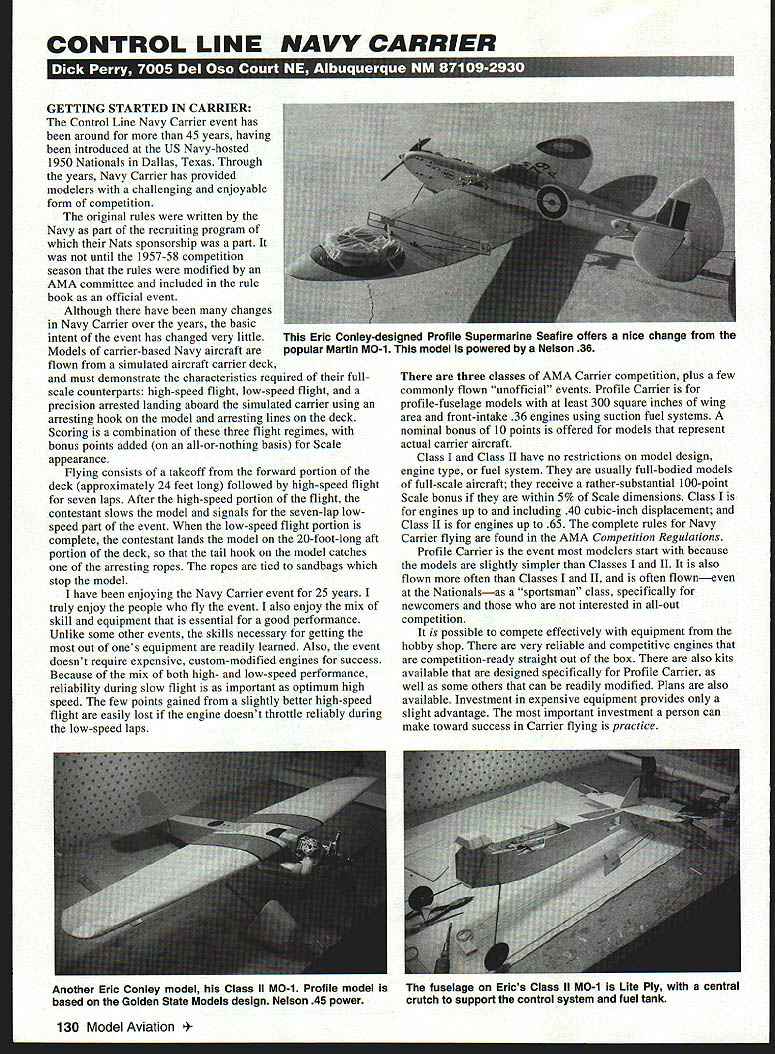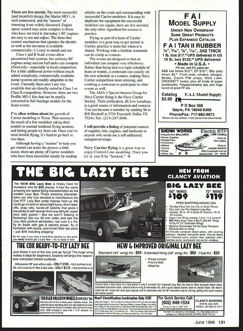 CONTROL LINE NAVY CARRIER GETTING STARTED IN CARRIER Control Line Navy Carrier event has around 45 years having introduced US Navy-hosted 1950 Nationals Dallas Texas Through years Navy Carrier has provided modelers challenging enjoyable form competition original rules written Navy part recruiting program Nats sponsorship part until 1957-58 competition season rules modified AMA committee included rule book official event Although have changes Navy Carrier over years basic intent event has changed very little Models carrier-based Navy aircraft flown simulated aircraft carrier deck must demonstrate characteristics required fullscale counterparts high-speed flight low-speed flight precision arrested landing aboard simulated carrier using arresting hook model arresting lines deck Scoring combination three flight regimes bonus points added all-or-nothing basis Scale appearance Flying consists takeoff forward portion deck approximately 24 feet long followed high-speed flight seven laps After high-speed portion flight contestant slows model signals seven-lap lowspeed part event low-speed flight portion complete contestant lands model 20-foot-long aft portion deck tail hook model catches arresting ropes ropes tied sandbags stop model have enjoying Navy Carrier event 25 years truly enjoy people fly event also enjoy mix skill equipment essential good performance Unlike some other events skills necessary getting out ones equipment readily learned Also event doesnt require expensive custom-modified engines success Because mix both high- low-speed performance reliability during slow flight important optimum high speed few points gained slightly better high-speed flight easily lost engine doesnt throttle reliably during low-speed laps three classes AMA Carrier competition plus few commonly flown unofficial events Profile Carrier profile-fuselage models least 300 square inches wing area front-intake 36 engines using suction fuel systems nominal bonus 10 points offered models represent actual carrier aircraft Class Class LI have no restrictions model design engine type fuel system usually full-bodied models full-scale aircraft receive rather-substantial 100-point Scale bonus within 5% Scale dimensions Class engines up including 40 cubic-inch displacement Class LI engines up 65 complete rules Navy Carrier flying found AMA Competition Regulations Profile Carrier event modelers start because models slightly simpler Classes II also flown often Classes II often flowneven Nationalsas sportsman class specifically newcomers interested all-out competition possible compete effectively equipment hobby shop very reliable competitive engines competition-ready straight out box also kits available designed specifically Profile Carrier well some others can readily modified Plans also available Investment expensive equipment provides slight advantage important investment person can make toward success Carrier flying practice 130 Model Aviation Conley-designed Profile Supermarine Seafire offers nice change popular Martin MO-i model powered Nelson 36 Another Eric Conley model Class II MO-i Profile model based Golden State Models design Nelson 45 power fuselage Erics Class II MO-i Lite Ply central crutch support control system fuel tank few secrets successful plentiful design Martin MO-i well understood secrets trimming widely discussed Engine speed control may seem complex have tried todays RC engines easy use adjust three-line control mechanism operates throttle well elevators available commercially its easy install use Class II Scale events allow pressurized fuel systems ordinary RC engines using suction fuel tanks can compete effectivelyespecially local competition little additional power much added complexity commercially available pump systems readily adaptable event Currently arent kits available directly suited Class Class II competition However two Profile MO-i kits can readily converted full-fuselage models Scale events Ive often written about growth Carrier modeling Texas success result few modelers taking models normal weekend flying sessions letting people try out Once youve tried throttle flying its hard go back two lines Although having mentor help get started can make process little easier plenty Carrier modelers have successful simply reading It-re NEW BIG Lazy Bee finally modelers fly BIG planes has same amazing low speed flying characteristics smaller Lazy Bee amazing character istics Cox decided manufacture Cox RTF Lazy Bee under license us could go on about tight turns short take offs snap rolls hands-off stability gives ability self-recover attitude super slow stall speed Seeing Believing Get 35 mm video see Lazy Bee perform aerobatics taxi over 2 x 4s fly floats gas & electric power fly formation ducks morel New low price just $10 including shipping way have hard time reading tiny print really should get Lazy Bee asy articles event corresponding successful Carrier modelers easy duplicate equipment successful modelers use again few secrets other ingredient success practice flying part team Carrier modelers great way get started Carrier practice fun shared Working familiar teammate can help contests events designed individual can compete very effectively Rather being tied rigid schedule heats rounds contestant can usually set own schedule contest making Navy Carrier competition relaxing enabling contestant participate other events well AMAs Special Interest Group Navy Carrier flying Navy Carrier Society publication Hi Low Landings good source information contacts can become member sending $6 Bill Bischoff 3734 Truesdell Dallas TX 75244 Tel 214 247-5046 will provide listing potential sources supplies kits engines hardware anyone sends self-addressed stamped envelope Navy Carrier flying great way enjoy Control Line modeling Once try youll hooked 60 WING72 WING 41094119 FREE SHIPPING INSIDE USA Big Plane Can Fly Small Places Flys Just Like Original Lazy Bee Accepta 25 45 2-Cycle Electric 45 70 4-Cycle Supe