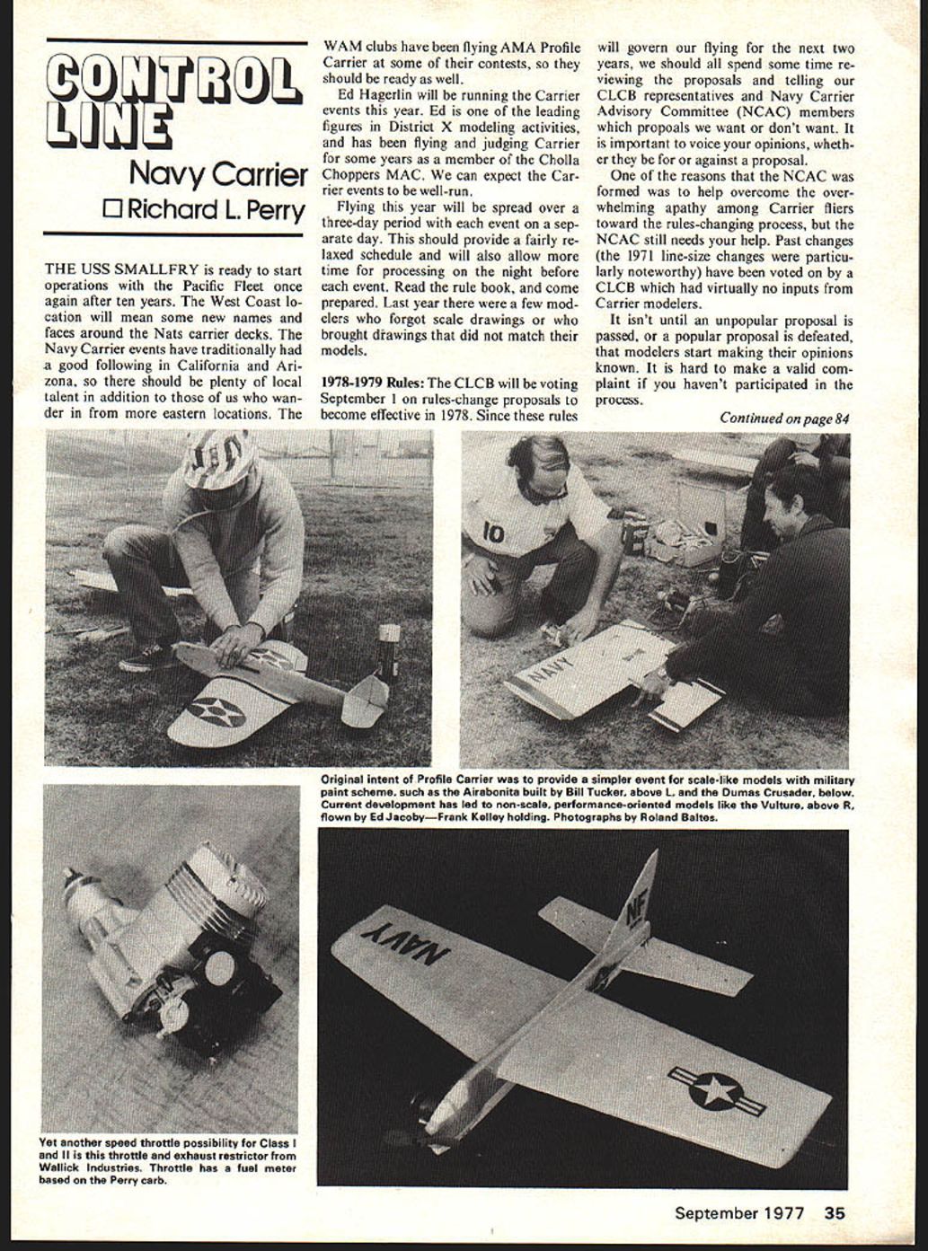 Navy Carrier U Richard 1 Perry THE USS SMALLFRY ready start operations Pacific Fleet once again after ten years West Coast lo cation will mean some new names faces around Nats carrier decks Navy Carrier events have traditionally good following California Ari zona should plenty local talent addition us wan der eastern locations WAM clubs have flying AMA Profile Carrier some contests should ready well Ed Hagerlin will running Carrier events year Ed leading figures District X modeling activities has flying judging Carrier some years member Cholla Choppers MAC can expect Car rier events well-run Flying year will spread over three-day period event sep arate day should provide fairly re laxed schedule will also allow time processing night before event Read rule book come prepared Last year few mod elers forgot scale drawings brought drawings did match models 1978-1979 Rules CLCB will voting September 1 rules-change proposals become effective 1978 Since rules will govern flying next two years should spend some time re viewing proposals telling CLCB representatives Navy Carrier Advisory Committee NCAC members propoals want dont want important voice opinions wheth er against proposal reasons NCAC formed help overcome over whelming apathy among Carrier fliers toward rules-changing process NCAC still needs help Past changes 1971 line-size changes particu larly noteworthy have voted CLCB virtually no inputs Carrier modelers isnt until unpopular proposal passed popular proposal defeated modelers start making opinions known hard make valid com plaint havent participated process September 1977 35 Continued page 84 Original intent Profile Carrier provide simpler event scale-like models military paint scheme such Airabonita built Bill Tucker above L Dumas Crusader below Current development has led non-scale performance-oriented models like Vulture above R flown Ed JacobyFrank Kelley holding Photographs Roland Baltes Yet another speed throttle pos y Class II throttle exhaust restrictor Wallick Industries Throttle has fuel meter based Perry carb Heres Balsarite TM Works. Iron-on coverings tend stick surface balsa often leaving trap ped air sagging coming unglued Balsarite sinks deep wood melts intermixes adhesive covering ironed No trapped air deep permanent adhesion Eliminates sag ging fuelcreep warping due mois ture makes hard-to-reach fillets easy cover use Monokote Solarfilm Coverite must use Balsarite takes gamble out covering iron-ons IRON-ON COVERING &L3j BALSA WOOD j ES IV E F USING WITH BALSARITE COVERITE 2779 Philmont Ave Huntingdcn Valley Pa machine original design through powerplant modification experience pertinent suggestions past have made current results possible CL Navy Carrier/Perry continued page 35 help participate year Ive asked Ted Kraver include rules questionnaire Hi Low Landing Carrier newsletter dont subscribe yet can get action sending five dollars Ted 1212 E Manhatton Dr Tempe AZ 85282 Send ques tionaires will see re sults get CLCR numerous proposals year three areas possible ma jor change subjects Profile Car rier engines bonus points scale-like models Profile Carrier event low-speed flight Profile Carrier engine proposal parallels similar proposals Slow Com bat Slow Rat Race purpose provide single set engine specifications three events help ensure ade quate supply engines available through normal retail outlets pro posals three major changes will probably voted separately would require engines produced least 1000 units Another would require crankcase crankshaft piston cylinder same manufacturer same engine design third change would delete plain-bearing require ment bonus point proposal would en courage use scale-like models Profile Carrier event bonus would small 10 points existing models will made obsolete yet should enough encourage building some scale-like models point award could changed next cycle after have some experience two types models competition scale re quirements quite liberal allow exist ing scale-like profile kits used permit simple installation of moveable surfaces commonly used Pro file Carrier models changes low-speed portion flights would two things would change penalty violations during low speed flight eliminate current conflicting rules say flight official after low-speed signal attempt violation dur ing low-speed flight Under proposed change low-speed violations would result loss low-speed score loss entire flight second change would delete current requirement model de viate radically flight characteris tics prototype substitute re quirement model exceed 600 nose-high attitude latter would provide uniformly enforceable definition Enforcement options include loss flight current penalty loss low-speed score intentional prolonged repeated deviations Another option five-point penalty time 600 limit exceeded would eliminate some judgment calls intentional uninten tional deviations failure correct imme diately would still mean loss flight low-speed score will require officials count deviations Summaries proposals results CLCB voting Competition Newsletter section past issues Richard L Perry S016 Angelita Ave Dayton 0H4S424 Ailerons/Bentson continued page 28 photographs Monterey illustrate simple modification can incorpo rated completed glider excessive work expense ailerons extend about two-thirds distance fuselage wing tips covering peeled back modifica tion made covering re-ironed back External aileron horns used avoid cutting fuselage open flew Monterey several times aileron installed good weather came before job finished aircraft rolled twice fast toward wing aileron Building scratch Id use slotted tubes engaged controls within fuselage im portant consideration model hits hard wings swing forward controls arent ripped out complete job coordinating controls producing realistic ap pearance flight reduce dihedral full-scale gliders may find will also have reduce verti cal tail area glider will tend drop its nose gain speed cir cling Spiral stability objectiv