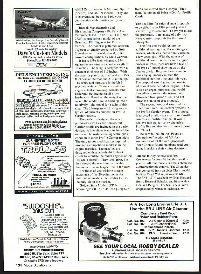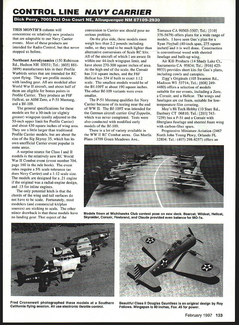 CONTROL LINE NAVY CARRIER THIS MONTHS column will concentrate relatively new products adaptable Navy Carrier events Most products intended Radio Control never stopped us before Northeast Aerodynamics 150 Robinson Rd Hudson NH 03051 Tel [603] 8815899 manufactures kits Profile Warbirds series intended RC sport flying profile models landing gear modeled after World War II aircraft about half eligible bonus points Profile Carrier produce F6F Hellcat A6M Zero P-Si Mustang Bf-109 general specifications models 50-inch slightly greater wingspan easily adjusted 50-inch upper limit Profile Carrier about 430 square inches wing area little larger traditional Profile Carrier models about size Sig Skyray 35 has its own unofficial Carrier event popular some areas surprise source Class II models relatively new RC World War II Combat event event number 704 page 160 rule book event rules require 5% scale tolerance does Navy Carrier 112 scale size models designed 21 engine original radial-engine design 15 inline engines potential hitch chords wing tail surfaces have scale Fortunately modelers commercial kit/plan sources sticking scale other minor drawback models have no landing gear aspect conversion Carrier use should pose no serious problem plus side models must weigh less 22 pounds including radio tend much lighter alternative conversions Scale RC kits aircraft am aware fit within 44-inch wingspan limit have about 270-300 square inches area high end scale Corsair has 314 square inches F6F Hellcat has 334 built exact 112 scale smallest models would Bf-109T about 190 square inches other Bf-109 variants smaller P-S 1 Mustang qualifies Navy Carrier because its testing near end WW II Bf-109T intended German aircraft carrier Graf Zeppelin never completed Tests also conducted modified early models Bf-109 lot variety available WW II RC Combat arena Gus Morfis Plans 4709 Green Meadows Ave Torrance CA 90505-5507 Tel [310] 378-5679 offers plans wide range models have seen Guss plan Ryan FirebaP 40-inch span 275 square inches well done Construction conventional wood sheeted fuselage built-up wing Air Kill Products 14 Shady Lake Ct Sacramento CA 95834 Tel [916] 4259933 provides short kits Guss plans including cowls canopies Ziggs Originals 105 Swanton Rd Madison WI 53714 Tel [608] 2494480 offers selection models suitable events including Zero Corsair Hellcat wings fuselages cut foam suitable lowtemperature film covering Meys Hi Tech Hobby 10 Starr Rd Danbury CT 06810 Tel [203] 7437259 has P-S 1 Corsair fiberglass fuselage sheeted foam wing carbon-fiber spars Progressive Miniature Aviation 2467 North John Young Pkwy Orlando FL 32804 Tel 407 298-8257 offers February 1997 133 Models flown Wichihawks Club contest pose new deck Bearcat Wildcat Hellcat Skyraider Corsair Firebrand Claude provided balance MO-is Fred Cronenwett photographed models Southern Beautiful Class II Douglas Dauntless original design Roy California flying session use electronic throttle control Fellows Wingspan 40 inches Fox 45 power rinnole tree cpoxyglass ruseiage cores nitty ssteontt Complete Instructions est Quality Craftsmanship Made USA Send $100 cash Brochure Daves Custom Models 10205 Spring Circle Austin TX 78736 Phone/Fax 512-288-2055 A6M2 Zero along Mustang Spitfire Seafire Bf-109 models conventional balsa-and-plywood construction plastic canopy cowl Brodak Manufacturing Distributing Company 100 Park Ave Carmichaels PA 15320 Tel 412 9662726 producing model Grumman F7F Tigercat Profile Carrier model patterned after Tigercat originally conceived Bob Smurthwaite designed its current configuration Mike Garmon has 43 1/3 inch wingspan 354 square inches wing area length 32 inches wing designed constant thickness 1 Y2 inches taper planform produces 15% thickness root 21% tip wood hardware kit received weighed 24 ounces engines tanks covering wheels belicrank including other hardware Based weight wood model should build up relatively light model twin size 354-square-inch wing area typical current competition Profile Carrier models model designed other purposes well Carrier Carrier details included basic design line slider included could installed using techniques common other Profile Carrier models minor modification required produce competition model engine nacelles nacelles designed relatively thick cheek cowls simulate radial engines full-scale aircraft look great exceed maximum allowable thickness 3/4 inch specified rules wishing take advantage 20-point bonus multiengine models Brodak F7F kit market Golden State Models RR 6 Box 9 Bloomington IL 61704 Tel [309] 8278765 has moved Georgia manufacture all-balsa MO-l Profile Carrier deadline rules change proposals effective 1999 passed just writing column have yet see proposals am aware two Navy Carrier proposals current rule cycle first would restore additional starting time multiengine models inadvertently deleted few years ago advent additional bonus points multiengine models 1996 now few type model showing up Carrier circle Because no twins flying nobody missed additional starting time until year proposal would grant minute additional time per added engine also urgent proposal would immediately restore two-minute allowance prior rules know status proposal second proposal would allow other three-line control systems Profile Carrier event proposal targeted allowing electronic throttle controls Profile Carrier would achieve objective changing Profile line requirements match Class sure look Focus Competition section MA summaries rules proposals Contest Board members need input making voting decisions Thanks Roy Fellows Fred Cronenwett contributing months photos four models Freds photo use electronic throttle control Skyraider converted older Class model built Virgil Wilbur MO-i SNJ AT-6 built Grant Hiestand House Balsa kit fitted OS 4OFP engine Sea Fury Freds original design 41-inch span SHIEm BAILS OUT Release scale-like Parachutistl real crowd pleaser lot fun .Brilliant colors Fl orange Fl pink ye