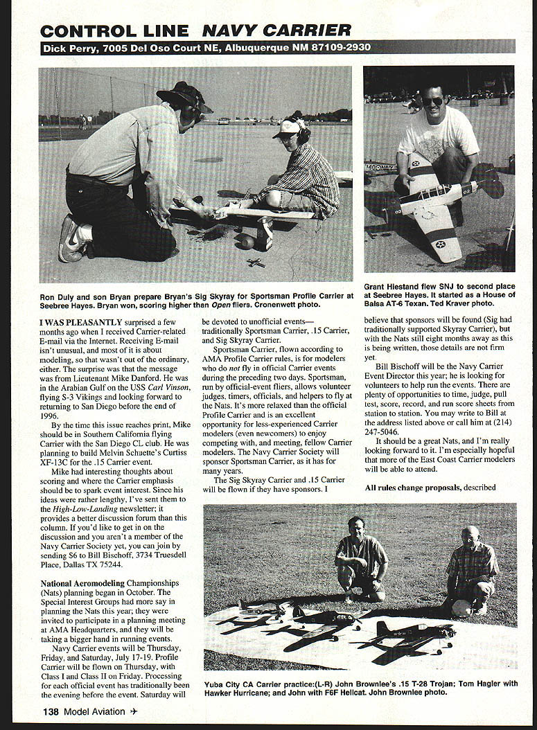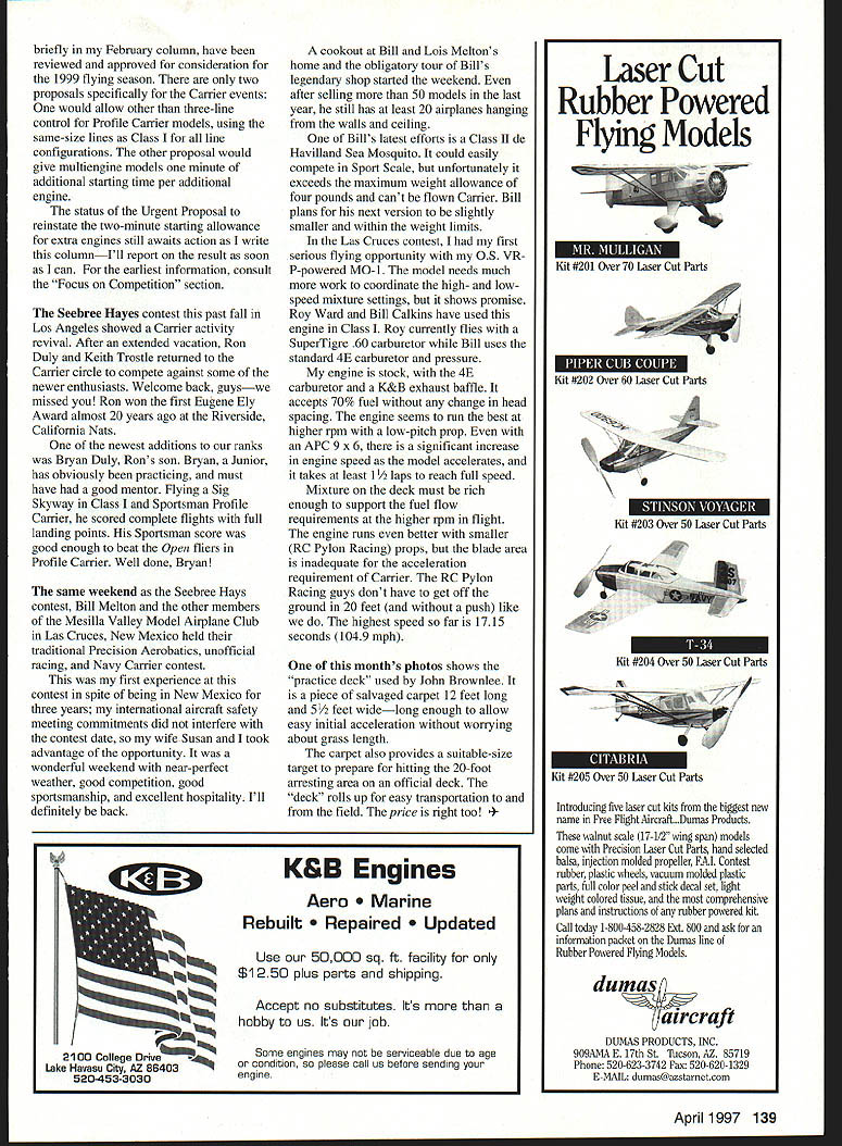 CONTROL LINE NAVY CARRIER m1T PLEASANTLY surprised few months ago received Carrier-related E-mail via Internet Receiving E-mail isnt unusual about modeling wasnt out ordinary either surprise message Lieutenant Mike Danford Arabian Gulf USS Carl Vinson flying S-3 Vikings looking forward returning San Diego before end 1996 time issue reaches print Mike should Southern California flying Carrier San Diego CL club planning build Melvin Schuette s Curtiss XF-13C 15 Carrier event Mike interesting thoughts about scoring Carrier emphasis should spark event interest Since ideas rather lengthy Ive sent High-Low-Landing newsletter provides better discussion forum column youd like get discussion arent member Navy Carrier Society yet can join sending $6 Bill Bischoff 3734 Truesdell Place Dallas TX 75244 National Aeromodeling Championships Nats planning began October Special Interest Groups say planning Nats year invited participate planning meeting AIVIA Headquarters will taking bigger hand running events Navy Carrier events will Thursday Friday Saturday July 17-19 Profile Carrier will flown Thursday Class Class II Friday Processing official event has traditionally evening before event Saturday will devoted unofficial events traditionally Sportsman Carrier 15 Carrier Sig Skyray Carrier Sportsman Carrier flown according AMA Profile Carrier rules modelers fly official Carrier events during preceding two days Sportsman run official-event fliers allows volunteer judges timers officials helpers fly Nats Its relaxed official Profile Carrier excellent opportunity less-experienced Carrier modelers newcomers enjoy competing meeting fellow Carrier modelers Navy Carrier Society will sponsor Sportsman Carrier has years Sig Skyray Carrier 15 Carrier will flown have sponsors believe sponsors will found Sig traditionally supported Skyray Carrier Nats still eight months away being written details firm yet Bill Bischoff will Navy Carrier Event Director year looking volunteers help run events plenty opportunities time judge pull test score record run score sheets station station may write Bill address listed above call him 214 247-5046 should great Nats Im really looking forward Im especially hopeful East Coast Carrier modelers will able attend 138 Model Aviation t Hiestand flew SNJ second place Ron Duly son Bryan prepare Bryans Sig Skyray Sportsman Profile Carrier atat Seebree Hayes started House Seebree Hayes Bryan won scoring higher Open fliers Cronenwett photoBalsa AT-6 Texan Ted Kraver photo rules change proposals described Yuba City CA Carrier practiceL-R John Brownlees 15 T-28 Trojan Tom Hagler Hawker Hurricane John F6F Hellcat John Brownlee photo briefly February column have reviewed approved consideration 1999 flying season two proposals specifically Carrier events would allow other three-line control Profile Carrier models using same-size lines Class line configurations other proposal would give multiengine models minute additional starting time per additional engine status Urgent Proposal reinstate two-minute starting allowance extra engines still awaits action write columnIll report result soon can earliest information consult Focus Competition section Seebree Hayes contest past fall Los Angeles showed Carrier activity revival After extended vacation Ron Duly Keith Trostle returned Carrier circle compete against some newer enthusiasts Welcome back guyswe missed Ron won first Eugene Ely Award almost 20 years ago Riverside California Nats newest additions ranks Bryan Duly Rons son Bryan Junior has obviously practicing must have good mentor Flying Sig Skyway Class Sportsman Profile Carrier scored complete flights full landing points Sportsman score good enough beat Open fliers Profile Carrier Well done Bryan same weekend Seebree Hays contest Bill Melton other members Mesilla Valley Model Airplane Club Las Cruces New Mexico held traditional Precision Aerobatics unofficial racing Navy Carrier contest first experience contest spite being New Mexico three years international aircraft safety meeting commitments did interfere contest date wife Susan took advantage opportunity wonderful weekend near-perfect weather good competition good sportsmanship excellent hospitality Ill definitely hack cookout Bill Lois Meltons home obligatory tour Bills legendary shop started weekend after selling 50 models last year still has least 20 airplanes hanging walls ceiling Bills latest efforts Class II de Havilland Sea Mosquito could easily compete Sport Scale unfortunately exceeds maximum weight allowance four pounds cant flown Carrier Bill plans next version slightly smaller within weight limits Las Cruces contest first serious flying opportunity OS VR P-powered MO-i model needs much work coordinate high- lowspeed mixture settings shows promise Roy Ward Bill Calkins have used engine Class Roy currently flies SuperTigre 60 carburetor Bill uses standard 4E carburetor pressure engine stock 4E carburetor K&B exhaust baffle accepts 70% fuel change head spacing engine seems run best higher rpm low-pitch prop APC 9 x 6 significant increase engine speed model accelerates takes least 1 /2 laps reach full speed Mixture deck must rich enough support fuel flow requirements higher rpm flight engine runs better smaller RC Pylon Racing props blade area inadequate acceleration requirement Carrier RC Pylon Racing guys dont have get off ground 20 feet push like highest speed far 1715 seconds 1049 mph months photos shows practice deck used John Brownlee piece salvaged carpet 12 feet long 51/2 feet widelong enough allow easy initial acceleration worrying about grass length carpet also provides suitable-size target prepare hitting 20-foot arresting area official deck deck rolls up easy transportation field price right too 4Laser Cut Rubber Powered Flying Models Kit #201 Over 70 Laser Cut Parts Kit #202 Over 60 Laser Cut Parts N Kit #203 Over 50 Laser Cut Parts Kit #204 Over 50 Laser Cut Parts Kit #205 Over 50 Laser Cut Parts Introducing five laser cut