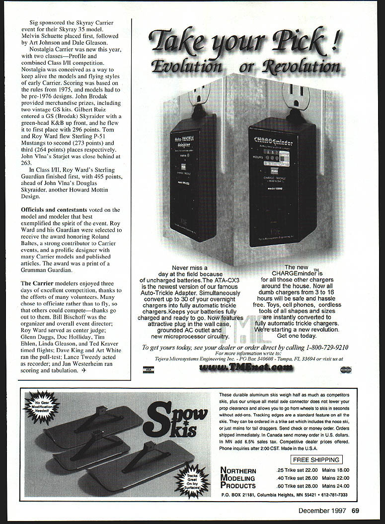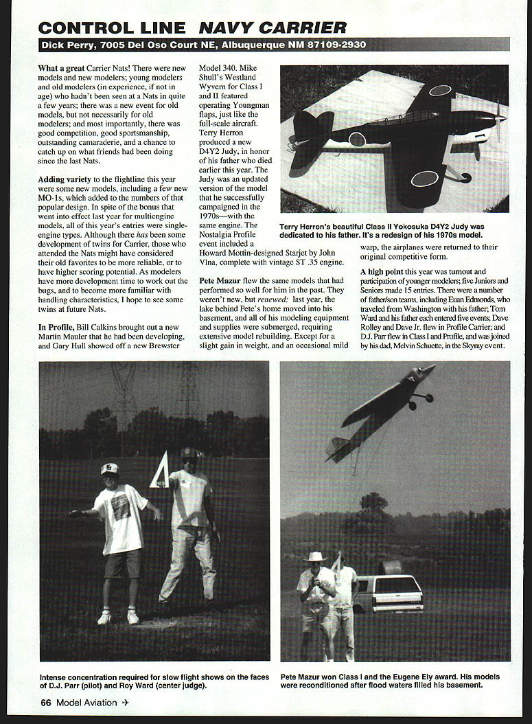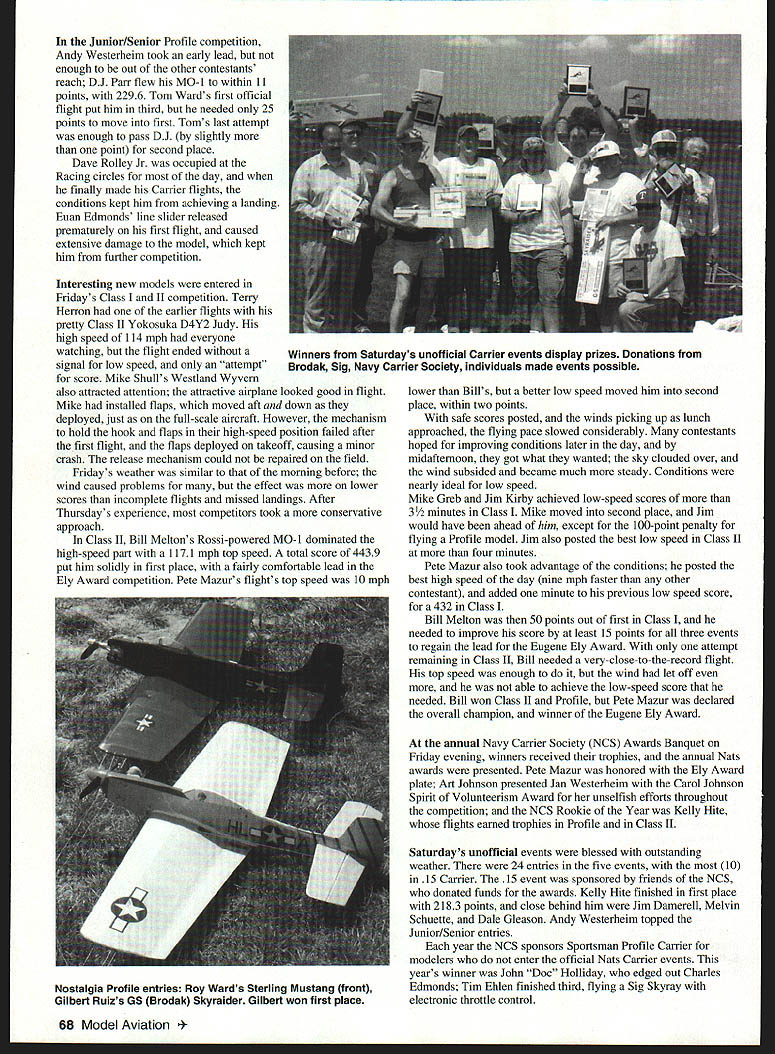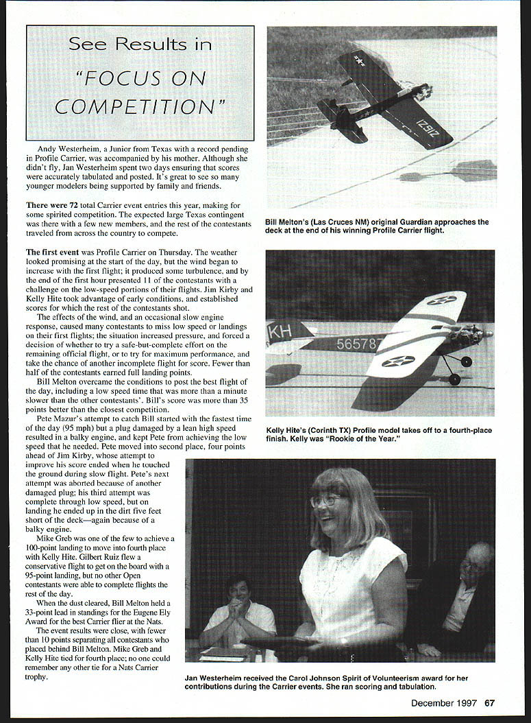 CONTROL LINE NAVY CARRIER What great Carrier Nats new models new modelers young modelers old modelers experience age hadnt seen Nats quite few years new event old models necessarily old modelers importantly good competition good sportsmanship outstanding camaraderie chance catch up what friends doing since last Nats Adding variety flightline year some new models including few new MO- ls added numbers popular design spite bonus went effect last year multiengine models years entries singleengine types Although has some development twins Carrier attended Nats might have considered old favorites reliable have higher scoring potential As modelers have development time work out bugs become familiar handling characteristics hope see some twins future Nats Profile Bill Calkins brought out new Martin Mauler developing Gary Hull showed off new Brewster Model 340 Mike Shull s Westland Wyvern Class II featured operating Youngman flaps just like full-scale aircraft Terry Herron produced new D4Y2 Judy honor father died earlier year Judy updated version model successfully campaigned 1970swith same engine Nostalgia Profile event included Howard Mottin-designed Starjet John Vlna complete vintage ST 35 engine Pete Mazur flew same models performed well him past werent new renewed last year lake behind Petes home moved basement modeling equipment supplies submerged requiring extensive model rebuilding Except slight gain weight occasional mild warp airplanes returned original competitive form high point year turnout participation younger modelers five Juniors Seniors made 15 entries number father/son teams including Fuan Edmonds traveled Washington father Tom Wani father entered five events Dave Rolley Dave Jr flew Profile Carrier DJ Pair flew Class Profile joined dad Melvin Schuette Skymy event 66 Model Aviation y Herrons beautiful Class II Yokosuka D4Y2 Judy dedicated father Its redesign 1970s model Intense concentration required slow flight shows faces Pete Mazur won Class Eugene Ely award models DJ Parr pilot Roy Ward center ludge reconditioned after flood waters filled basement Andy Westerheim Junior Texas record pending Profile Carrier accompanied mother Although didnt fly Jan Westerheim spent two days ensuring scores accurately tabulated posted Its great see younger modelers being supported family friends 72 total Carrier event entries year making some spirited competition expected large Texas contingent few new members rest contestantsBill Meltons Las Cruces NM original Guardian approaches traveled across country competedeck end winning Profile Carrier flight first event Profile Carrier Thursday weather looked promising start day wind began increase first flight produced some turbulence end first hour presented 11 contestants challenge low-speed portions flights Jim Kirby Kelly Hite took advantage early conditions established scores rest contestants shot effects wind occasional slow engine response caused contestants miss low speed landings first flights situation increased pressure forced decision whether try safe-but-complete effort remaining official flight try maximum performance take chance another incomplete flight score Fewer half contestants earned full landing points Bill Melton overcame conditions post best flight day including low speed time minute slower other contestants Bills score 35 points better closest competition Pete Mazurs attempt catch Bill started fastest time day 95 mph plug damaged lean high speed resulted balky engine kept Pete achieving low speed needed Pete moved second place four points ahead Jim Kirby attempt improve score ended touched ground during slow flight Petes next attempt aborted because another damaged plug third attempt complete through low speed landing ended up dirt five feet short deckagain because balky engine Mike Greb few achieve 100-point landing move fourth place Kelly Hite Gilbert Ruiz flew conservative flight get board 95-point landing no other Open contestants able complete flights rest day dust cleared Bill Melton held 33-point lead standings Eugene Ely Award best Carrier flier Nats event results close fewer 10 points separating contestants placed behind Bill Melton Mike Greb Kelly Hite tied fourth place no could remember other tie Nats Carrier trophy December 1997 67 See Results FOCUS ON COMPETITION Kelly Hites Corinth TX Profile model takes oft fourth-place finish Kelly Rookie Year Jan Westerheim received Carol Johnson Spirit Volunteerism award contributions during Carrier events ran scoring tabulation Junior/Senior Profile competition Andy Westerheim took early lead enough out other contestants reach DJ Parr flew MO-i within 11 points 2296 Tom Wards first official flight put him third needed 25 points move first Toms last attempt enough pass DJ slightly point second place Dave Rolley Jr occupied Racing circles day finally made Carrier flights conditions kept him achieving landing Euan Edmonds line slider released prematurely first flight caused extensive damage model kept him further competition Interesting new models entered Fridays Class II competition Terry Herron earlier flights pretty Class II Yokosuka D4Y2 Judy high speed 114 mph everyone watching flight ended signal low speed attempt score Mike Shulls Westland Wyvern also attracted attention attractive airplane looked good flight Mike installed flaps moved aft down deployed just full-scale aircraft However mechanism hold hook flaps high-speed position failed after first flight flaps deployed takeoff causing minor crash release mechanism could repaired field Fridays weather similar morning before wind caused problems effect lower scores incomplete flights missed landings After Thursdays experience competitors took conservative approach Class II Bill Meltons Rossi-powered MO-i dominated high-speed part 1171 mph top speed total score 4439 put him solidly first place fairly comfortable lead Ely Award competition Pete Mazurs flights top speed 10 mph lower Bills better low speed moved him secon