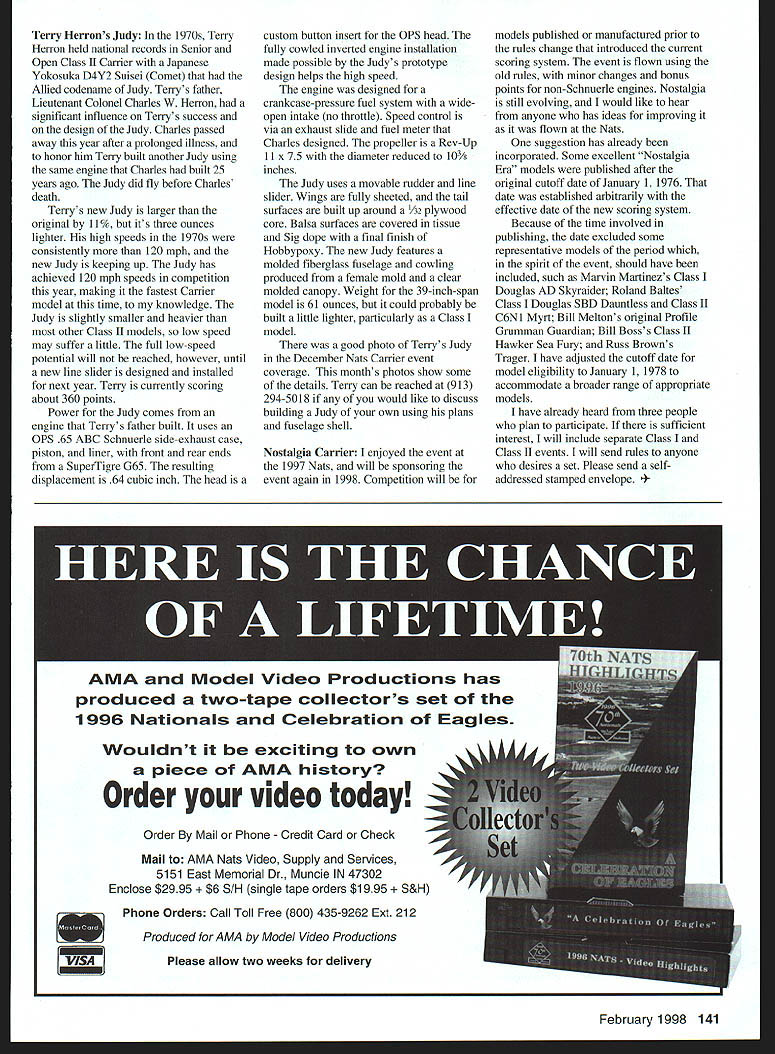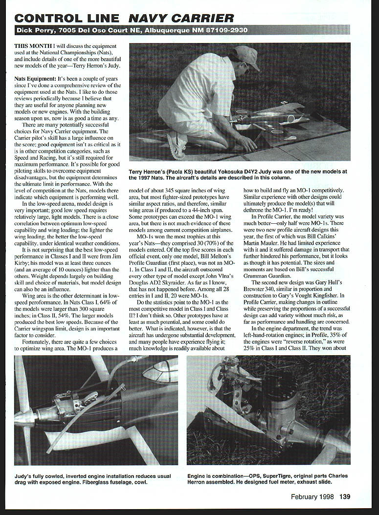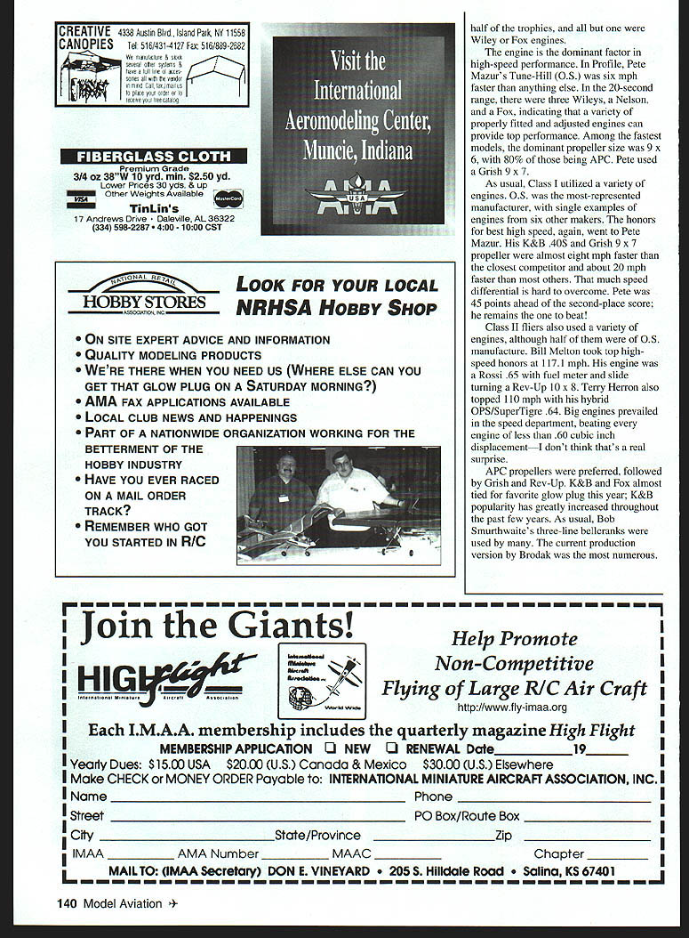 CONTROL LINE NAVY CARRIER Eli rI MLliEi.U liz-I KWkISRWI IdU 1*1 4 MONTH will discuss equipment used National Championships Nats include details beautiful new models yearTeny Herrons Judy Nats Equipment Its couple years since Ive done comprehensive review equipment used Nats like reviews periodically because believe useful anyone planning new models new engines building season upon us now good time potentialty successful choices Navy Carrier equipment Carrier pilots skill has large influence score good equipment isnt critical other competition categories such Speed Racing its still required maximum performance Ifs possible good piloting skills overcome equipment disadvantages equipment determines ultimate limit performance level competition Nats models indicate equipment performing well low-speed arena model design very important good low speed requires relatively large light models close correlation between optimum low-speed capability wing loading lighter wing loading better low-speed capability under identical weather conditions surprising best low-speed performance Classes II Jim Kirby model least three ounces average 10 ounces lighter others Weight depends largely building skill choice materials model design can also influence Wing area other determinant lowspeed peroformance Nats Class 64% models larger 300 square inches Class II 54% larger models produced best low speeds Because Carrier wingspan limit design important factor consider Fortunately quite few choices optimize wing area MO-I produces model about 345 square inches wing area fighter-sized prototypes have similar aspect ratios therefore similar wing areas produced 44-inch span Some prototypes can exceed MO- 1 wing area much evidence models among current competition airplanes MO-is won trophies years Natsthey comprised 3070% models entered top five scores official event model Bill Meltons Profile Guardian first place MO 1 Class II aircraft outscored other type model except John Vlna s Douglas AD2 Skyralder As far know has happened before Among 28 entries inland II 20 MO-ls statistics point MO-l competitive model Class Class II dont think Other prototypes have least much potential some could better What indicated however aircraft has undergone substantial development people have experience flying much knowledge readily available about build fly MO-l competitively Similar experience other designs could ultimately produce models will dethrone MO-i Im ready Profile Carrier model variety much betteronly half MO-is two new profile aircraft designs year first Bill Calkins Martin Mauler limited experience it suffered damage transport further hindered performance looks though has potential sizes moments based Bills successful Grumman Guardian second new design Gary Hulls Brewster 340 similar proportion construction Garys Vought Kingfisher Profile Carrier making changes outline preserving proportions successful design can add variety much risk far performance handling concerned engine department trend left-hand-rotation engines Profile 35% engines reverse rotation 25% Class Class II won about February 1998 139 Terry Herrons Paola KS beautiful Vokosuka D4V2 Judy new models 1997 Nats aircrafts details described column Judys fully cowled inverted engine installation reduces usualEngine combinationOPS Superigre original parts Charles drag exposed engine Fiberglass fuselage cowlHerron assembled designed fuel meter exhaust slide {e1 W14fe ium Grade 3/4 oz 38W 10 yrd mm $250 yd Lower Prices 30 yds & up Other ghts Ava able TinLmns 17 Andrews Drive Da ev e AL 36322 334 598-2287 10 00 CST ONALA HOBBY SIORES ASSOCIATiON INC NRHSA HOBBY SHOP ON SITE EXPERT ADVICE AND INFORMATION QUALITY MODELING PRODUCTS WERE THERE WHEN YOU NEED US WHERE ELSE CAN YOU GET THAT GLOW PLUG ON SATURDAY MORNING AMA FAX APPLICATIONS AVAILABLE LOCAL CLUB NEWS AND HAPPENINGS PART OF NATIONWIDE ORGANIZATION WORKING FOR THE BETTERMENT OF THE HOBBY INDUSTRY HAVE YOU EVER RACED ON MAIL ORDER TRACK REMEMBER WHO GOT YOU STARTED IN RIC half trophies Wiley Fox engines engine dominant factor high-speed performance Profile Pete Mazurs Tune-Hill OS six mph faster anything else 20-second range three Wileys Nelson Fox indicating variety properly fitted adjusted engines can provide top performance Among fastest models dominant propeller size 9 x 6 80% being APC Pete used Grish 9 x 7 As usual Class utilized variety engines OS most-represented manufacturer single examples engines six other makers honors best high speed again went Pete Mazur K&B 405 Grish 9 x 7 propeller almost eight mph faster closest competitor about 20 mph faster others much speed differential hard overcome Pete 45 points ahead second-place score remains beat Class II fliers also used variety engines although half 05 manufacture Bill Melton took top highspeed honors 1171 mph engine Rossi 65 fuel meter slide turning Rev-Up 10 x 8 Terry Herron also topped 110 mph hybrid OPS/SuperTigre 64 Big engines prevailed speed department beating engine less 60 cubic inch displacementI dont think thats real surprise APC propellers preferred followed Grish Rev-Up K&B Fox almost tied favorite glow plug year K&B popularity has greatly increased throughout past few years As usual Bob Smurthwaites three-line belleranks used current production version Brodak numerous -I Join theGiants Help PromoteI IHIG - NNon-CompetitiveI lt ASOCI tp//wwwfly-imaaorgI IMAA membership includes thequarterly magazine High FlightI MEMBERSHIP APPLICAllON NEW l RENEWAL Date19I Yearly Dues$1500 USA S200O US Canada & Mexico $3000 US ElsewhereI Make CHECK MONEY ORDER Payable INTERNATiONAL MINIATURE AIRCRAFT ASSOCIATION INC I Name ______________________________________ Phone _________________________ I Street ___________________________________________ P0 Box/Route Box __________________ City _______________________State/Province ________________Zip_________________ I IMAA _______ AMA Number_______ MAAC ________ Chapter_______ L MAIL TO IMAA Secretary DONE VINEYAR