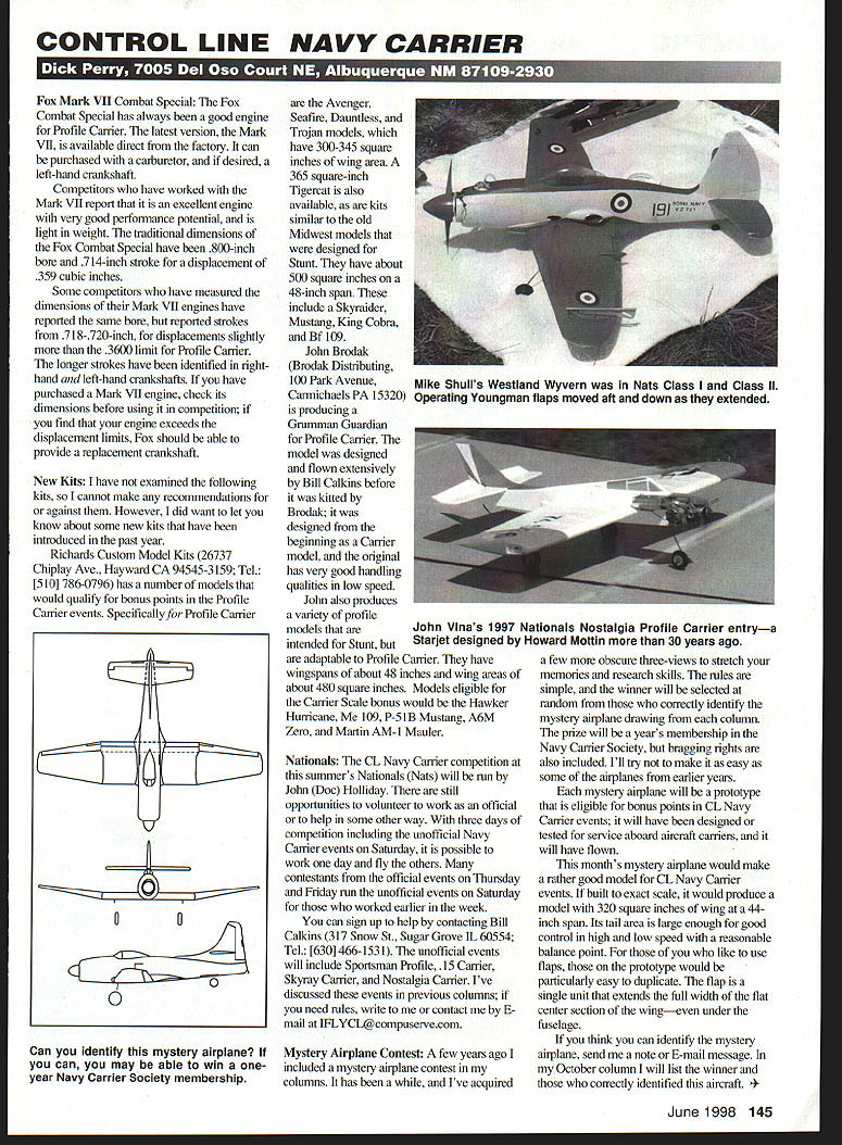 CONTROL LINE NAVY CARRIER Fox Mark VII Combat Special Fox Combat Special has always good engine Profile Carrier latest version Mark VII available direct factory can purchased carburetor desired left-hand crankshaft Competitors have worked Mark VII report excellent engine very good performance potential light weight traditional dimensions Fox Combat Special have 800-inch bore 714-inch stroke displacement 359 cubic inches Some competitors have measured dimensions Mark VII engines have reported same bore reported strokes 718-720-inch displacements slightly 3600 limit Profile Camer longer strokes have identified righthand left-hand crankshafts have purchased Mark VII engine check its dimensions before using competition find engine exceeds displacement limits Fox should able provide replacement crankshaft New Kits have examined following kits cannot make recommendations against However did want let know about some new kits have introduced past year Richards Custom Model Kits 26737 Chiplay Ave Hayward CA 94545-3 159 Tel [510] 786-0796 has number models would qualify bonus points Profile Carrier events Specificallyfor Profile Carrier Can identify mystery airplane can may able win oneyear Navy Carrier Society membership Avenger Seafire Dauntless Trojan models have 300-345 square inches wing area 365 square-inch Tigercat also available kits similar old Midwest models designed Stunt have about 500 square inches 48-inch span include Skyraider Mustang King Cobra andBf 109 John Brodak Brodak Distributing 100 Park Avenue Carmichaels PA 15320 producing Grumman Guardian Profile Carrier model designed flown extensively Bill Calkins before killed Brodakit designed beginning Carrier model original has very good handling qualities low speed John also produces variety profile models intended Stunt adaptable Profile Carrier have wingspans about 48 inches wing areas about 480 square inches Models eligible Carrier Scale bonus would Hawker Hurricane 109 P-S lB Mustang A6M Zero Martin AM-I Mauler Nationals CL Navy Carrier competition summers Nationals Nats will run John Doc Holliday still opportunities volunteer work official help some other way three days competition including unofficial Navy Carrier events Saturday possible work day fly others contestants official events Thursday Friday run unofficial events Saturday worked earlier week can sign up help contacting Bill Calkins 317 Snow St Sugar Grove IL 60554 Tel [630] 466-1531 unofficial events will include Sportsman Profile 15 Carrier Skyray Carrier Nostalgia Carrier Ive discussed events previous columns need rules write contact E mail IFLYCL@compuservecom Mystery Airplane Contest few years ago included mystery airplane contest columns has Ive acquired few obscure three-views stretch memories research skills rules simple winner will selected random correctly identify mystery airplane drawing column prize will years membership Navy Carrier Society bragging rights also included Ill try make easy some airplanes earlier years mystery airplane will prototype eligible bonus points CL Navy Carrier events will have designed tested service aboard aircraft carriers will have flown months mystery airplane would make rather good model CL Navy Carrier events built exact scale would produce model 320 square inches wing 44inch span Its tail area large enough good control high low speed reasonable balance point like use flaps prototype would particularly easy duplicate flap single unit extends full width flat center section wingeven under fuselage think can identify mystery airplane send note E-mail message October column will list winner correctly identified aircraft 1998 145 Mike Shulls Westland Wyvern Nats Class Class II Operating Youngman flaps moved aft down extended John VInas 1997 Nationals Nostalgia Profile Carrier entrya Starlet designed Howard Mottin 30 years ago 0 B0 0 0