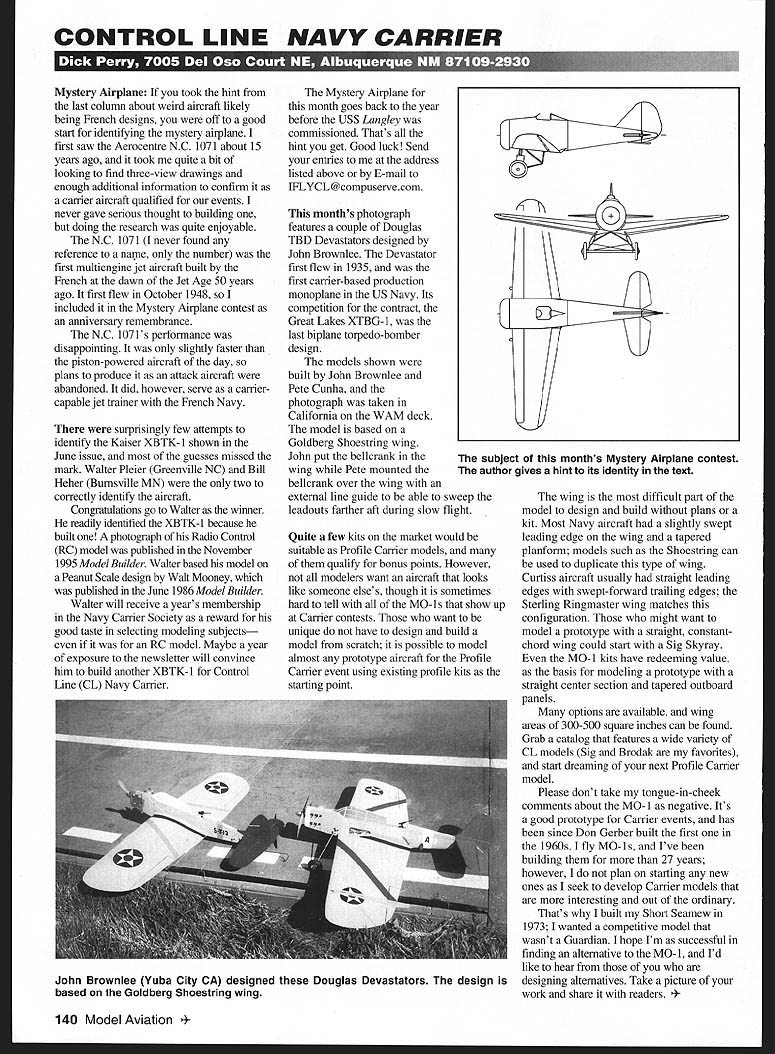 CONTROL LINE NAVY CARRIER Mystery Airplane took hint last column about weird aircraft likely being French designs off good start identifying mystery airplane first saw Aerocentre NC 1071 about 15 years ago took quite bit looking find three-view drawings enough additional information confirm carrier aircraft qualified events never gave serious thought building doing research quite enjoyable NC 1071 never found reference name number first multiengine jet aircraft built French dawn Jet Age 50 years ago first flew October 1948 sol included Mystery Airplane contest anniversary remembrance NC 107 ls performance disappointing slightly faster piston-powered aircraft day plans produce attack aircraft abandoned did however serve carriercapable jet trainer French Navy surprisingly few attempts identify Kaiser XBTK- 1 shown June issue guesses missed mark Walter Pleier Greenville NC Bill Heher Bumsville MN two correctly identify aircraft Congratulations go Walter winner readily identified XBTK-l because built photograph Radio Control RC model published November 1995 Model Builder Walter based model Peanut Scale design Walt Mooney published June 1986 Model Builder Walter will receive years membership Navy Carrier Society reward good taste selecting modeling subjects RC model Maybe year exposure newsletter will convince him build another XBTK-1 Control Line CL Navy Carrier Mystery Airplane month goes back year before USS Lan glev commissioned Thats hint get Good luck Send entries address listed above E-mail IFLYCL @compuservecom months photograph features couple Douglas TBD Devastators designed John Brownlee Devastator first flew 1935 first carrier-based production monoplane US Navy Its competition contract Great Lakes XTBG- last biplane torpedo-bomber design models shown built John Brownlee Pete Cunha photograph taken California WAM deck model based Goldberg Shoestring wing John put bellcrank wing Pete mounted bellcrank over wing external line guide able sweep leadouts farther aft during slow flight Quite few kits market would suitable Profile Carrier models qualify bonus points However modelers want aircraft looks like someone elses though sometimes hard tell MO-is show up Carrier contests want unique have design build model scratch possible model almost prototype aircraft Profile Carrier event using existing profile kits starting point subject months Mystery Airplane contest author gives hint its identity text wing difficult part model design build plans kit Most Navy aircraft slightly swept leading edge wing tapered planform models such Shoestring can used duplicate type wing Curtiss aircraft usually straight leading edges swept-forward trailing edges Sterling Ringmaster wing matches configuration might want model prototype straight constantchord wing could start Sig Skyray MO- 1 kits have redeeming value basis modeling prototype straight center section tapered outboard panels options available wing areas 300-500 square inches can found Grab catalog features wide variety CL models Sig Brodak favorites start dreaming next Profile Carrier model Please dont take tongue-in-cheek comments about MO-i negative Its good prototype Carrier events has since Don Gerber built first 1960s fly MO-is Ive building 27 years however plan starting new ones seek develop Carrier models interesting out ordinary Thats built Short Seamew 1973 wanted competitive model wasnt Guardian hope Im successful finding alternative MO-i Id like hear designing alternatives Take picture work share readers Model Aviation hn Brownlee Vuba City CA designed Douglas Devastators design based Goldberg Shoestring wing