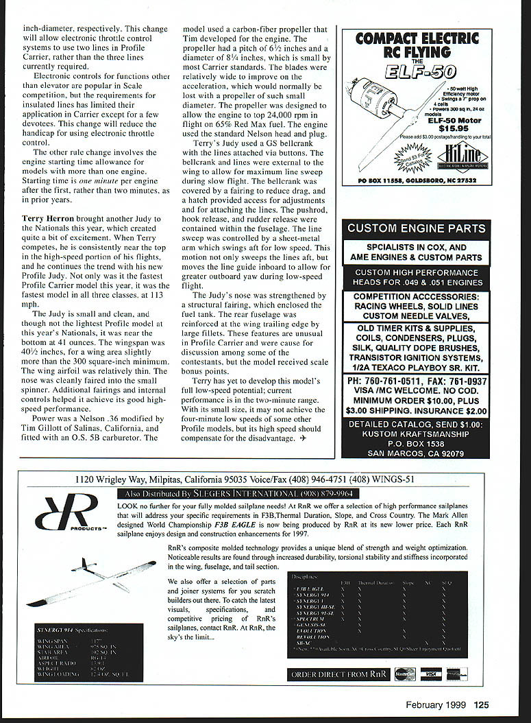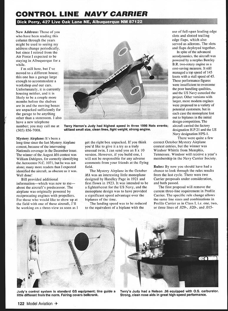 CONTROL LINE NAVY CARRIER E 1 [1 U -fm -ILNew Address have reading column through years might used seeing address change periodically since retired Air Force expected staying Albuquerque Im still Ive moved different house has garage large enough accommodate workshop cars Unfortunately currently housing neither likely couple months before shelves moving boxes unpacked sufficiently garage anything other storeroom also have new telephone number may call 505 856-7008 Mystery Airplane Its long time since last Mystery Airplane contest because intervening Nationals coverage December issue winner August MA contest William Dahlgren correctly identifying Aerocentre NC 1071 alone readers expected identified aircraft obscure Well done Bill provided additional informationwhich new about aircrafts predecessor airplane originally powered reciprocating engines propellers would like show up field aircraft Ill working three-view soon get right box unpacked think youd like give try truly unusual twin can send 8 x 10 version However build will responsible adverse comments friends flying field Mystery Airplane October MA interesting little monoplane designed Handley Page 1921 first flown 1923 intended fighter/scout US Navy monoplane design have provided significant speed advantage over biplanes time landing speed reduced equivalent biplane N use full-span leading edge slots slotted trailing edge flaps also served ailerons slots flaps deployed together spite advanced aerodynamics aircraft powered surplus Bentley BR two-rotary engine cost-saving measure still managed top speed 145 knots stall speed 45 performance figures insufficient overcome poor handling qualities US Navy canceled project Other versions larger modem engines proposed variety potential customers case monoplane lost out biplanes initial design competition aircraft carried factory designation HP21 US Navy designation HPS- 1 quite few correct October Mystery Airplane contest entries winner Windsor Whittle Memphis Tennessee Windsor will receive years membership Navy Carrier Society Rules now should have bad chance look through rules results last cycle two Carrier proposals under consideration both passed first proposal will remove current three-line requirement Profile Carrier specific rule change allows same line sizes combinations Profile Carrier Class ie two three lines 029- 020- 015122 Model Aviation y Herrons Judy highest speed three 1998 Nats events utilized small size clean lines light weight strong engine ra Judys control system standard GS equipment line guide little different norm Fairing covers bellcrank Terrys Judy Nelson 36 equipped 05 carburetor Strong clean nose aids great high-speed performance inch-diameter respectively change will allow electronic throttle control systems use two lines Profile Carrier rather three lines currently required Electronic controls functions other elevator popular Scale competition requirements insulated lines has limited application Carrier except few devotees change will reduce handicap using electronic throttle control other rule change involves engine starting time allowance models engine Starting time minute per engine after first rather two minutes prior years Terry Herron brought another Judy Nationals year created quite bit excitement Terry competes consistently near top high-speed portion flights continues trend new Profile Judy fastest Profile Carrier model year fastest model three classes 113 mph Judy small clean though lightest Profile model years Nationals near bottom 41 ounces wingspan 40/2 inches wing area slightly 300 square-inch minimum wing airfoil relatively thin nose cleanly faired small spinner Additional fairings internal controls helped achieve its good highspeed performance Power Nelson 36 modified Tim Gillott Salinas California fitted OS 5B carburetor model used carbon-fiber propeller Tim developed engine propeller pitch 6/2 inches diameter 8/4 inches small Carrier standards blades relatively wide improve acceleration would normally lost propeller such small diameter propeller designed allow engine top 24000 rpm flight 65% Red Max fuel engine used standard Nelson head plug Terrys Judy used CS bellerank lines attached via buttons bellerank lines external wing allow maximum line sweep during slow flight bellerank covered fairing reduce drag hatch provided access adjustments attaching lines pushrod hook release rudder release contained within fuselage line sweep controlled sheet-metal arm swings aft low speed motion sweeps lines aft moves line guide inboard allow greater outboard yaw during low-speed flight Judys nose strengthened structural fairing enclosed fuel tank rear fuselage reinforced wing trailing edge large fillets features unusual Profile Carrier cause discussion among some contestants model received scale bonus points Terry has yet develop models full low-speed potential current performance two-minute range its small size may achieve four-minute low speeds some other Profile models its high speed should compensate disadvantage ALISTS IN COX AND AME ENGINES & CUSTOM PARTS COMPETITION ACCCESSORIES RACING WHEELS SOLID LINES CUSTOM NEEDLE VALVES OLD TIMER KITS & SUPPLIES COILS CONDENSERS PLUGS SILK QUALITY DOPE BRUSHES TRANSISTOR IGNITION SYSTEMS 112A TEXACO PLAYBOY SR KIT PH 760-761-0511 FAX 761-0937 VISA /MC WELCOME NO COD MINIMUM ORDER $1000 PLUS 3flfl HIPPINC INIiRANC 1120 Wrigley Way Milpitas California 95035 Voice/Fax 408 946-4751 408 WINGS-S 1 LOOK no further fully molded sailplane needs RnR offer selection high performance sailpianes will address specific requirements F3BThermal Duration Slope Cross Country Mark Allen designed World Championship F3B EAGLE now being produced RnR its new lower price RnR sailplane enjoys design construction enhancements 1997 RnRs composite molded technology provides unique blend strength weight optimization Noticeable results found through increased durability torsional stability stiffness incorporated wing fuselage tail section also o