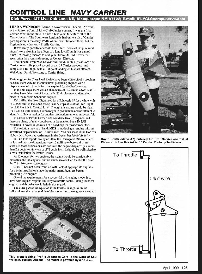 CONTROL LINE NAVY CARRIER S.-tU WONDERFUL time November Phoenix Arizona Arizona Control Line Club Carrier contest first Carrier event state quite few years feature Carrier events Southwest Regionals quite bit Carrier participation early 1970s stationed Regionals now has Profile Carrier really good renew old friendships Some pilots aircraft showing effects long layoff good time Im looking forward next year Thanks Ted Kraver sponsoring event serving Contest Director Phoenix event 12-year-old David Smiths Mesa AZ first Carrier contest placed second 15 Carrier category completed full flight 100-point landing first attempt Well done David Welcome Camer flying Twin engines Class Profile have little bit problem because no manufacturers producing engines displacement 18 cubic inch required Profile event old days abundance 19s suitable Class have fallen out favor 21 displacement taking place modem Schnuerle engines K&B filled Free Flight need Schnuerle19 its 325cc built 35cc case Class stops 200 Free Flight 1525 Control Line Though engine would ideal Class installation no longer production attempt identify sufficient market another production run unsuccessful Class Profile Can-ier could use two 15 engines plenty really good ones market 20-25% reduction power too much handicap competitors solution may hand MDS producing engine advertised displacement 18 cubic inch can see Horizon Hobby Distributors advertisement December Model Aviation Bill Calkins reports seeing 18 Chicago RC Show learned dimensions 16 millimeter bore 14mm stroke dimensions accurate engine displaces just 28 cubic centimeters 172 cubic inch should well suited twin installation Profile Carrier 15 ounces two engines weight would considerably 36 engines much heavier K&B 58s OS 36 conversion engines Class II has troubled lack appropriate engines twin installation since major manufacturers began producing 32 engines requirements successful twin-engine model have both engines respond similarly throttle control Using identical engines throttles would help regard other part equation throttle linkage bellcrank usually middle model engines spaced April 1999 125 David Smith Mesa AZ entered first Carrier contest Phoenix flew A-i 15 Carrier Photo Ted Kraver Th rot7i~ 045 wire 0 0 ThrotiD~ great-looking Profile Japanese Zero work Lou Wolgast Tucson Arizona model powered K&B 58 either side linkages can get complex usual single-engine model Most schemes Ive seen use standard throttle arm belicrank fore-and-aft movement arm changed spanwise movement 900 bellcrank fuselage direction changes again engine nacelles additional 900 belicranks number belicranks can introduce play system add complexity weight necessary possible save weight produce more-direct linkage connecting throttle pushrods directly throttle arm leadout attached standard three-line bellcrank still required throttle arm bellcrank pushrod would normally connected ignored alternative does away inboard pushrod entirely connects inboard 900 bellcrank directly throttle leadout cable continuing throttle arm line slider option less practical Scale model because effective line lengths throttle elevator would change relative another slider moves like electronic throttle control would find twin installation relatively easy Flexible cable-and-sleeve pushrods less practical conventional throttle control twins because extra resistance introduce two pushrods required servtr driving throttles friction linkage much less consideration flexible pushrods would simplify linkage considerably eliminating bellcranks used change directions control movement key successful installation flexible pushrods ensuring both ends outer sleeve securely attached aircraft structure ends sleeve can move result similar having spring part otherwise rigid pushrod National Air Space Museum Web site great place visit QT Sightings section offers movie clips historical interest offerings December written included two clips takeoff landing C-130 carrier trials USS Saratoga Its interesting viewing say least no arresting gear used C-130 cant really considered prototype events C-130 used anti-skid reverse thrust stop home page http//wwwairspacemag com Navy Carrier events Nationals Nats will flown July 15-17 Profile Carrier begins activities Thursday July 15 Class land Class II Friday Saturday July 17 will reserved unofficial Carrier events would like participate official help other way running Carrier events please contact Navy Carrier Society president Bill Calkins 630 4661531 write him 317 Snow St Sugar Grove IL 60554 Nostalgia Navy Carrier has flown unofficial event Nats last two years summer effort increase participation Ive changed rules require designs existed prior 1978 Within limitations cited rules such fixed leadout position flight model may used bonus will used encourage Nostalgia-era models special award memory Roland Baltes will presented model modeler best representing spirit event Nostalgia event flown using scoring system existed prior rule change January 1976 interested competing please let know sufficient interest Ill include separate Class Class II events addition Profile will other unofficial events flown Saturday July 17 addition Nostalgia Carrier Navy Carrier Society will sponsor Sportsman Profile Carrier modelers did enter official Carrier events As past Skyray Carrier 15 Carrier can also expected will provide rules unofficial event anyone asks erobaticslMcMillan Continued page 124 stage because now fuselage stabilized flat reference surface measurements will identical Consider making references permanent wont sanded off finishing process Should have mishap future could very handy have reference marks available instance pancaked alrplane damaged wing cut out bottom fuselage installed new wing replaced bottom cutout refinished affected area Its time first trial fitthere will probably Position wing center planform fuselage centerline See trailing edge perpendicular reference line tip tip Have checked trailing ed
