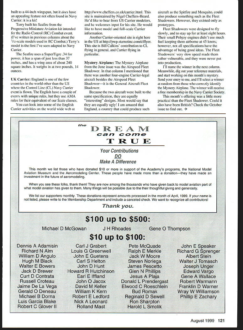 CONTROL LINE NAVY CARRIER mu] r u i- S MONTHS COLUMN has distinctly English tone photos mystery airplane Web site model descriptionsbut dont misled thinking everything will British good number models 1998 Nationals patterned after British Royal Navy prototypes Among Fairey Barracuda Gany Andrews Brewster 340 Gary Hull Grumman Wildcats Terry Kirby Dave Rolley Jr Royal Navy flew during World War II Leon Ryktarsyk brought out Barracuda Sea Hornet did enter competition hope well see fly year months photos two other models based British designs Bill Calkins Class Hawker Sea Fury original design Bills model spans somewhat less 44-inch limit weighs two pounds 14 ounces K&B 405 engine Sea Fury last piston-engined fighter Fleet Air Arms first-line units first flew prototype end World War II its performance excellent Bristol Centaurus engine produced just less 2500 horsepower large factor Sea Fury still does rather well air-racing circuit its broad clipped-ellipse wings among loweraspect-ratio propeller fighters means can have relatively large wing area model built Navy Carrier event built exact scale span 44 inches will have wing area 368 square inches MO-l built scale has wing area 345 square inches larger wing area advantage slow flight long weight can kept under control Sea Furys engine makes rather large fuselage cross section large spinner sleek lines size factor need detriment high speed cowl would large enough approximately 53/4 inches diameter nearly conceal 60 65 engine Bills smaller model does good job hiding K&B Larger fuselages dont necessarily mean heavy fuselages long appropriate construction methods used Because larger crosssection can carry same load much thinner materials possible keep weight under control judicious design Curved surfaces particularly well-suited thin materials because arched surface much less prone deformation flat surfaces model such MO-I Ive built six-inch-diameter fuselage four /s 1/2. inch balsa longerons very narrow ring formers Mystery Aircraft Its identity will revealed October column lightweight plywood main loads carried /64-inch fuselage skin covering /2-ounce glass cloth rigid fuselages Ive builtmuch stiffer MO-i models Seafire naval version venerable Spitfire its clipped-wing variants designed operations lower altitudes Seafire lowest aspect ratio aircraft eligible bonus points Navy Carrier will produce model 420 square inches built full 44-inch span other model shown Supermarine Seafire Mk XV built Terry Kirby Class isnt clipped-wing variant isnt 120 Model Aviation ii Bill Calkins Sugar Grove IL competed 1998 Nats Class Class Supermarine Seafire Mk XV started out kit original-design Hawker Sea Fury K&S 40S engine Radio Control Combat Its work Terry Kirby built 44-inch wingspan does have appealing feature often found Navy Carrier kit Terry built Seafire Progressive Miniature Aviation kit intended Radio Control RC Combat event Ive written previous columns about /12-scale models used RC Combat Terrys model first Ive seen adapted Navy Carrier Seafire uses SuperTigre 34 power has span just less 37 inches has wing area about 240 square inches weighs two pounds 14 ounces UK Carrier England few countries world other US Control Line CL Navy Carrier event flown English have couple evenis unique rules use AMA rules equivalent Scale classes can look some English Carrier activities world wide web http//wwwchefferscouk/carrierhtml site maintained Nigel Cheffers-Heard Hed like hear US Carrier modelers welcomes input site would like have model full-scale Carrier information Another Carrier-oriented site right US http//pwpstametinccomlclflyer site Bill Calkins contribution CL flying general Carrier flying particular Mystery Airplane Mystery Airplane June issue Airspeed Fleet Shadower column mentioned another four-engine Carrier-legal aircraft besides Airspeed Fleet Shadowerit General Aircraft Fleet Shadower Because two aircraft built same specification equally interesting designs Most would say equally ugly am amazed England country could produce such aircraft Spitfire Mosquito could also produce something such Fleet Shadowers However existed prototypes Fleet Shadowers designed fly slowly stay up least eight hours small Pobjoy engines didnt use much fuel keeping airborne 45 knots however specifications have advantage being good ideas Fleet Shadowers very slow speed made rather vulnerable never put production Ill name winner next column Meanwhile dig out reference materials start working months mystery Send entry Ill select winner random correctly identify Mystery Airplane winner will receive free membership Navy Carrier Society months offering little practical Fleet Shadower Could also have British Check October issue find out st 1999 121 17 LtIJE Contributions tIw D R E NI - DO Make Difference month list have donated $10 support Academys programs National Model Aviation Museum Aeromodeling Center people have made donationthey have made investment future aeromodeling see folks thank now among thousands have given back model aviation part what model aviation has given things will possible due thoughtful giving generosity list supporters monthly donations represent amounts processed month April 1999 name listed please write Membership Department include canceled check want recognize contributors Thank n