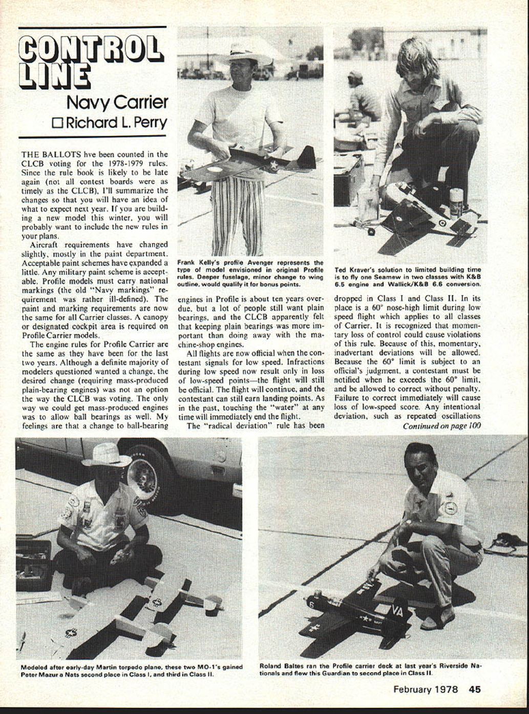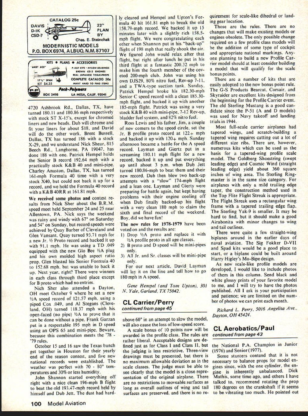 Navy Carrier LI Richard 1 Perry THE BALLOTS hve counted CLCB voting 1978-1979 rules Since rule book likely late again contest boards timely CLCB Ill summarize changes will have idea what expect next year build ing new model winter will probably want include new rules plans Aircraft requirements have changed slightly mostly paint department Acceptable paint schemes have expanded little Any military paint scheme accept able Profile models must carry national markings old Navy markings re quirement rather ill-defined paint marking requirements now same Carrier classes canopy designated cockpit area required Profile Carrier models engine rules Profile Carrier same have last two years Although definite majority modelers questioned wanted change desired change requiring mass-produced plain-bearing engines option way CLCB voting way could get mass-produced engines allow ball bearings well feelings change ball-bearing engines Profile about ten years over due lot people still want plain bearings CLCB apparently felt keeping plain bearings im portant doing away ma chine-shop engines flights now official con testant signals low speed Infractions during low speed now result loss low-speed pointsthe flight will still official flight will continue contestant can still earn landing points As past touching water time will immediately end flight radical deviation rule has dropped Class Class II its place 600 nose-high limit during low speed flight applies classes Carrier recognized momen tary loss control could cause violations rule Because momentary inadvertant deviations will allowed Because 600 limit subject officials judgment contestant must notified exceeds 600 limit allowed correct penalty Failure correct immediately will cause loss low-speed score Any intentional deviation such repeated oscillations Continued page 100 February 1978 45 Frank Kellys profile Avenger represents type model envisioned original Profile Ted Kravers solution limited building time rules Deeper fuselage minor change wing fly Seamew two classes K&B outline would qualify bonus points 65 engine Wallick/K&B 66 conversion Modeled after early-day Martin torpedo plane two MO-is gained Peter Mazur Nats second place Class third Class II Roland Baltes ran Profile carrier deck last years Riverside Na tionals flew Guardian second place Class II CATALOG 25c DAVIS 22 D-IKPLAN 1 CSD-7BY Chas E Steinchak MODERNISTIC MODELS PO B0X6974ALBUQNM87107, KITS S 0 ACCESSORIES BABY ACEP-N UT KITS N BEARINGS BROWN CO-2 ENGINES RE AL JAPANESE TISSUE-PROPS I17 SPAN 4COMPLETE CATALOG 50q IKIT $425MANY HARD TO FIND ITEMS Pee*-haw BOX 2493LA MESA CALIF 92041 4720 Ashbrook Rd Dallas TX have turned 18011 18086 mph respectively stock ST X-15s except chromed liners new heads Dub will chrome fit liners about $18 David will other work Brent Bussell Dallas TX has turned 186 stock X-29 understand Nick Shear 815 Beech Rd Langhorne PA 19047 has done 188 Patrick Hempel holds Senior B record 19264 mph practically stock K&B 40 mini-pipe Charley Anaston Dallas TX has turned 161-mph Formula 40 time very stock X40 could back up record hold Formula 40 record aK&B4ORRat 16181 mph received some photos contest re sults Nick Sher about BRM speed meet held September 24 25 near Allentown PA Nick says weekend rainy windy 670 Saturday 540 Sunday record speeds achieved Quay Barber Cleveland Glen Vansant Quay turned 9371 mph new Jr o record backed up 911 mph using TD 049 equipped new Gb Bee plug own molded high aspect ratio prop Glen blasted Senior Formula 40 15268 mph unable back up Next year right winners class through third place except B proto no entries Nich Sher also attended Dayton OH meet October 9 set new speed record 12157 mph using piped Cox 049 Al Stegans Cleve land OH turned 11837 mph open-faced no pipe prove can done pipe Frank Garzan put respectable 195 mph D speed using OPS 65 mini-pipe Beware because combination meets 78 79 rules October 15 16 saw Texas bunch get together Houston yearly end season contest five new national records established weather perfect 70 800 tem peratures 30% less humidity John Shannon started everything off right nice clean 196-mph B flight beat old 19347-mph record held himself Dub Jett dust hardly cleared Hempel Uptons mula 40 hit 16181 mph break old 15879-mph record backed up 15 minutes later slightly rich 1585mph flight congratulating other Shannon put back-up flight 198 mph really shook air figured John would relax after flight right after lunch put third flight fantastic 20032 mph make him fourth member cov eted 200-mph club John using own DJ529 80% nitro fuel Rev-up 7-11 TWA-type suction tank Sunday Patrick Hempel broke 18230-mph Senior C speed record clean 18530mph flight backed up another 185-mph flight Patrick using very stock K&B40 mini-pipe 7-12 Rev-up bladder fuel system 82% nitro fuel Ross Lewis father Jim couple new comers speed circle set Jr B profile proto record 122 mph backed up 120 mph Sunday afternoon became battle speed record Layman Giertz put screaming 18011 mph flight new record backed up put everything up until about 3 pm Dub Jett turned 18086-mph beat new record Dub blew two back-up attempts slow 174-mph flight lean Layman Gierty preparing battle again kept having problems engine cooling off Dub finally backed-up flight very clean 180 mph claim sixth final record weekend Boy did have fun new rules 1978-1979 have voted results I Drop proto replace profile proto age classes 2 B proto D speed will mini-pipes 3 All Jr Sr classes will mini-pipe next article David Layman will lay line tell go 180 mph speed Gene Hem pel Tom Upton 301 N Yale Garland TX 75042 CL Carrier/Perry continued page 45 above 600 attempt slow model will also cause loss low-speed score scale bonus 10 points now will awarded profile class rules rather liberal Acceptable designs de fined just Class Class II judging less restrictive Three-view drawings must presented no maximum allowable deviation scale classes judge must able see clearly model close rep