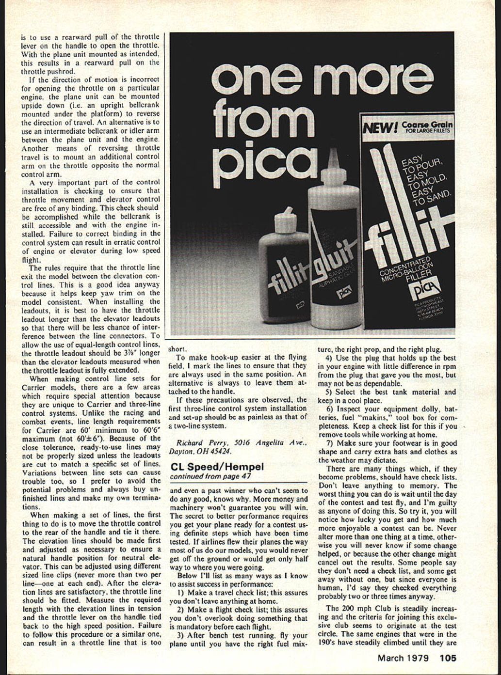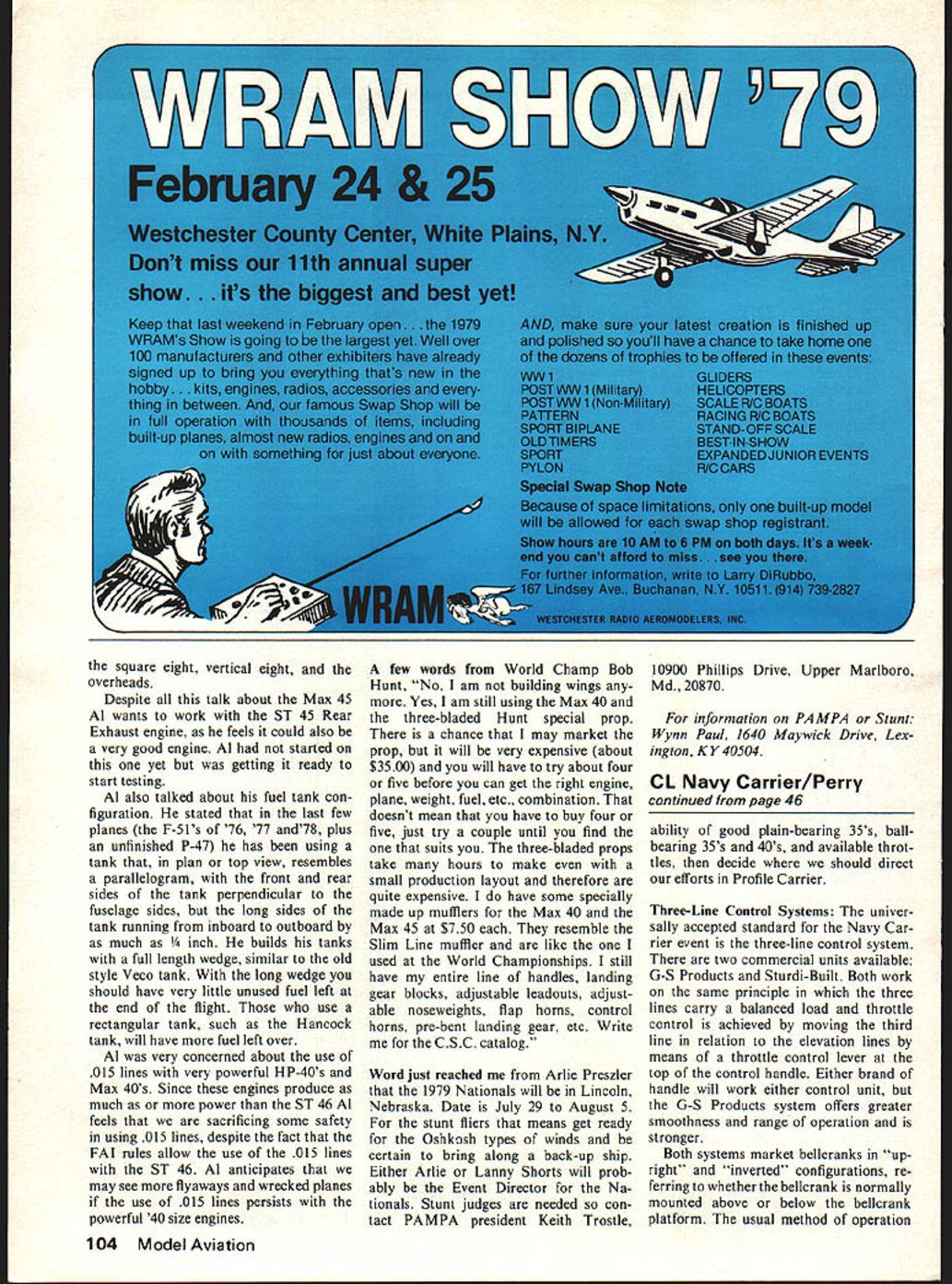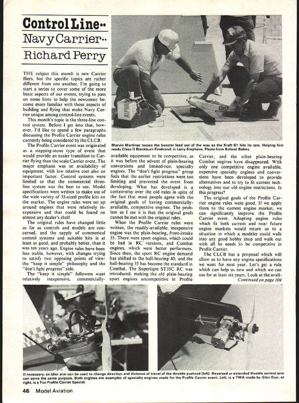 Control Line. Navy Carrier Richard Perry THE subject month new Carrier fliers specific topics rather different another Im going start series cover some basic aspects events trying pass some hints help newcomer come familiar aspects building flying make Navy Car rier unique among control-line events months topic three-line con trol system Before get ever Id like spend few paragraphs discussing Profile Carrier engine rules currently being considered CLCB Profile Carrier event originated stepping-stone type event would provide easier transition Car rier flying scale Carrier event major emphasis availability equipment low relative cost also Important factor Control systems limited commercial threeline system best use Model specifications written make use wide variety 35-sized profile kits market engine rules set up around engines relatively expensive could found almost dealers shelf original rules have changed little far controls models con cerned supply commerical control systems suitable kits least good probably better ten years ago Engine rules have less stable however changes trying satisfy two opposing points view keep simple philosophy dont fight progress side keep simple followers want relatively inexpensive commerciallyavailable equipment competitive before advent plain-bearing conversions limited-run specialty engines dont fight progress group feels earlier restrictions too limiting prevented event developing What has developed controversy over old rules spite fact people agree original goals having commerciallyavailable competitive engines prob lem see original goals cannot met original rules Profile Carrier rules written readily-available inexpensive engine plain-bearing front-intake 35 sport engines could RC versions Combat engines better performers Since sport RC engine demand has shifted ball-bearing 40 ball-bearing 35 has become standard Combat Supertigre ST35C RC introduced making old plain-bearing sport engines uncompetitive Profile Carrier other plain-bearing Combat engines have disappeared competitive engine available expensive specialty engines conver sions have developed provide alternatives try fit current tech nology old engine restrictions progress original goals Profile Car rier engine rules good apply current engine market can significantly improve Profile Carrier event Adopting engine rules fit both current near future engine markets would return us situation modeler could walk good hobby shop walk out needs competitive Profile Carrier CLCB has proposal will allow us have engine specifications want next year Lets get rule can help us now can use least six years Look availContinued page 104 46 Model Aviation Marvin Martinez tosses booster lead out way Kraft 61 hits its rpm Helping him ready Class II Blackburn Firebrand Larry Stephens Photo Roland Baltes necessary idler arm can used change direction distance travel throttle pushrod Iletti Heversed extenaea InrotTle conroi arm can serve same purpose Both engines examples specialty engines made Profile Carrier event Left TWA made Glen Dye right Fox Profile Carrier Special square eight vertical eight overheads Despite talk about Max 45 Al wants work ST 45 Rear Exhaust engine feels could also very good engine Al started yet getting ready start testing Al also talked about fuel tank con figuration stated last few planes F-S ls 76 77 and78 plus unfinished P-47 has using tank plan top view resembles parallelogram front rear sides tank perpendicular fuselage sides long sides tank running inboard outboard much builds tanks full length wedge similar old style Veco tank long wedge should have very little unused fuel left end flight use rectangular tank such Hancock tank will have fuel left over Al very concerned about use 015 lines very powerful HP-40s Max 40s Since engines produce much power ST 46 Al feels sacrificing some safety using 015 lines despite fact FAT rules allow use 015 lines ST 46 Al anticipates may see flyaways wrecked planes use 015 lines persists powerful 40 size engines few words World Champ Bob Hunt No am building wings Yes am still using Max 40 three-bladed Hunt special prop chance may market prop will very expensive about $3500 will have try about four five before can get right engine plane weight fuel etc combination doesnt mean have buy four five just try couple until find suits three-bladed props take hours make small production layout therefore quite expensive have some specially made up mufflers Max 40 Max 45 $750 resemble Slim Line muffler like used World Championships still have entire line handles landing gear blocks adjustable leadouts adjust able noseweights flap horns control horns pre-bent landing gear etc Write CSC catalog Word just reached Arlie Preszler 1979 Nationals will Lincoln Nebraska Date July 29 August 5 stunt fliers means get ready Oshkosh types winds certain bring along back-up ship Either Arlie Lanny Shorts will prob ably Event Director Na tionals Stunt judges needed con tact PAMPA president Keith Trostle ability good plain-bearing 35s ballbearing 35s 40s available throt tles decide should direct efforts Profile Carrier Three-Line Control Systems univer sally accepted standard Navy Car rier event three-line control system two commercial units available G-S Products Sturdi-Built Both work same principle three lines carry balanced load throttle control achieved moving third line relation elevation lines means throttle control lever top control handle Either brand handle will work either control unit G-S Products system offers greater smoothness range operation stronger Both systems market bellcranks up right inverted configurations re ferring whether bellcrank normally mounted above below bellcrank platform usual method operation 104 Model Aviation 10900 Phillips Drive Upper Marlboro Md 20870 information PA MPA Stunt Wynn Paul 1640 Maywick Drive Lex ington KY 40504 CL Navy Carrier/Perry continued page 46 use rearward pull throttle lever handle open throttle plane unit mounted intended