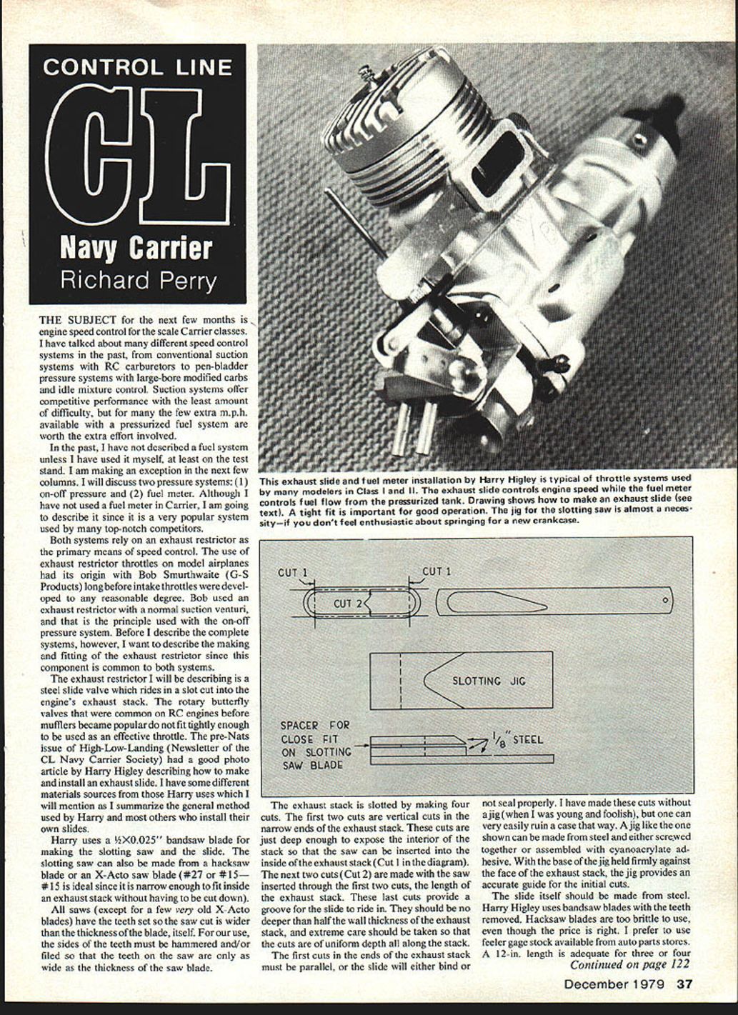 I I b THE SUBJECT next few months engine speed control scale Carrier classes have talked about different speed control systems past conventional suction systems RC carburetors pen-bladder pressure systems large-bore modified carbs idle mixture control Suction systems offer competitive performance least amount difficulty few extra mph available pressurized fuel system worth extra effort involved past have described fuel system unless have used myself least test stand am making exception next few columns will discuss two pressure systems 1 on-off pressure 2 fuel meter Although have used fuel meter Carrier am going describe since very popular system used top-notch competitors Both systems rely exhaust restrictor primary means speed control use exhaust restrictor throttles model airplanes its origin Bob Smurthwaite G-S Products long before intake throttles devel oped reasonable degree Bob used exhaust restrictor normal suction venturi principle used on-off pressure system Before describe complete systems however want describe making fitting exhaust restrictor since component common both systems exhaust restrictor will describing steel slide valve rides slot cut engines exhaust stack rotary butterfly valves common RC engines before mufflers became popular fit tightly enough used effective throttle pre-Nats issue High-Low-Landing Newsletter CL Navy Carrier Society good photo article Harry Higley describing make install exhaust slide have some different materials sources Harry uses will mention summarize general method used Harry others install own slides Harry uses X0025 bandsaw blade making slotting saw slide slotting saw can also made hacksaw blade X-Acto saw blade #27 #15 * 15 ideal since narrow enough fit inside exhaust stack having cut down saws except few very old X-Acto blades have teeth set saw cut wider thickness blade itself use sides teeth must hammered and/or filed teeth saw wide thickness saw blade ne exnaust stack siotted making four seal properly have made cuts cuts first two cuts vertical cuts aug young foolish can narrow ends exhaust stack cuts very easily ruin case way Aug like just deep enough expose interior shown can made steel either screwed stack saw can inserted together assembled cyanoacrylate adinside exhaust stackCut 1 diagram hesive base jig held firmly against next two cuts Cut 2 made saw face exhaust stack jig provides inserted through first two cuts length accurate guide initial cuts exhaust stack last cuts provide slide itself should made steel groove slide ride should no Harry Higley uses bandsaw blades teeth deeper half wall thickness exhaust removed Hacksaw blades too brittle use stack extreme care should taken though price right prefer use cuts uniform depth along stack feeler gage stock available auto parts stores first cuts ends exhaust stack 12-in length adequate three four must parallel slide will either bind Continued page 122 December1979 37 exhaust slide tuel meter installation Harry Higley typical throttle systems used modelers Class II exhaust slide controls engine speed fuel meter controls fuel flow pressurized tank Drawing shows make exhaust slide see text tight fit important good operation jig slotting saw almost neces sityif dont feel enthusiastic about springing new crankcase planform alignment Install large nylon control horn Kwik Link wire pushrod guide omit pushrod guide because aerodynamic force stab during outside maneuvers will cause pushrod bowing less effective control outside maneuvers Slow Combat version uses same wing has standard balsa fuselage standard type nose Two pushrod guides required along long fuselage plane should balance motor prop installed 185% chord 1 -in rear leading edge bladder tube placed exactly along line prevent change center gravity fuel runs out center gravity second hole top control horn good starting point Fast Combat version should weigh 8 9 oz engine FAT version 8 8 oz Select slightly lighter wood FAT version Power Fast Slow Rongeurs MK III Fox Combat Special 25% nitro head clearance set 019 Power FAT version favorite high perforniance 151 like Fox 15 Take test flight check warps thrust misalignment usually minimal care taken during construction Rongeur will provide durable cheap easy build easy repair combat plane stable enough fly eyes-off yet tight turning enough competition hundreds others too numerous mention Joes impressive model faithfully duplicates unique features kind aircraft scored 258 static points tops Senior class Past wins include five first places second including first Junior Preci sion Scale 75 77 Nats B-25 scratch-built ves wingspan 25 5/16 inches overall length 21 inches According Joe model weighs pound half two mufflerized Cox 049 Space Hoppers flies 45 feet line flies either engine controlled Stanzel Stunt Master Monoline control unit entire model made balsa solid wings tail rudders hollowed-out fuselage used Aero-Gloss finish entire plane blue-tone white blue nacelle areas Dale adds interesting story relating Joes B-25 5X4 3-bladed props necessary extend flying time miscalculated tank sizes would fly about eight laps 50X016 line 5X3 props So slowed engine down 4-in pitch cut flying line down 45 feet runs about 12 14 laps both engines configuration Inclosing Im thrilled able feature up-close look two young competitors outstanding models because believe characteristic CL Scale modelings greatest strengths continued partici pation Junior Senior age modelers CL Scale degree seen other mode Scale flying Nationals have attended Junior Senior age contestants accounted between 40 50 percent total entries Its refreshing contrast trends noticeable other AMA events Scale Model Research Photos name service recently started Dale Willoughby make quality color photo packs unique fullscale aircraft available scale modelers Dale travels lot whenever possible photographs outstanding home-builts restored antiques interesting airplanes types encoun ters airports fly-ins museums result ing photo packs of